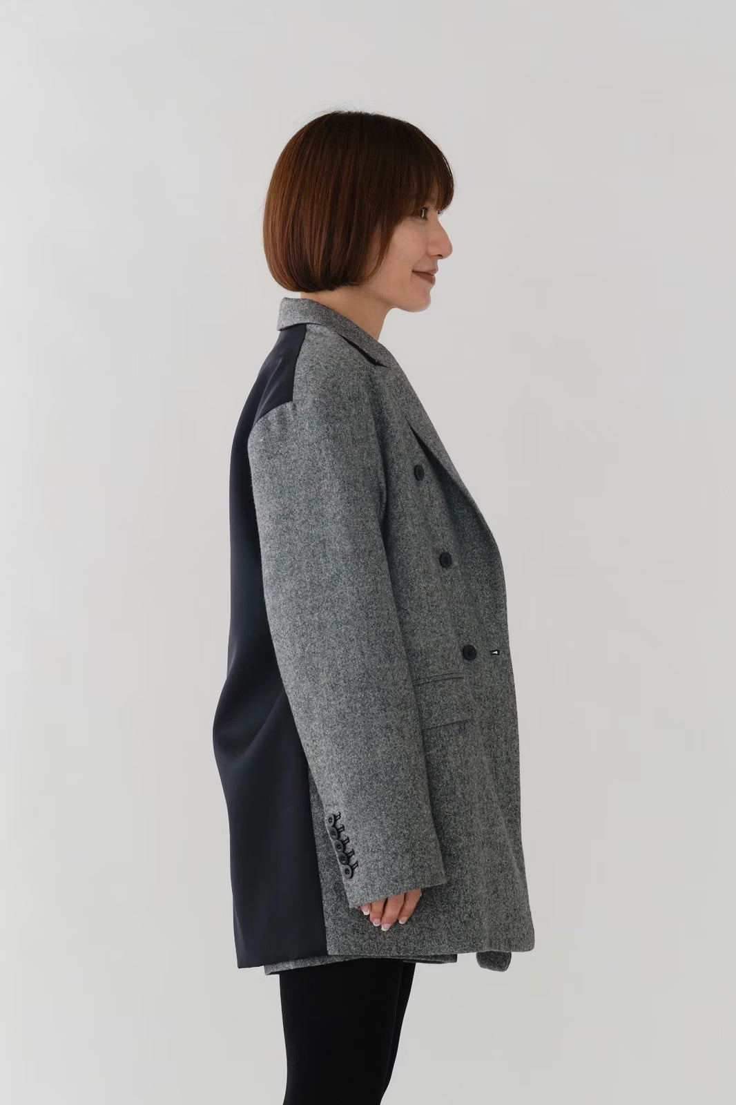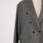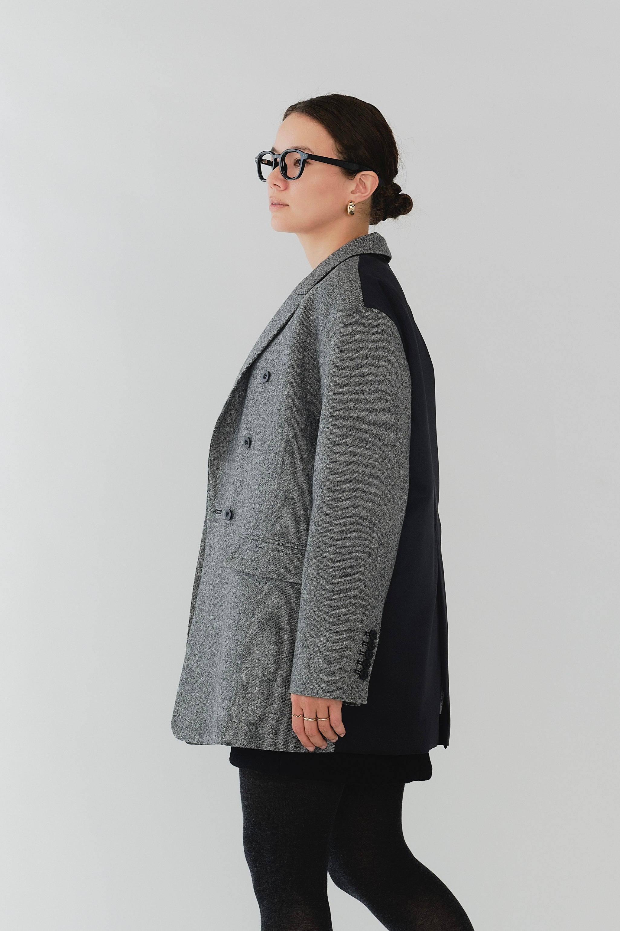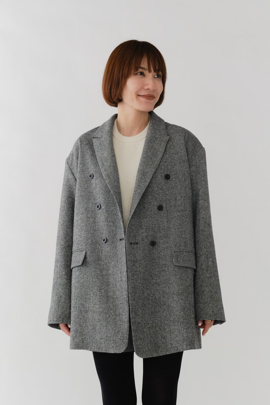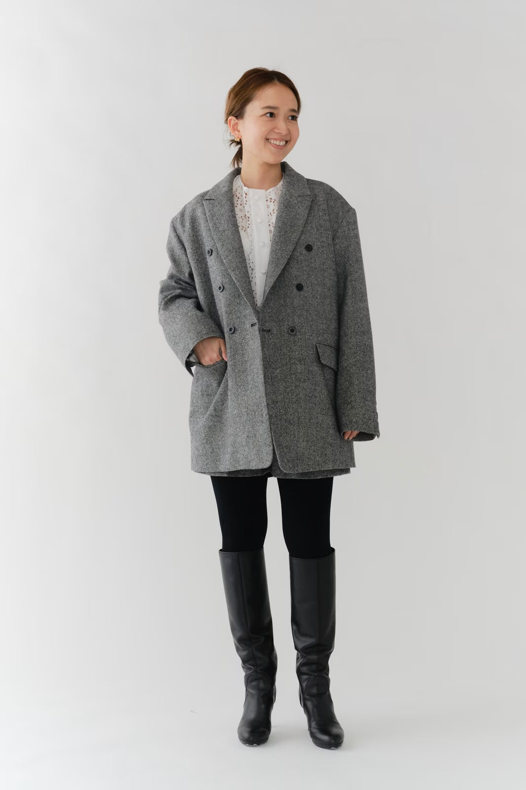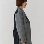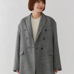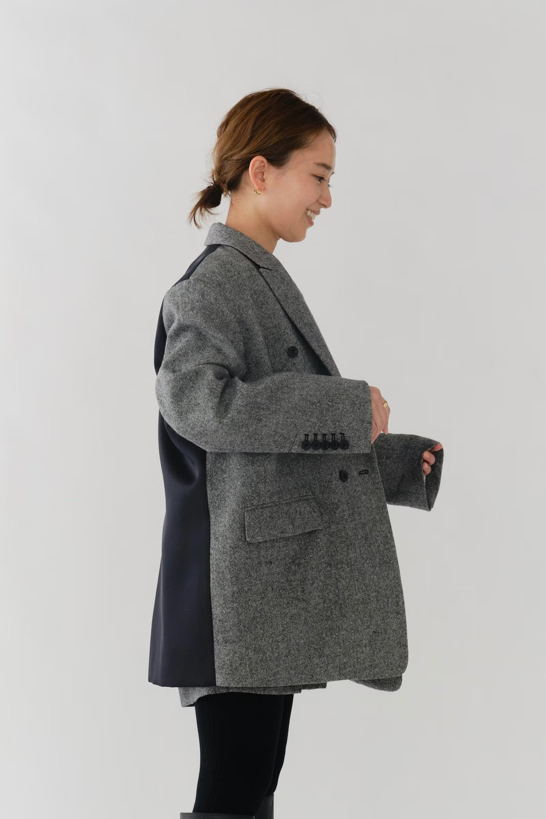 国産のリサイクルポリエステルを選定し、全ての工程を日本国内で行っているリサイクル紡毛素材を使用。クラシックな佇まいに、現代的なエッセンスを取り入れたエコウールツイードジャケット。上質なメンズツイードを思わせる風合いのある生地は、ほどよい厚みと柔らかさを兼ね備えています。フロントには深めのVラインとダブルボタン、ピークドラペルを採用し、凛とした印象に。クラシカルなデザインながらも、女性らしく軽やかに羽織れるビックシルエットに仕上げました。袖口には繊細なボタンを贅沢にあしらい、袖裏にはストライプ柄の裏地を使用。ロールアップ時にも美しさを保ちます。さらに、バックスタイルにはサテン生地を施したベンツを配し、動きのある上品な表情を演出。yoriらしいネームタグモチーフもさりげないアクセントに。タイムレスなデザインと確かな素材感が、日常をワンランクアップさせてくれる一着です。