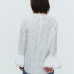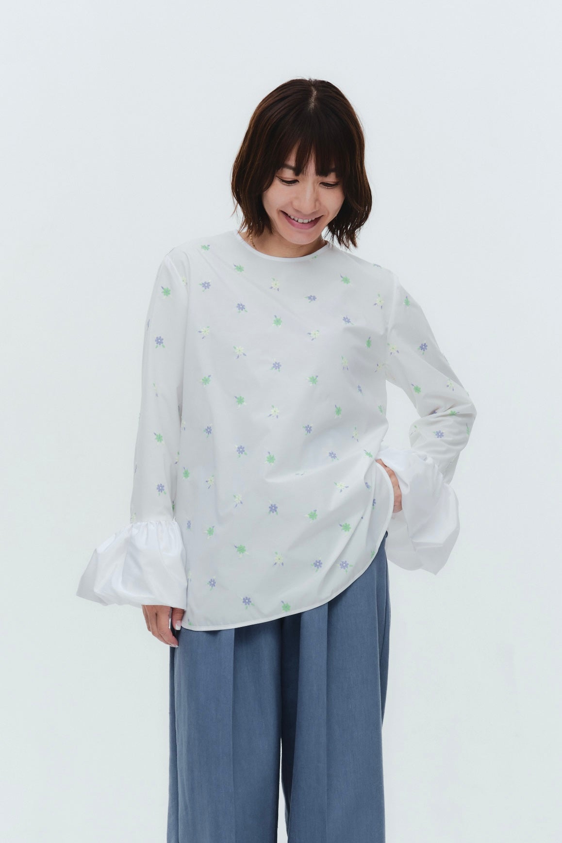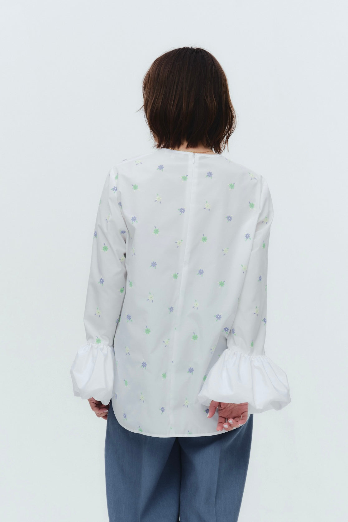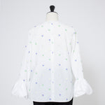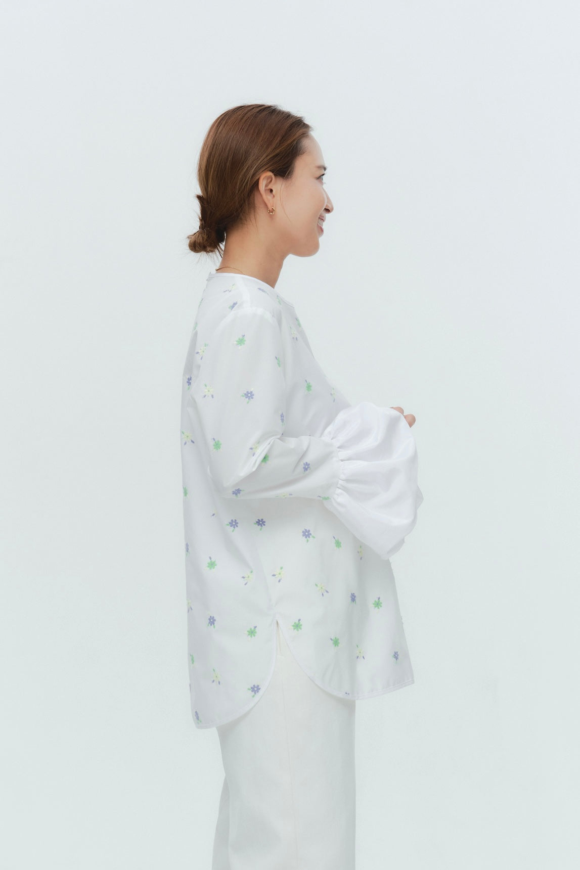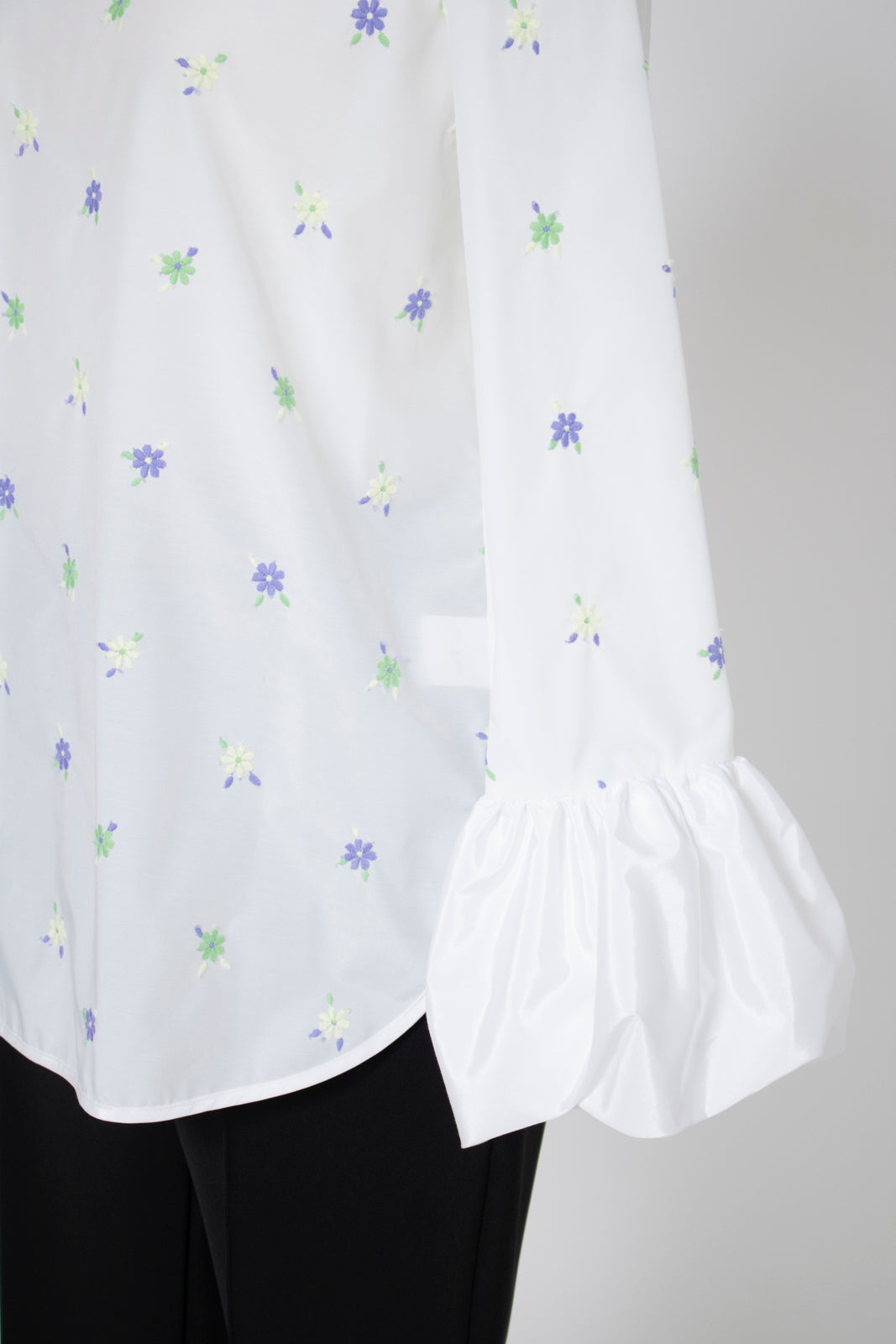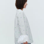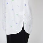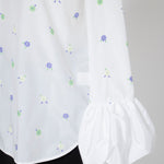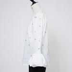 愛らしい花々が咲き誇る<yori>オリジナル生地を使用。繊細で立体的なお花の刺繍が他にはない特別感あふれる一着に。上品な光沢ある生地でより刺繍の可愛らしさを際立たせます。まるでホイップのようなふんわりとしたバルーンカフスで今までにはない新しいシルエットに。ゆるやかにラウンドされた裾のラインでイン/アウトどちらの着こなしも様になります。シワになりにくく、自宅でお手入れしやすいのも嬉しいポイント。ニットと合わせてバルーンカフスをポイントにしたレイヤードスタイルも良し。同生地のロングスカートと合わせておよばれスタイルにもぴったり。デイリーからお出かけまで幅広いシーンでお召しいただけます。