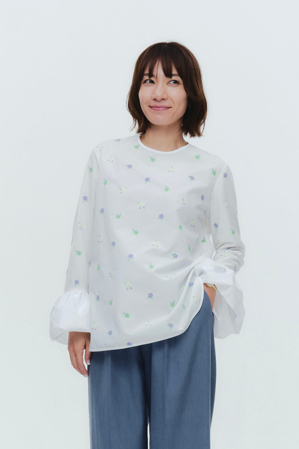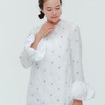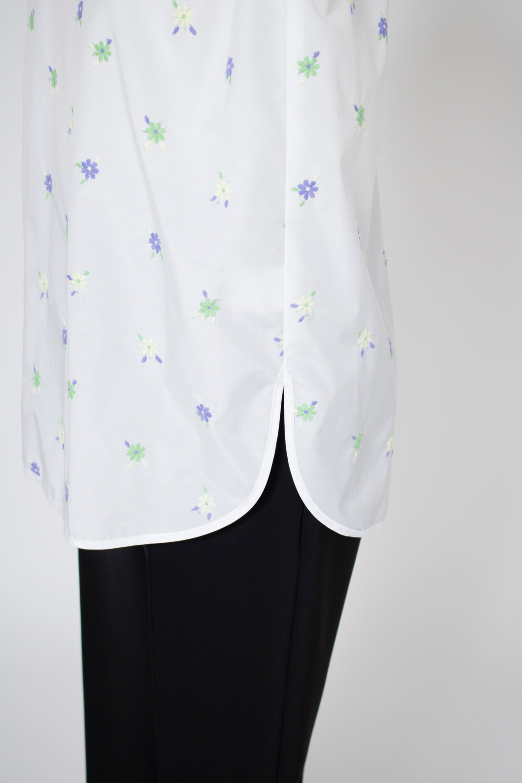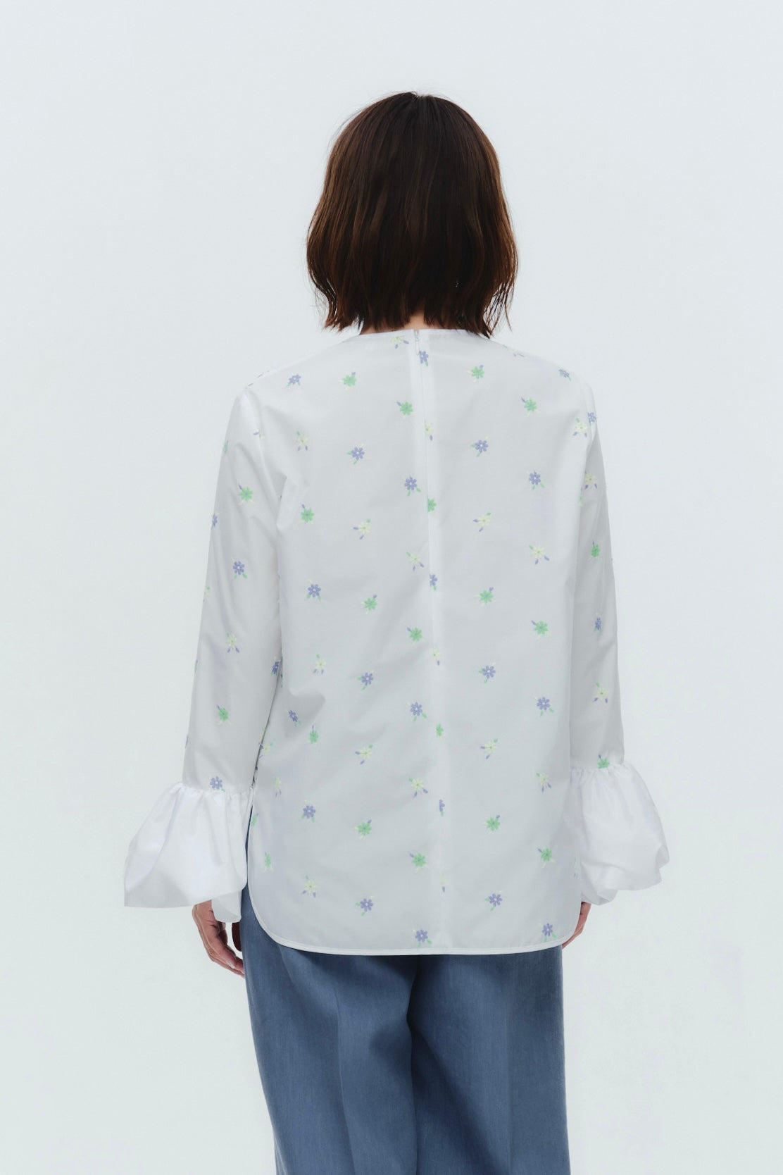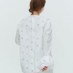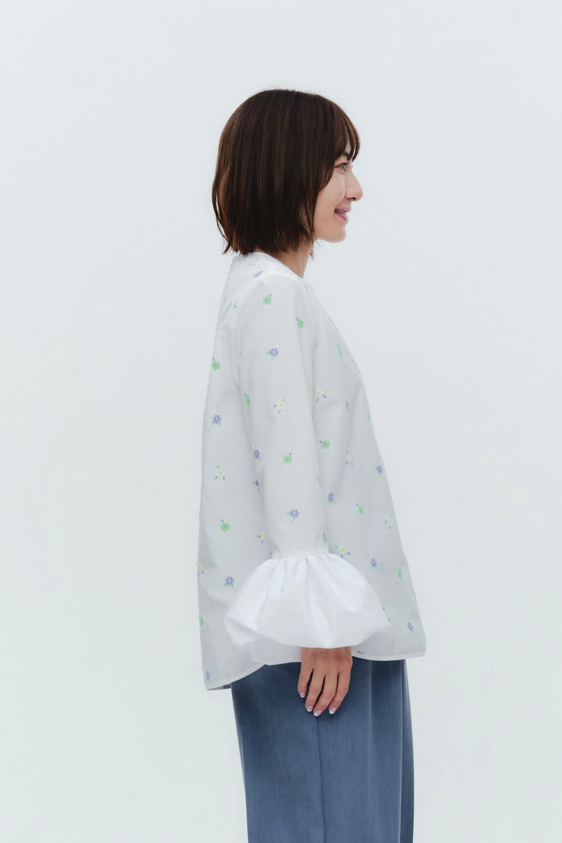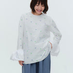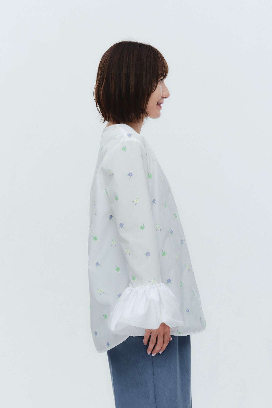 愛らしい花々が咲き誇る<yori>オリジナル生地を使用。繊細で立体的なお花の刺繍が他にはない特別感あふれる一着に。上品な光沢ある生地でより刺繍の可愛らしさを際立たせます。まるでホイップのようなふんわりとしたバルーンカフスで今までにはない新しいシルエットに。ゆるやかにラウンドされた裾のラインでイン/アウトどちらの着こなしも様になります。シワになりにくく、自宅でお手入れしやすいのも嬉しいポイント。ニットと合わせてバルーンカフスをポイントにしたレイヤードスタイルも良し。同生地のロングスカートと合わせておよばれスタイルにもぴったり。デイリーからお出かけまで幅広いシーンでお召しいただけます。