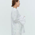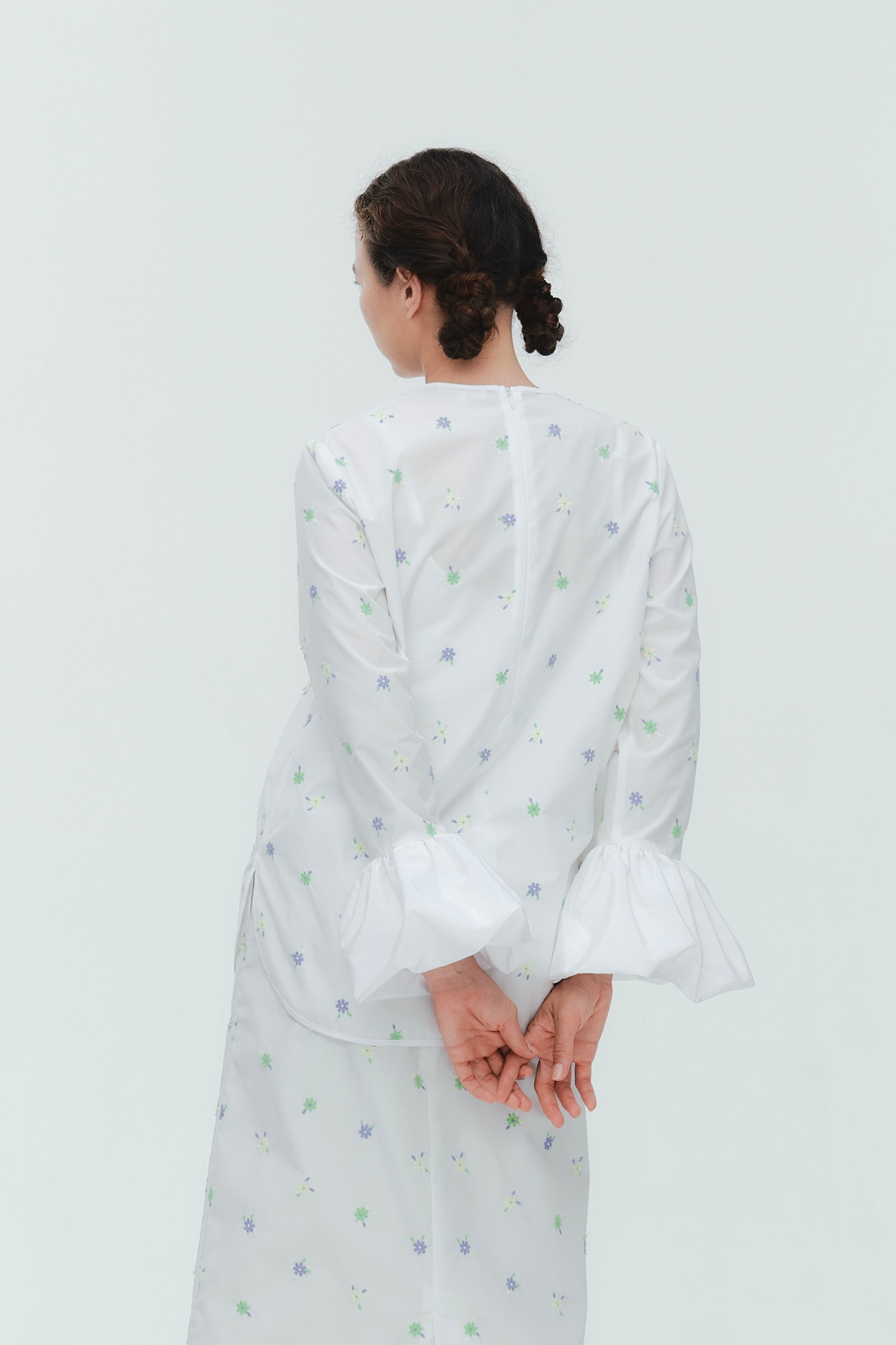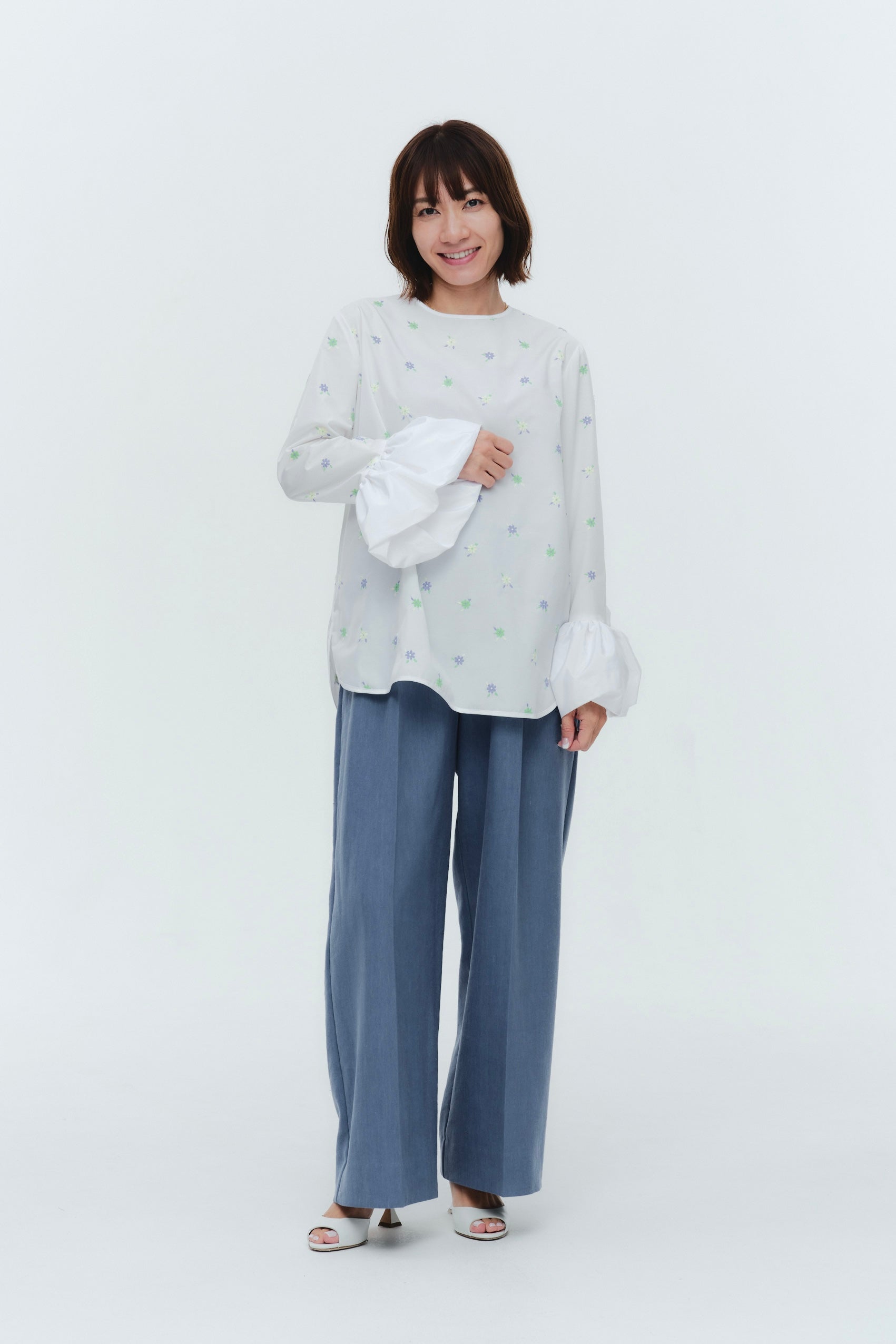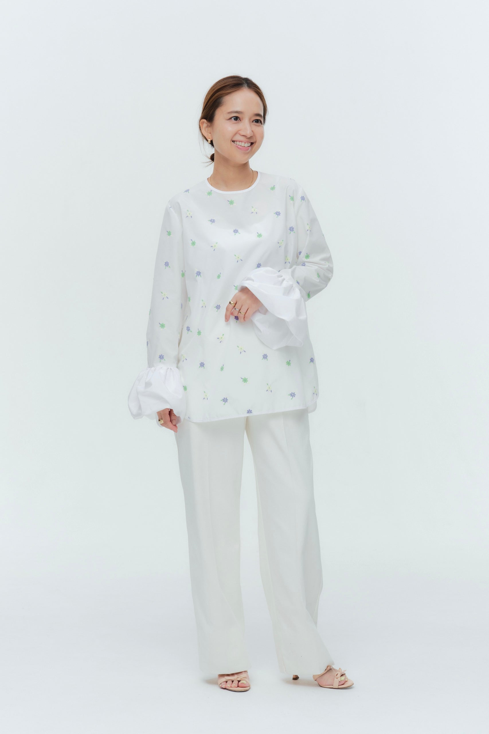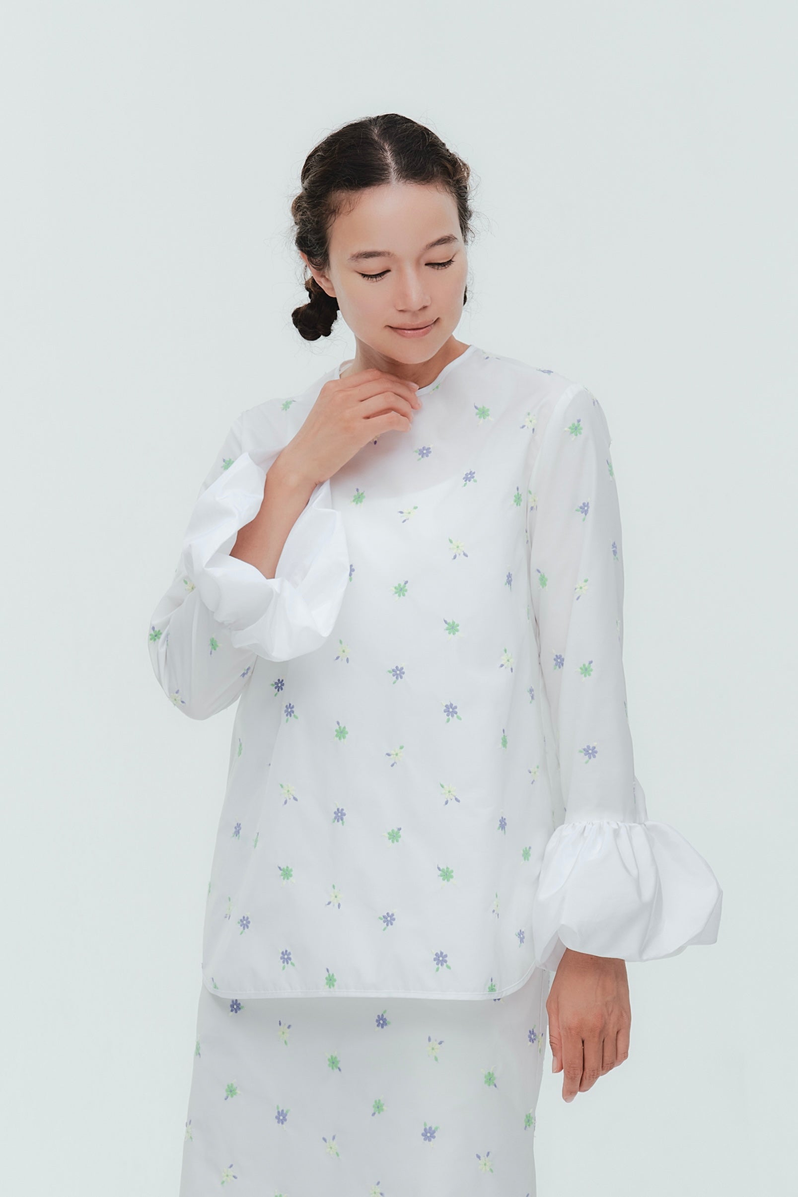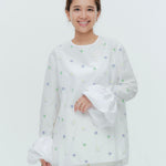 愛らしい花々が咲き誇る<yori>オリジナル生地を使用。繊細で立体的なお花の刺繍が他にはない特別感あふれる一着に。上品な光沢ある生地でより刺繍の可愛らしさを際立たせます。まるでホイップのようなふんわりとしたバルーンカフスで今までにはない新しいシルエットに。ゆるやかにラウンドされた裾のラインでイン/アウトどちらの着こなしも様になります。シワになりにくく、自宅でお手入れしやすいのも嬉しいポイント。ニットと合わせてバルーンカフスをポイントにしたレイヤードスタイルも良し。同生地のロングスカートと合わせておよばれスタイルにもぴったり。デイリーからお出かけまで幅広いシーンでお召しいただけます。