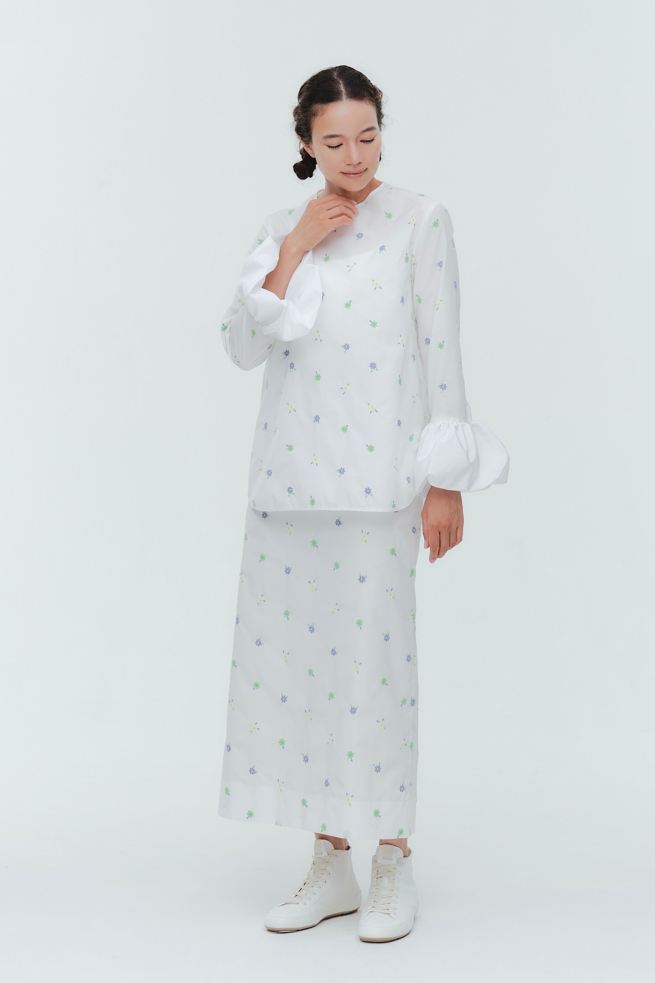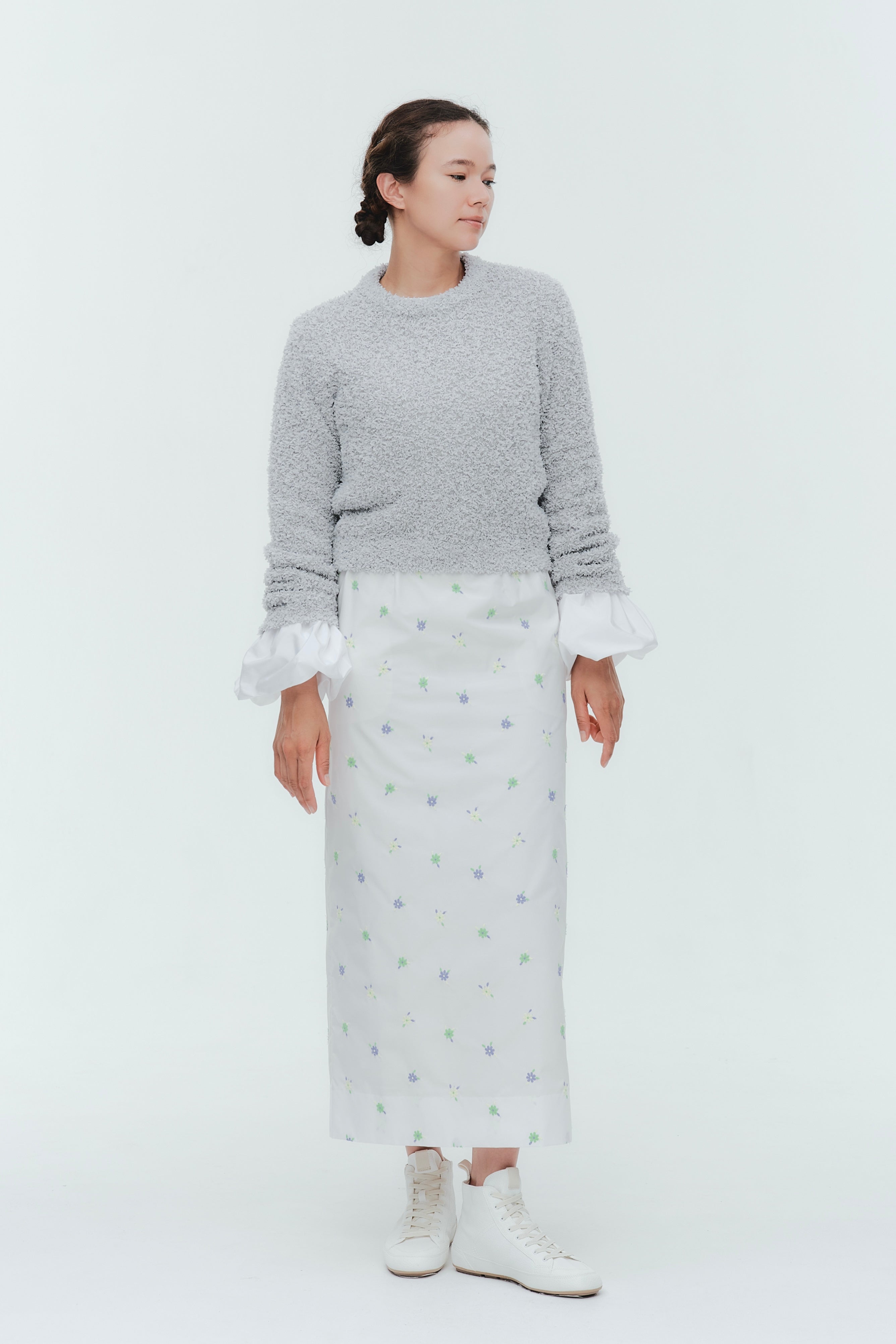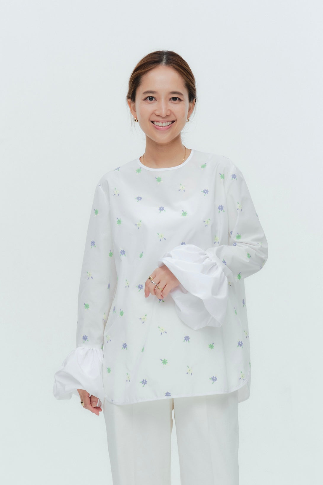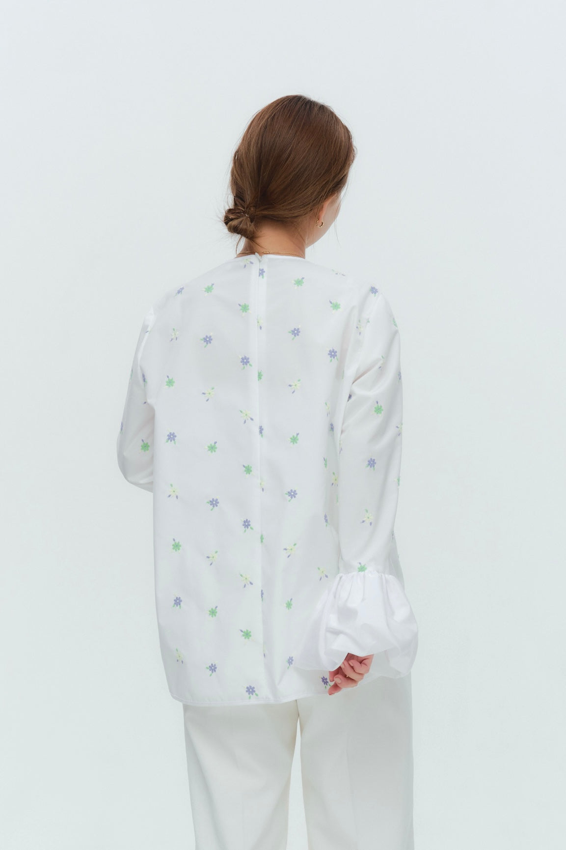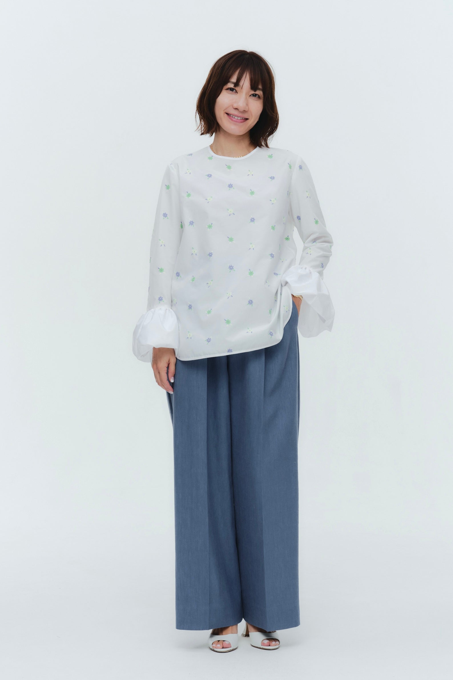 愛らしい花々が咲き誇る<yori>オリジナル生地を使用。繊細で立体的なお花の刺繍が他にはない特別感あふれる一着に。上品な光沢ある生地でより刺繍の可愛らしさを際立たせます。まるでホイップのようなふんわりとしたバルーンカフスで今までにはない新しいシルエットに。ゆるやかにラウンドされた裾のラインでイン/アウトどちらの着こなしも様になります。シワになりにくく、自宅でお手入れしやすいのも嬉しいポイント。ニットと合わせてバルーンカフスをポイントにしたレイヤードスタイルも良し。同生地のロングスカートと合わせておよばれスタイルにもぴったり。デイリーからお出かけまで幅広いシーンでお召しいただけます。