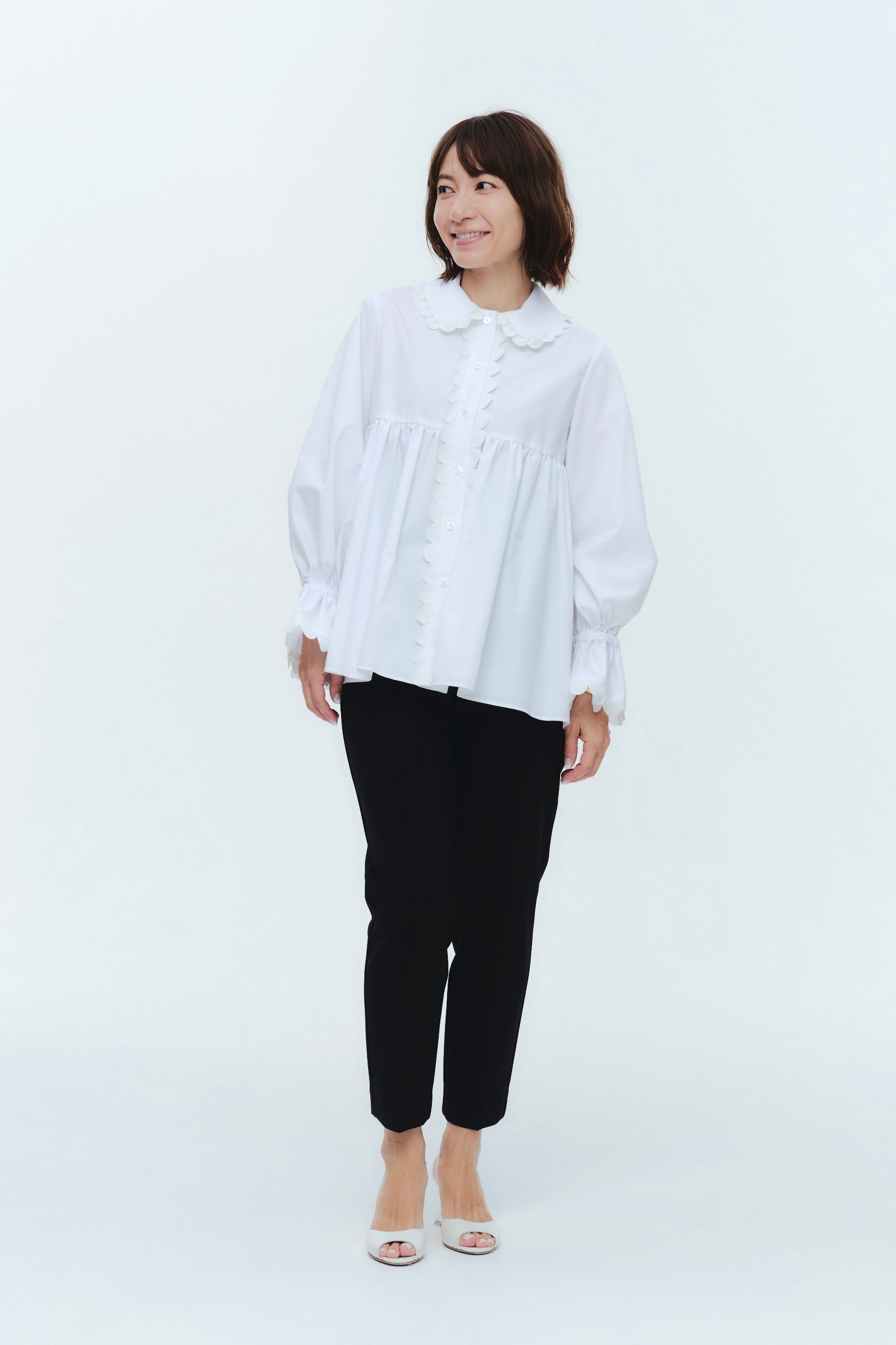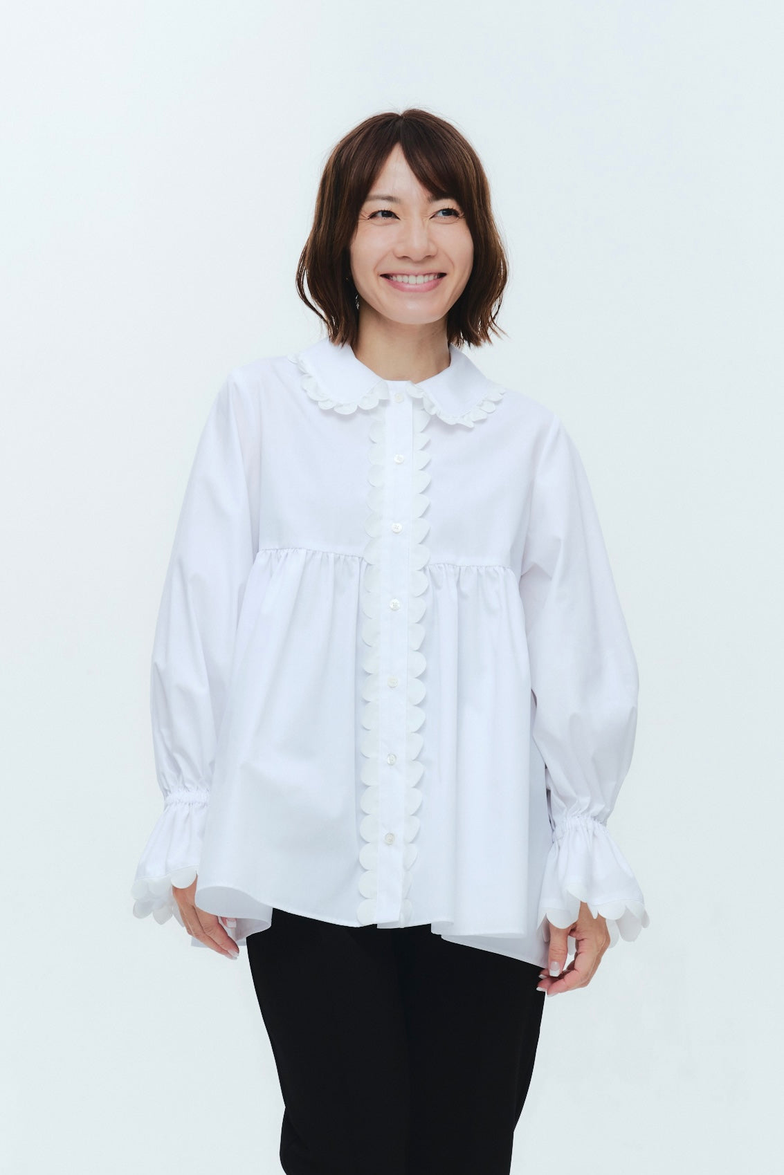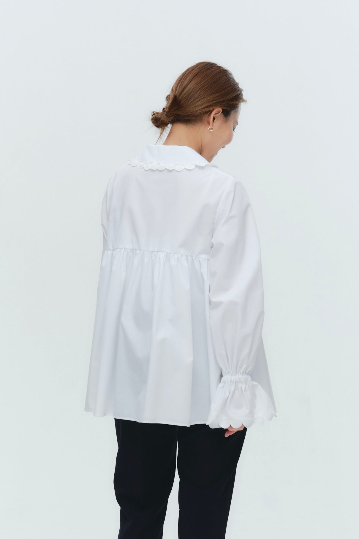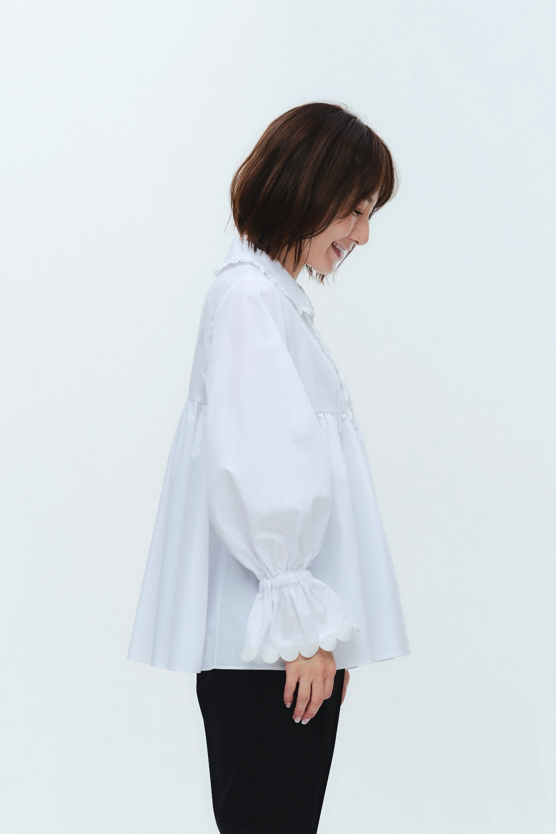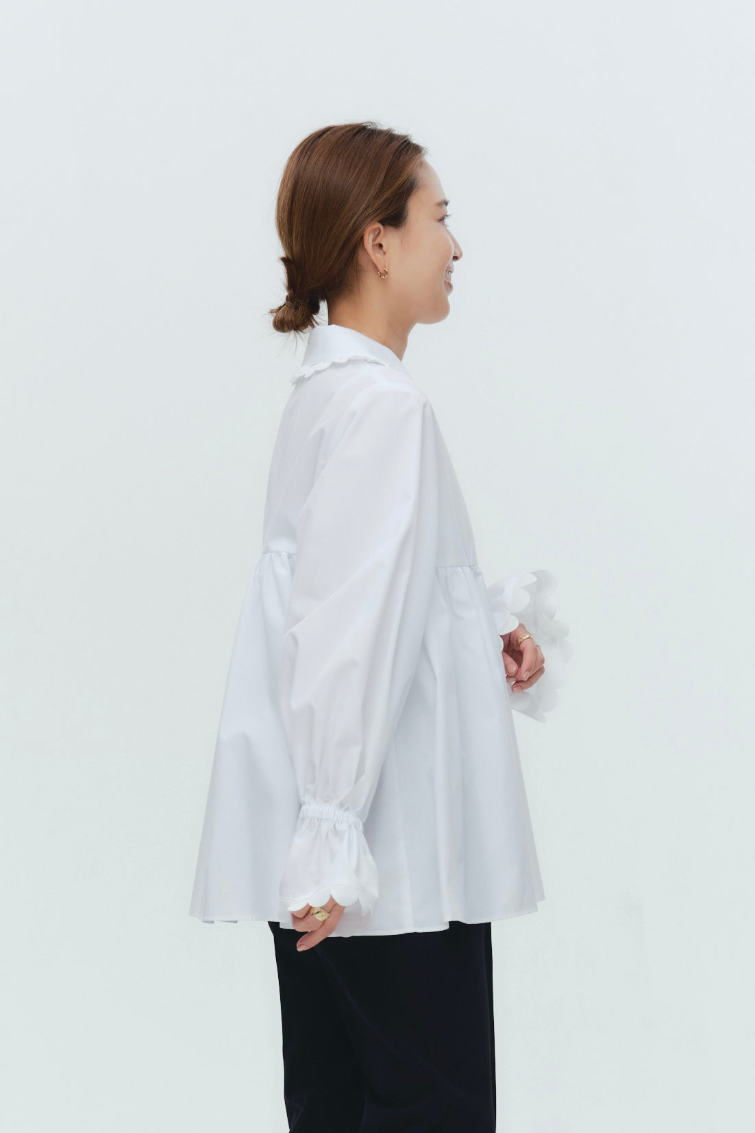 ポリエステル×コットン混紡の高密度な素材を使用。しっかりとしたハリと中肉厚の安心感がありながら、軽やかでふんわりとしたシルエットが楽しめるブラウスです。丸首&丸襟の優しい雰囲気に、襟先と前立て部分には繊細なスカラップ刺繍を施し、フェミニンなディテールをプラス。ボタンにはオリジナルのロゴ入りボタンを使用し、細部までこだわりのある仕上がりに。袖はギャザー入りのパフスリーブで、ゴムギャザーによる程よいボリュームがポイント。アンダーバストにもギャザーを寄せ、横から見たときの立体感あるシルエットがとても魅力的です。ハリ感のある素材だからこそ、ふんわりとした着こなしが叶い、シワにもなりにくいので重ね着やレイヤードスタイルにも最適です。