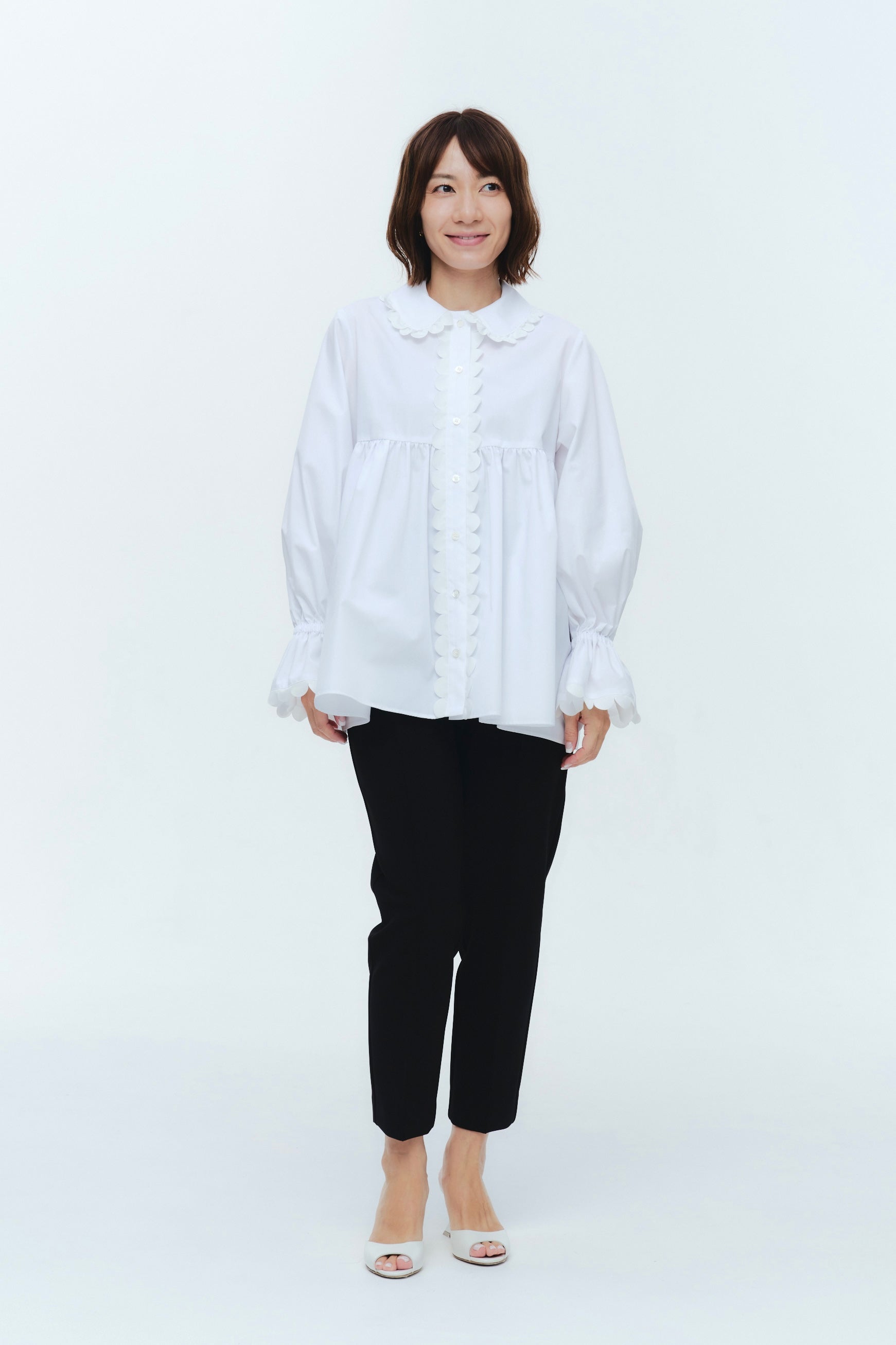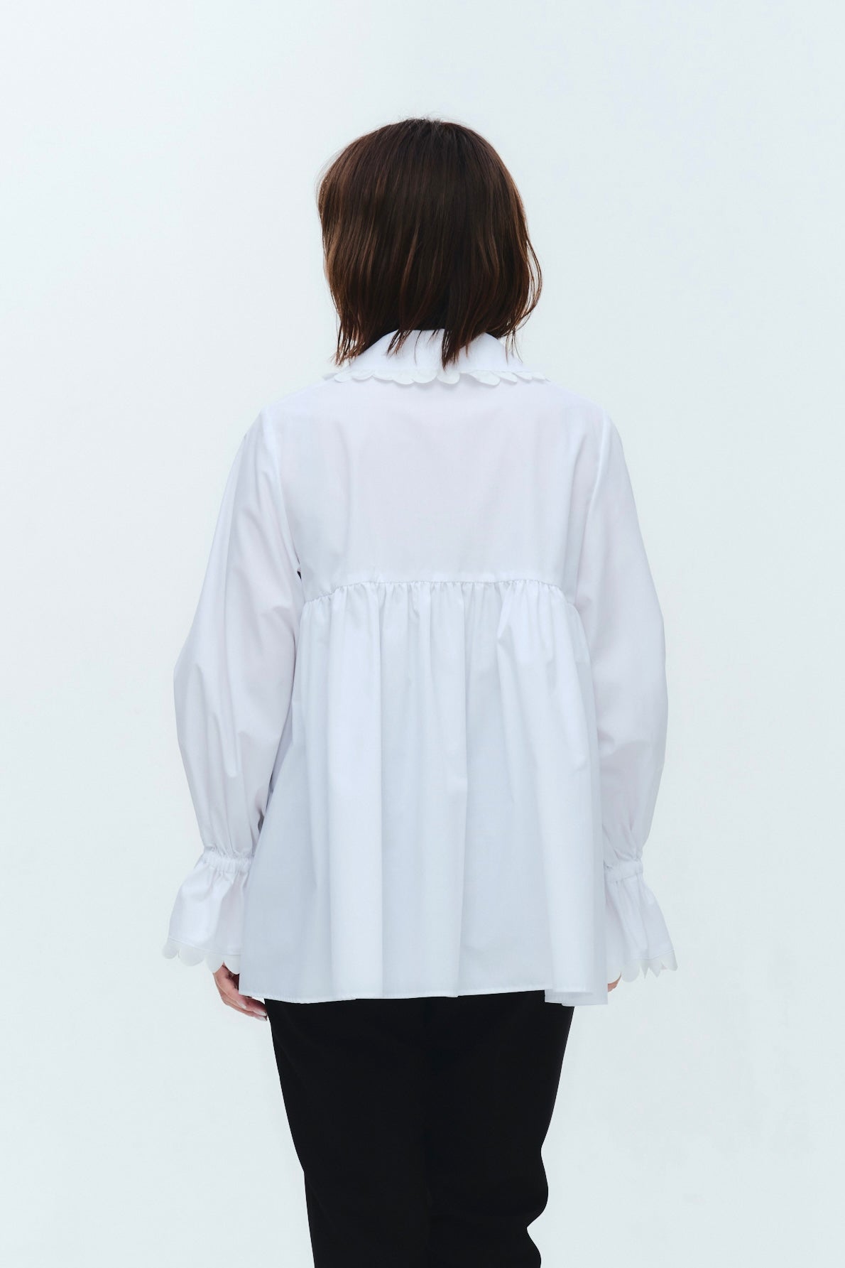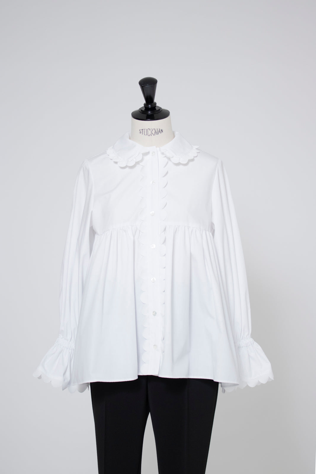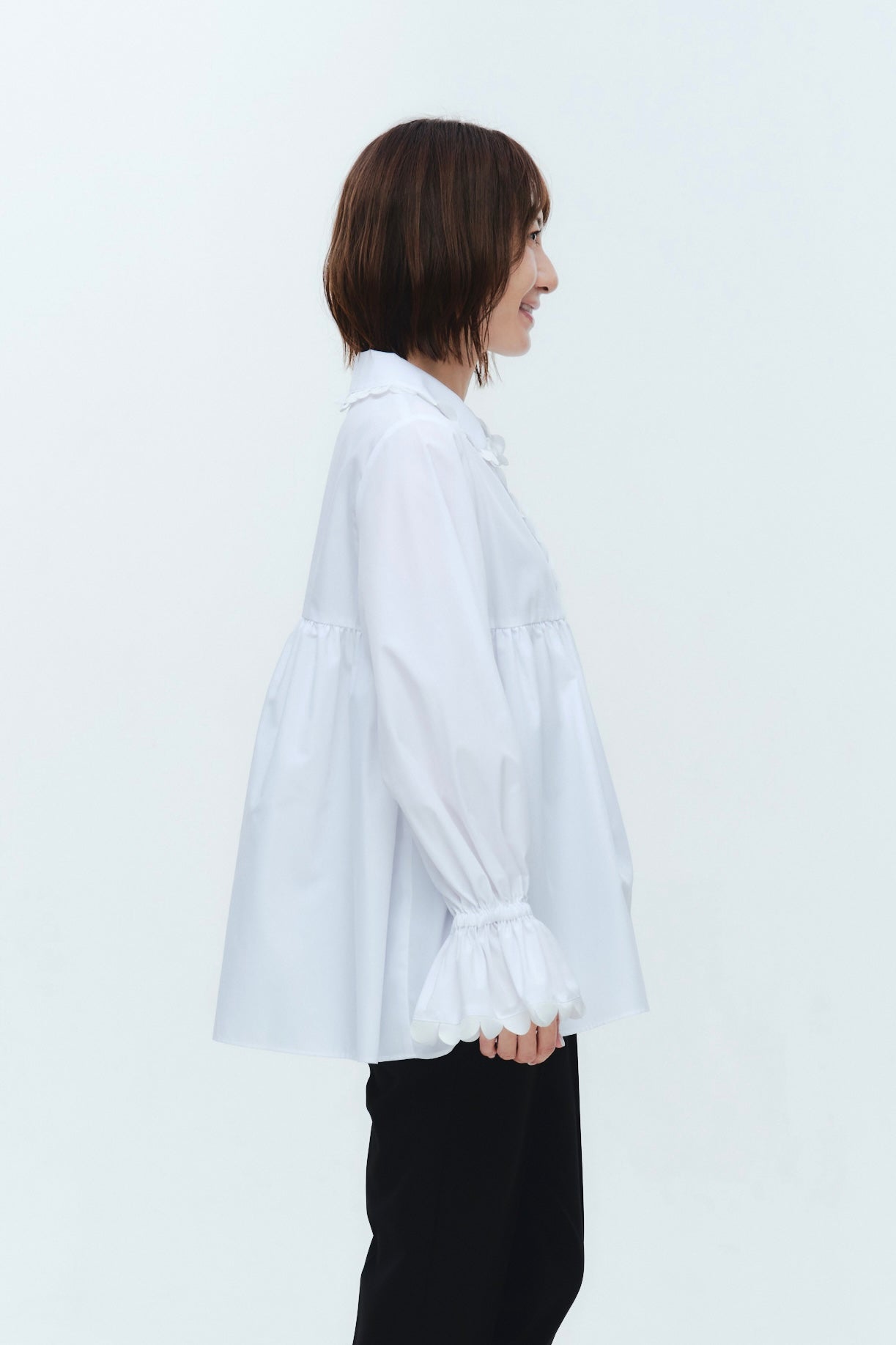 ポリエステル×コットン混紡の高密度な素材を使用。しっかりとしたハリと中肉厚の安心感がありながら、軽やかでふんわりとしたシルエットが楽しめるブラウスです。丸首&丸襟の優しい雰囲気に、襟先と前立て部分には繊細なスカラップ刺繍を施し、フェミニンなディテールをプラス。ボタンにはオリジナルのロゴ入りボタンを使用し、細部までこだわりのある仕上がりに。袖はギャザー入りのパフスリーブで、ゴムギャザーによる程よいボリュームがポイント。アンダーバストにもギャザーを寄せ、横から見たときの立体感あるシルエットがとても魅力的です。ハリ感のある素材だからこそ、ふんわりとした着こなしが叶い、シワにもなりにくいので重ね着やレイヤードスタイルにも最適です。