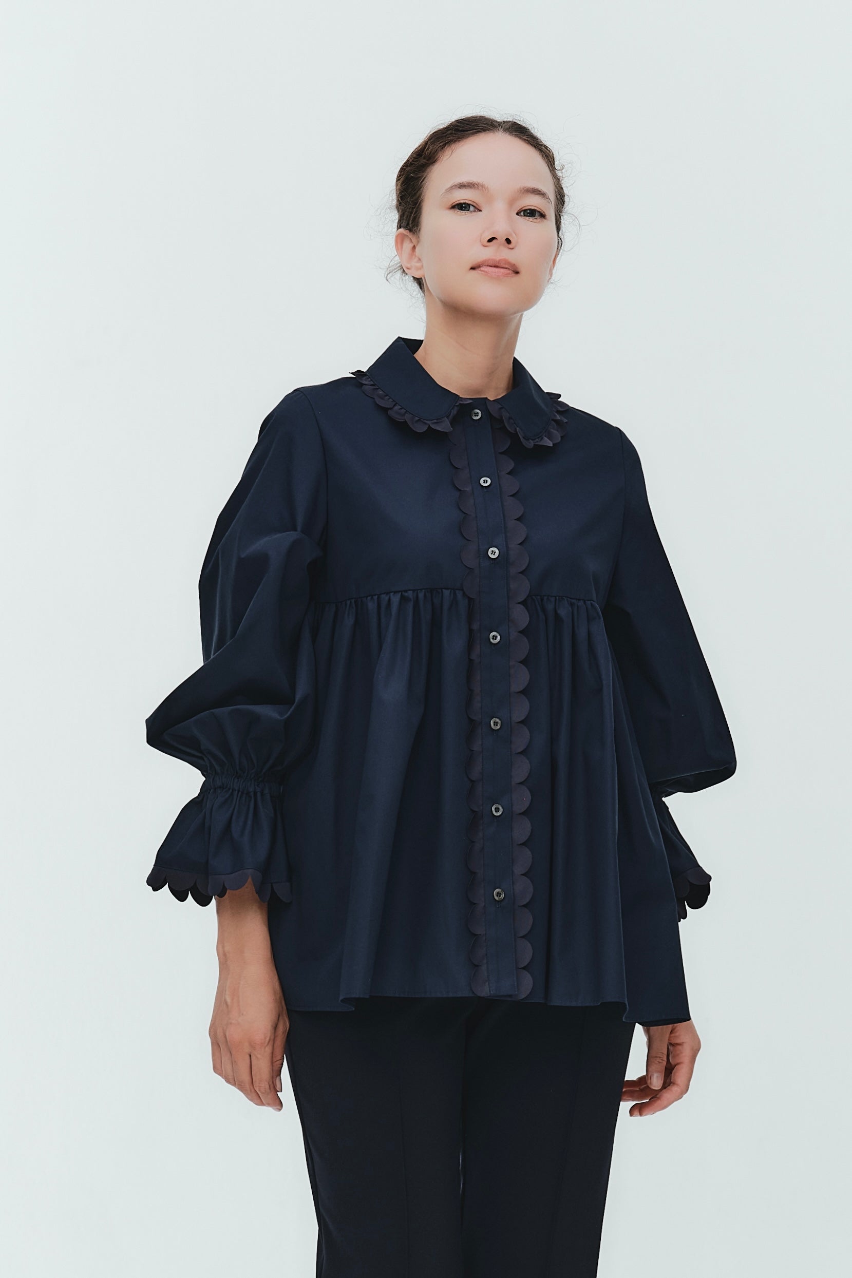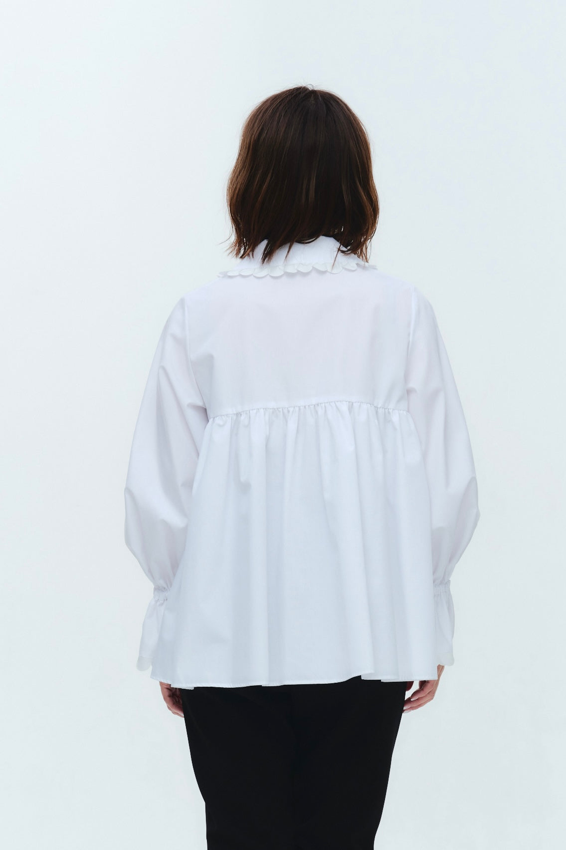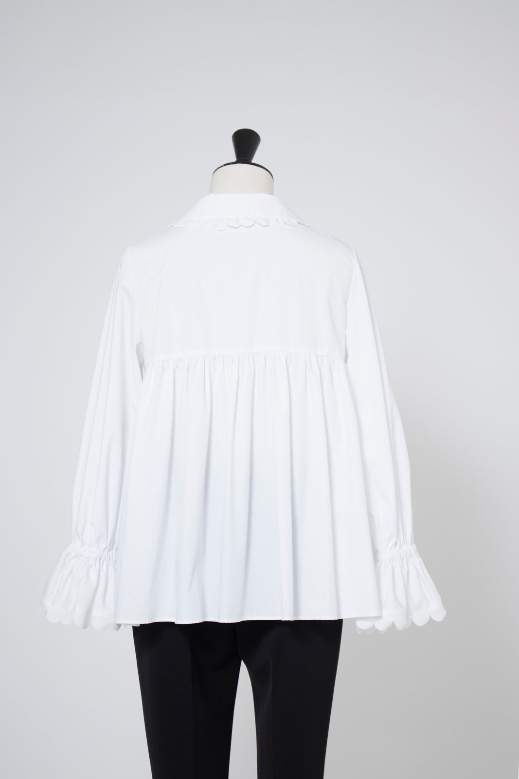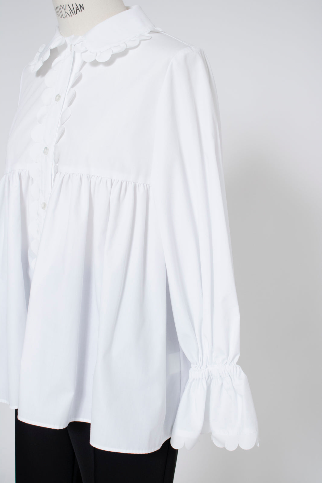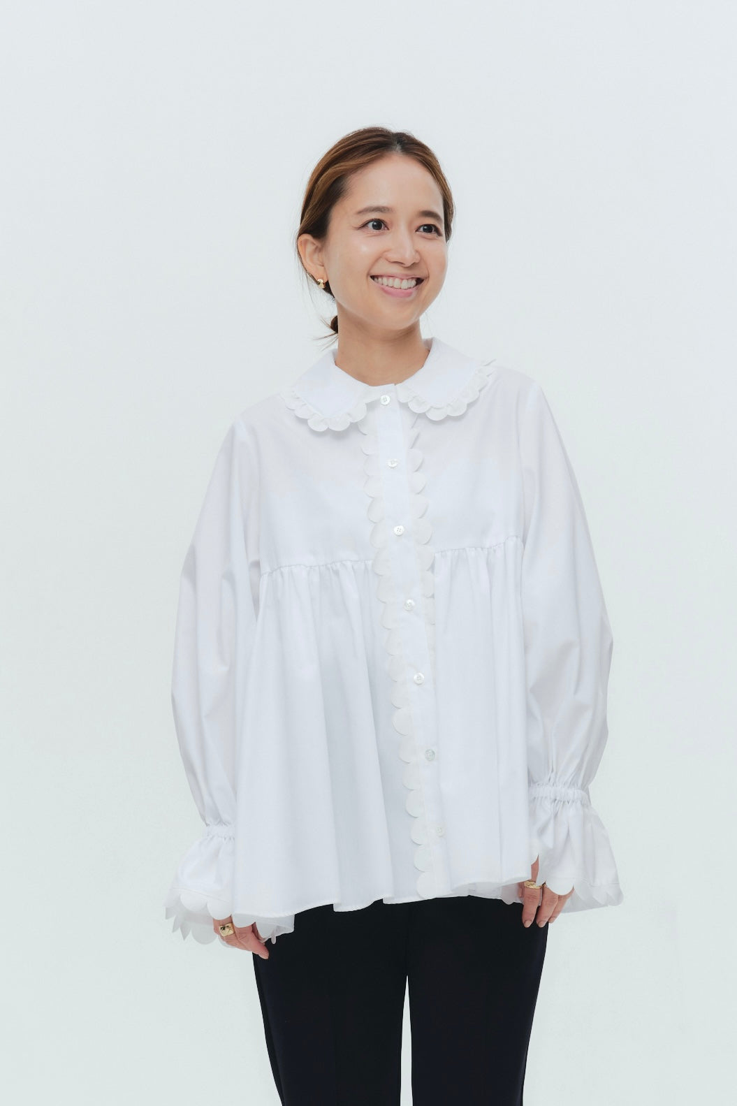 ポリエステル×コットン混紡の高密度な素材を使用。しっかりとしたハリと中肉厚の安心感がありながら、軽やかでふんわりとしたシルエットが楽しめるブラウスです。丸首&丸襟の優しい雰囲気に、襟先と前立て部分には繊細なスカラップ刺繍を施し、フェミニンなディテールをプラス。ボタンにはオリジナルのロゴ入りボタンを使用し、細部までこだわりのある仕上がりに。袖はギャザー入りのパフスリーブで、ゴムギャザーによる程よいボリュームがポイント。アンダーバストにもギャザーを寄せ、横から見たときの立体感あるシルエットがとても魅力的です。ハリ感のある素材だからこそ、ふんわりとした着こなしが叶い、シワにもなりにくいので重ね着やレイヤードスタイルにも最適です。