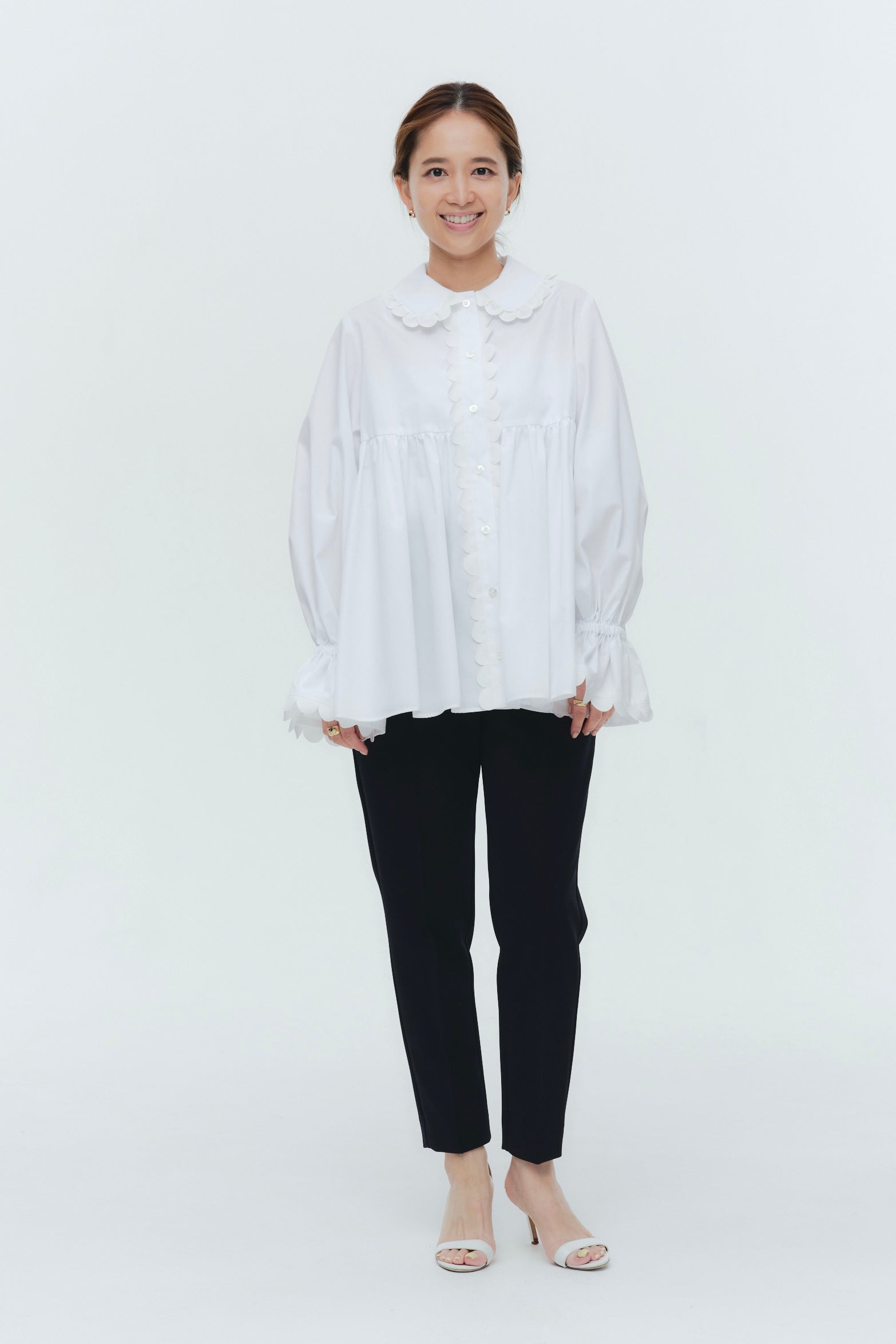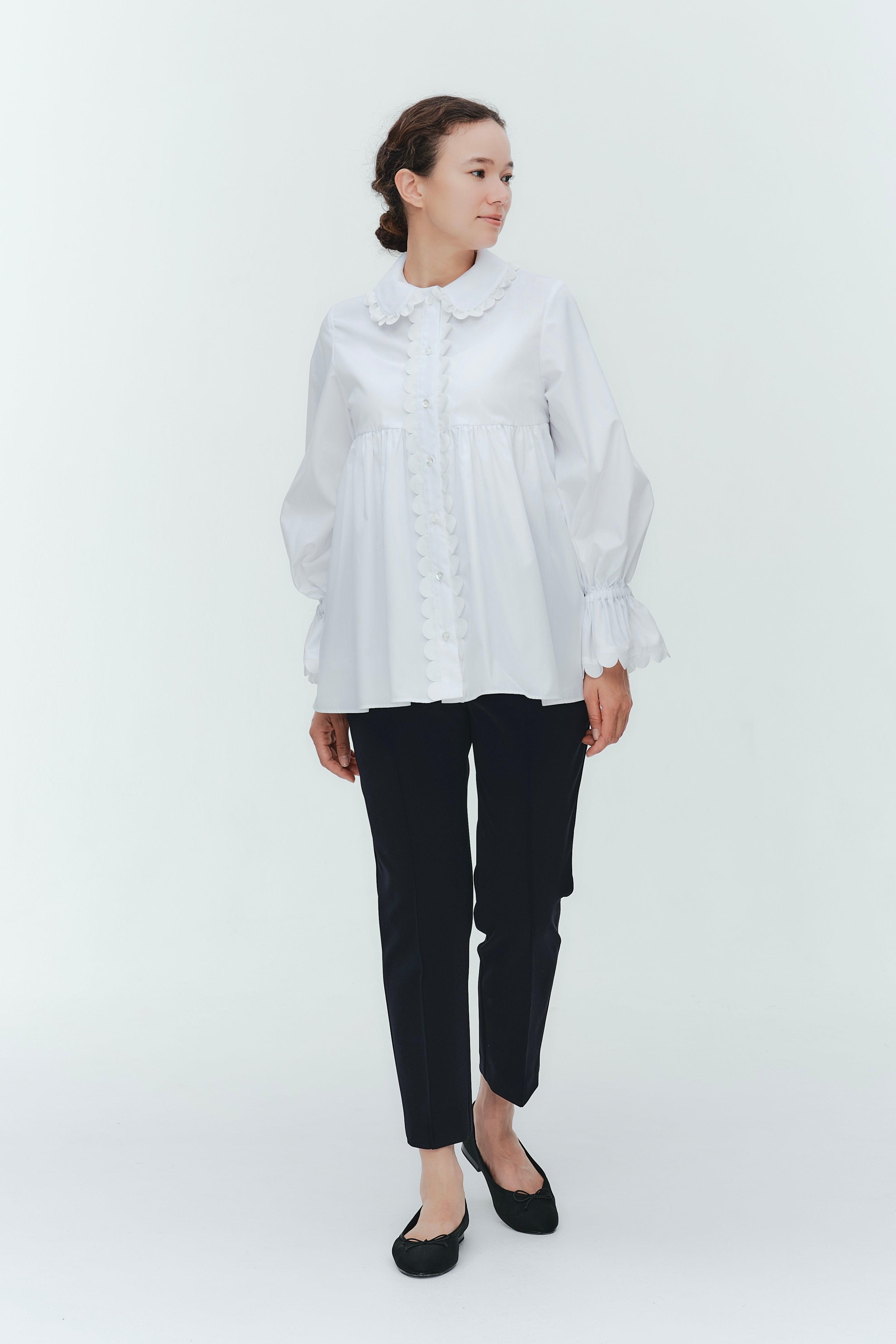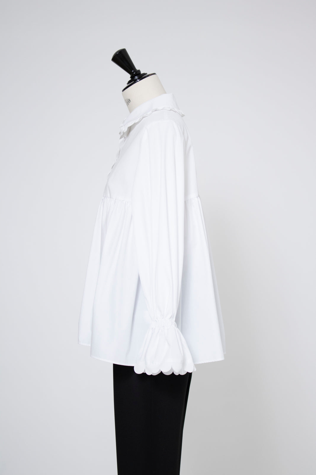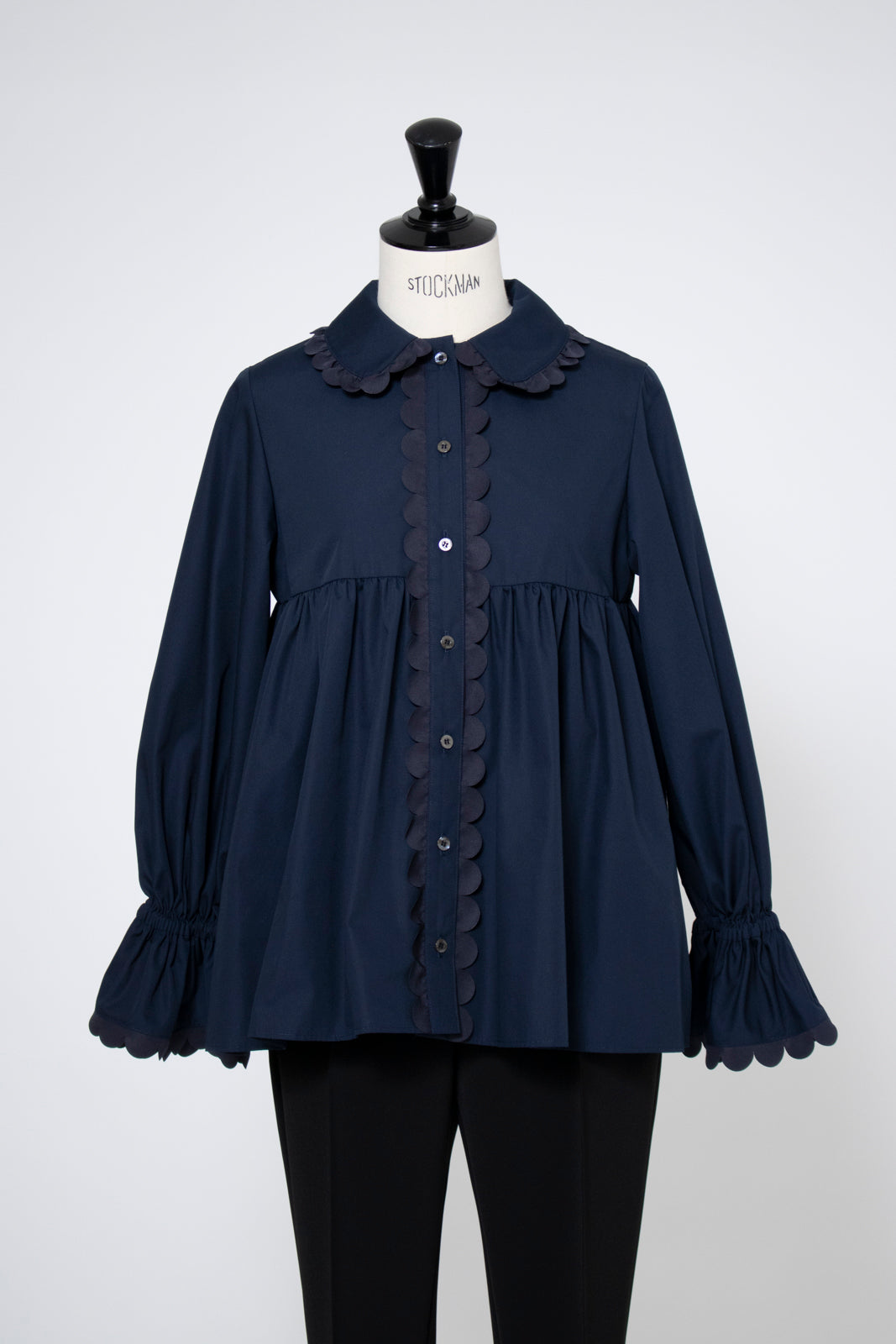 ポリエステル×コットン混紡の高密度な素材を使用。しっかりとしたハリと中肉厚の安心感がありながら、軽やかでふんわりとしたシルエットが楽しめるブラウスです。丸首&丸襟の優しい雰囲気に、襟先と前立て部分には繊細なスカラップ刺繍を施し、フェミニンなディテールをプラス。ボタンにはオリジナルのロゴ入りボタンを使用し、細部までこだわりのある仕上がりに。袖はギャザー入りのパフスリーブで、ゴムギャザーによる程よいボリュームがポイント。アンダーバストにもギャザーを寄せ、横から見たときの立体感あるシルエットがとても魅力的です。ハリ感のある素材だからこそ、ふんわりとした着こなしが叶い、シワにもなりにくいので重ね着やレイヤードスタイルにも最適です。