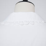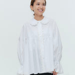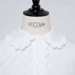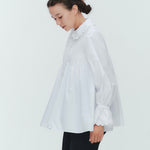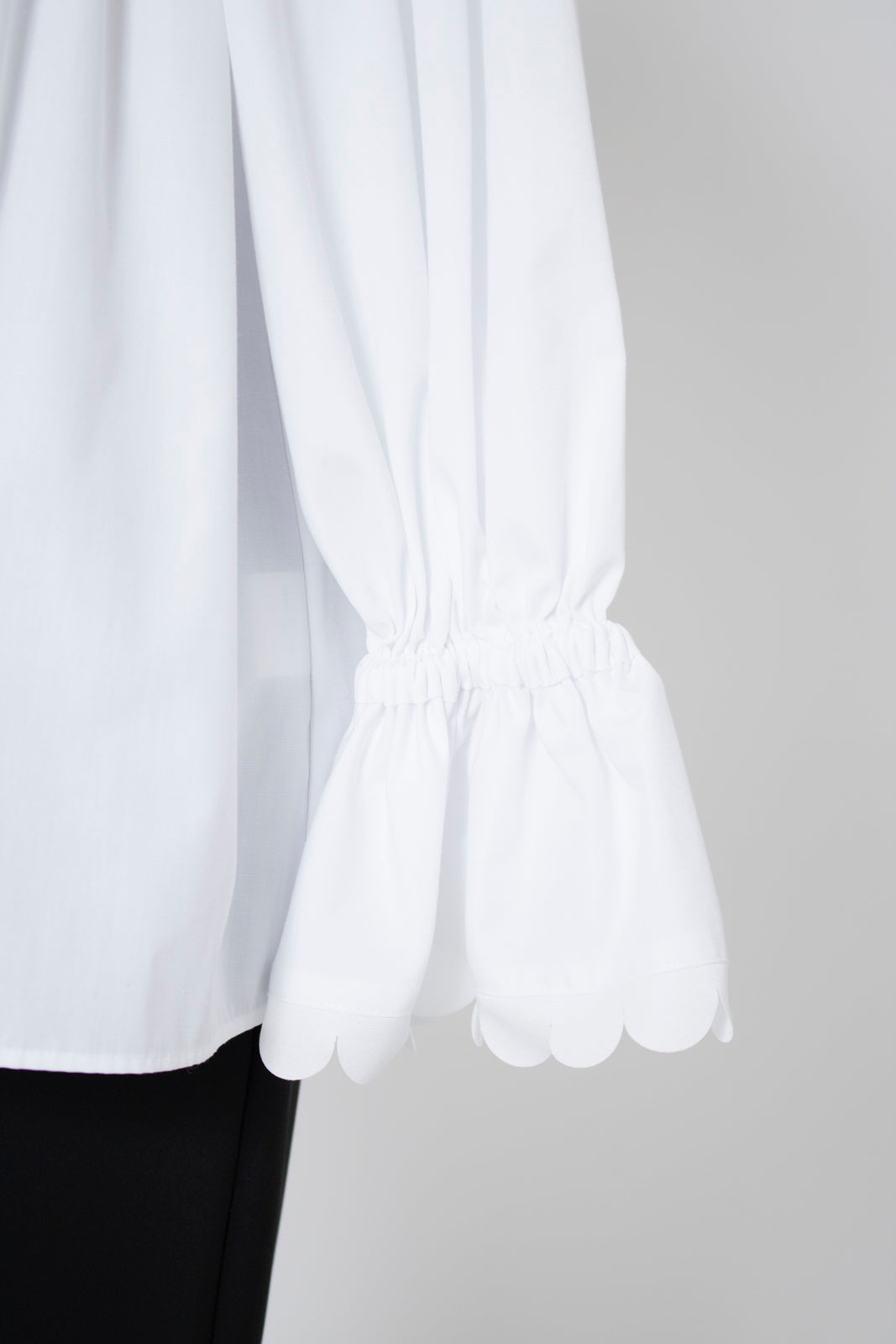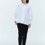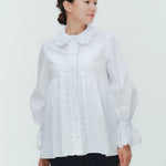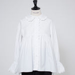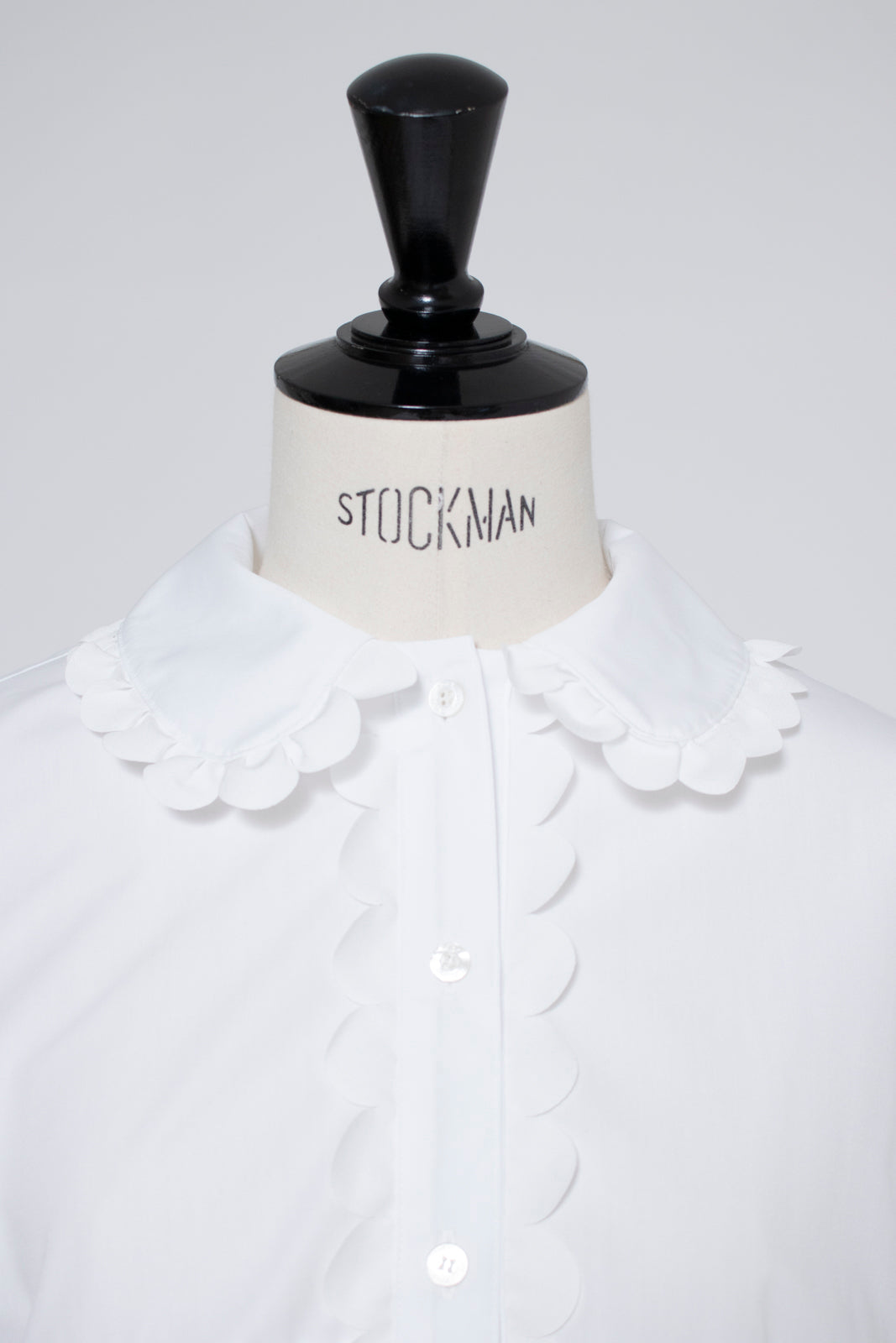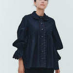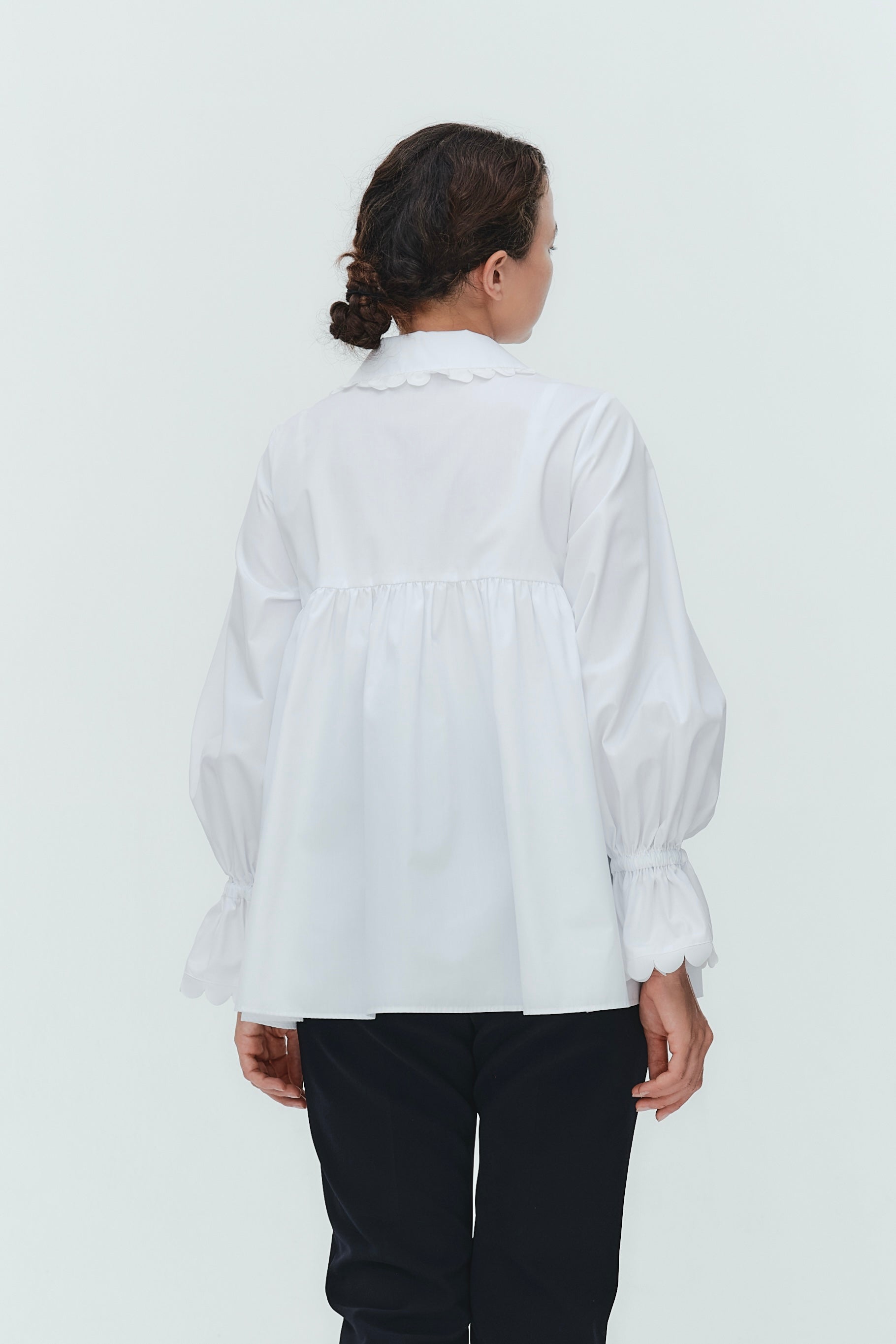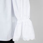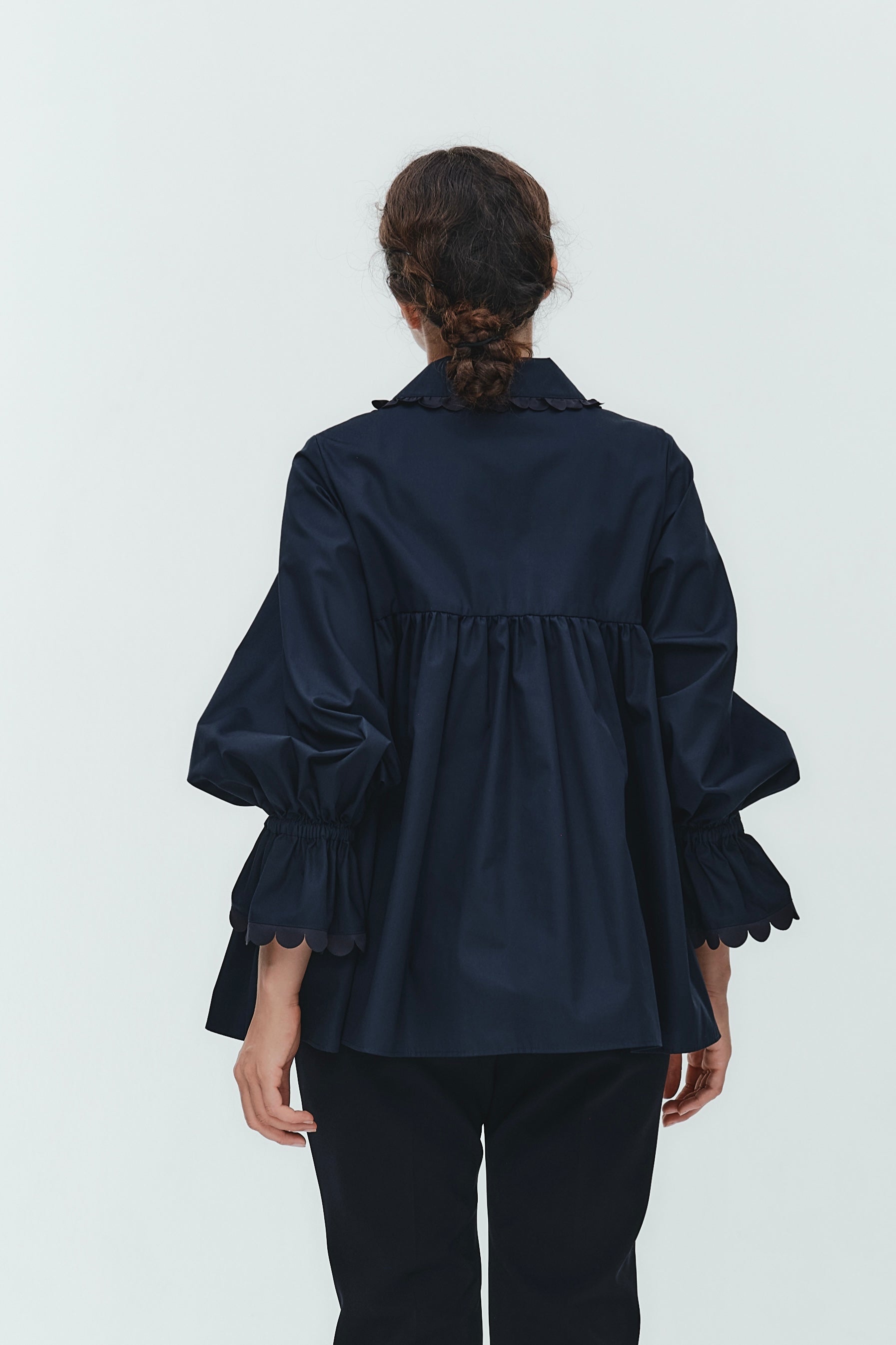 ポリエステル×コットン混紡の高密度な素材を使用。しっかりとしたハリと中肉厚の安心感がありながら、軽やかでふんわりとしたシルエットが楽しめるブラウスです。丸首&丸襟の優しい雰囲気に、襟先と前立て部分には繊細なスカラップ刺繍を施し、フェミニンなディテールをプラス。ボタンにはオリジナルのロゴ入りボタンを使用し、細部までこだわりのある仕上がりに。袖はギャザー入りのパフスリーブで、ゴムギャザーによる程よいボリュームがポイント。アンダーバストにもギャザーを寄せ、横から見たときの立体感あるシルエットがとても魅力的です。ハリ感のある素材だからこそ、ふんわりとした着こなしが叶い、シワにもなりにくいので重ね着やレイヤードスタイルにも最適です。