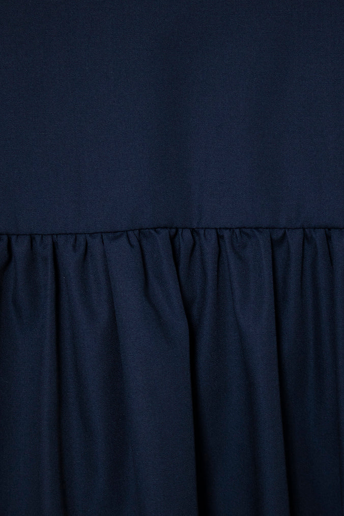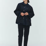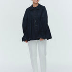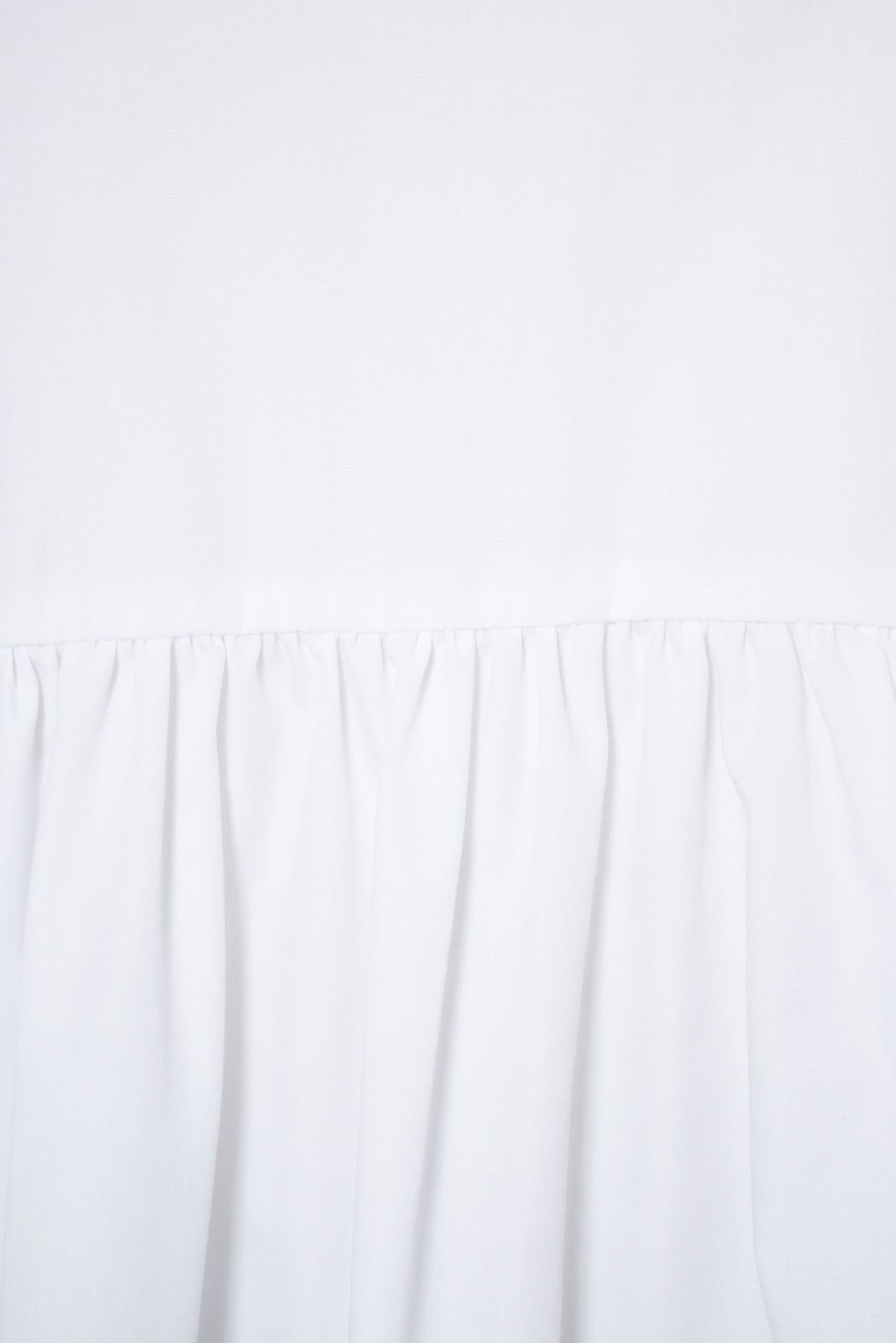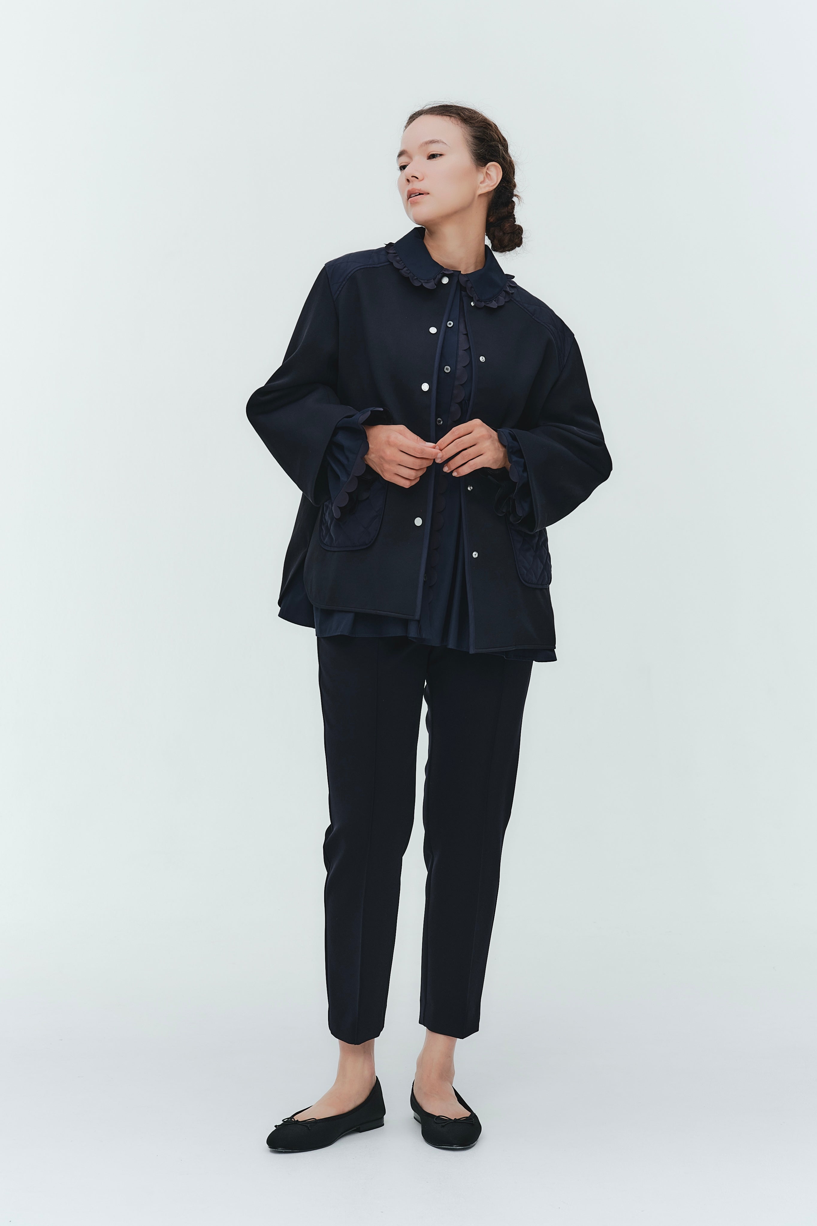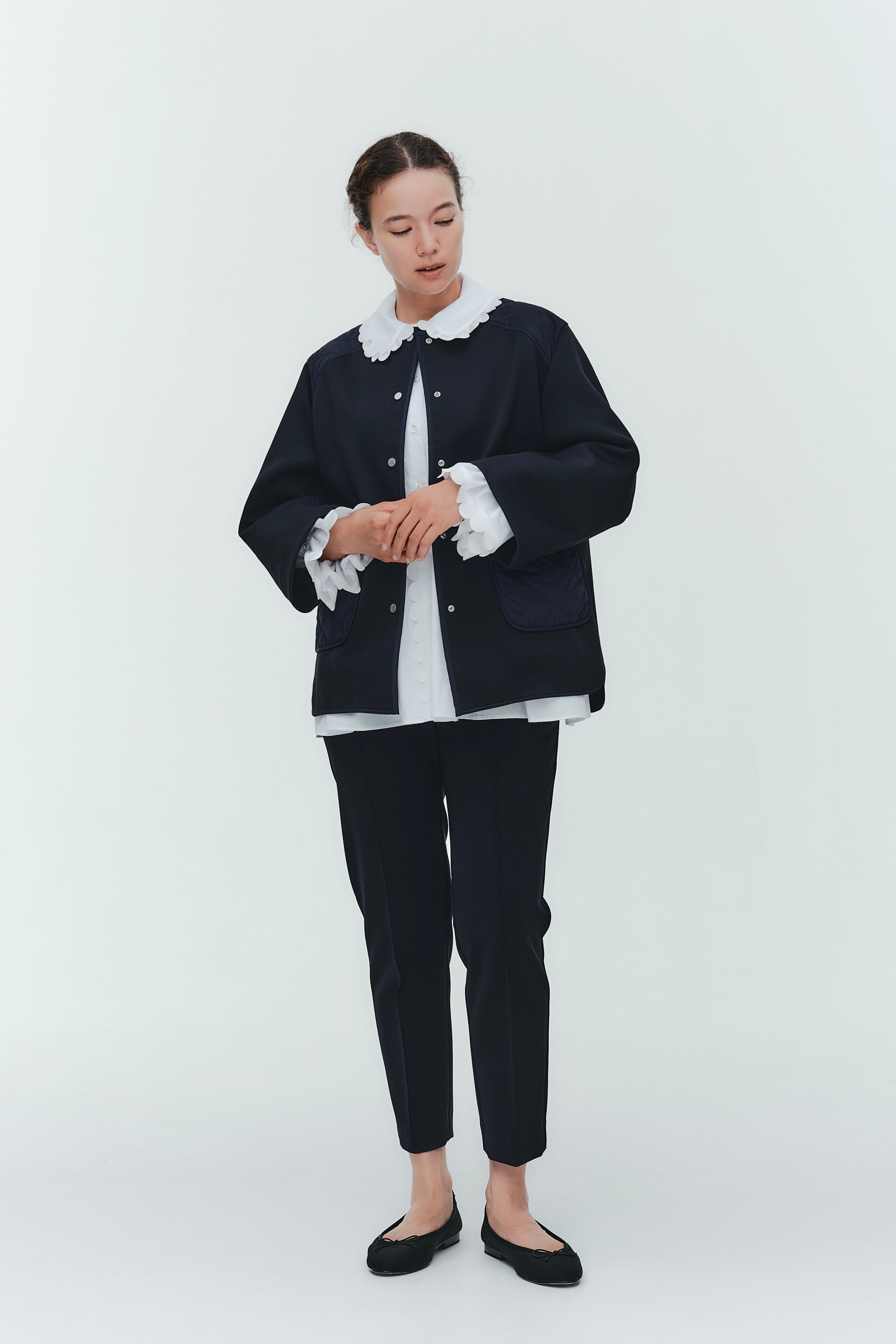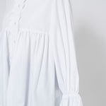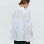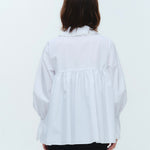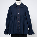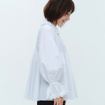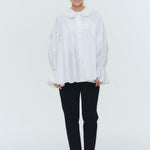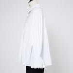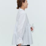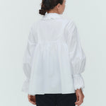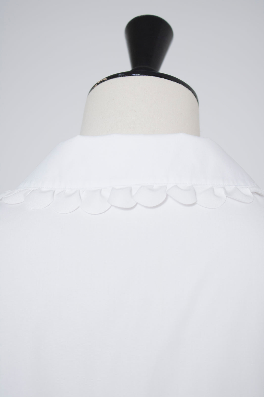 ポリエステル×コットン混紡の高密度な素材を使用。しっかりとしたハリと中肉厚の安心感がありながら、軽やかでふんわりとしたシルエットが楽しめるブラウスです。丸首&丸襟の優しい雰囲気に、襟先と前立て部分には繊細なスカラップ刺繍を施し、フェミニンなディテールをプラス。ボタンにはオリジナルのロゴ入りボタンを使用し、細部までこだわりのある仕上がりに。袖はギャザー入りのパフスリーブで、ゴムギャザーによる程よいボリュームがポイント。アンダーバストにもギャザーを寄せ、横から見たときの立体感あるシルエットがとても魅力的です。ハリ感のある素材だからこそ、ふんわりとした着こなしが叶い、シワにもなりにくいので重ね着やレイヤードスタイルにも最適です。