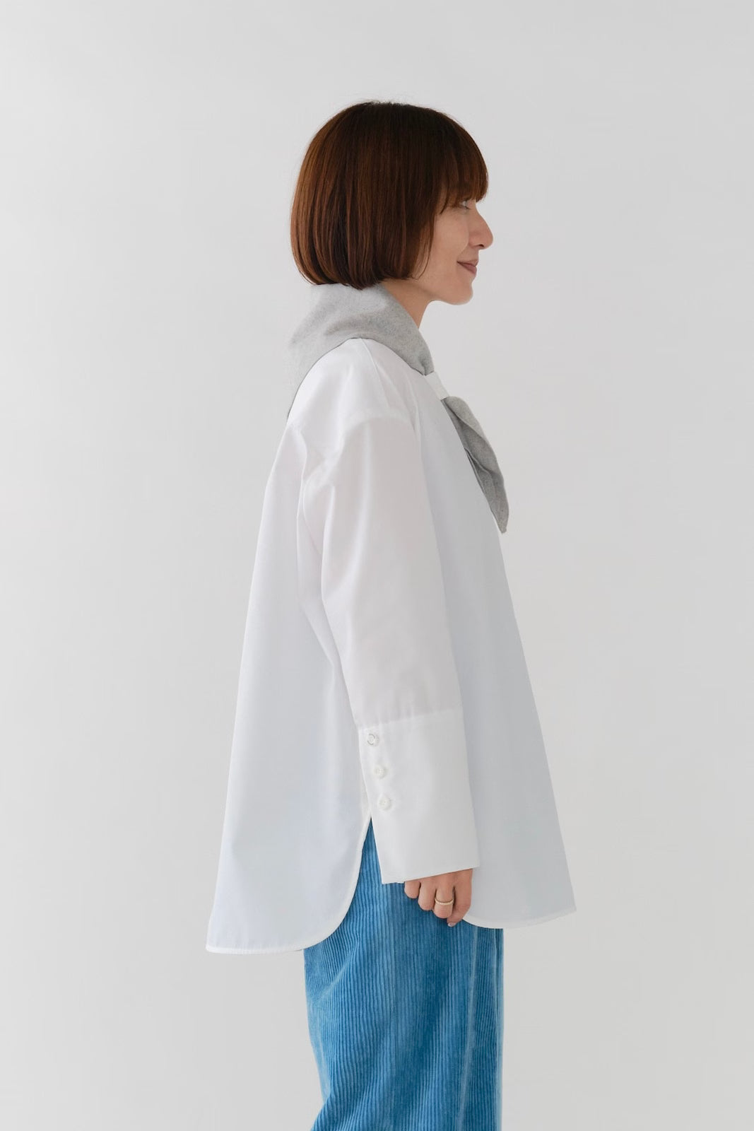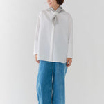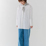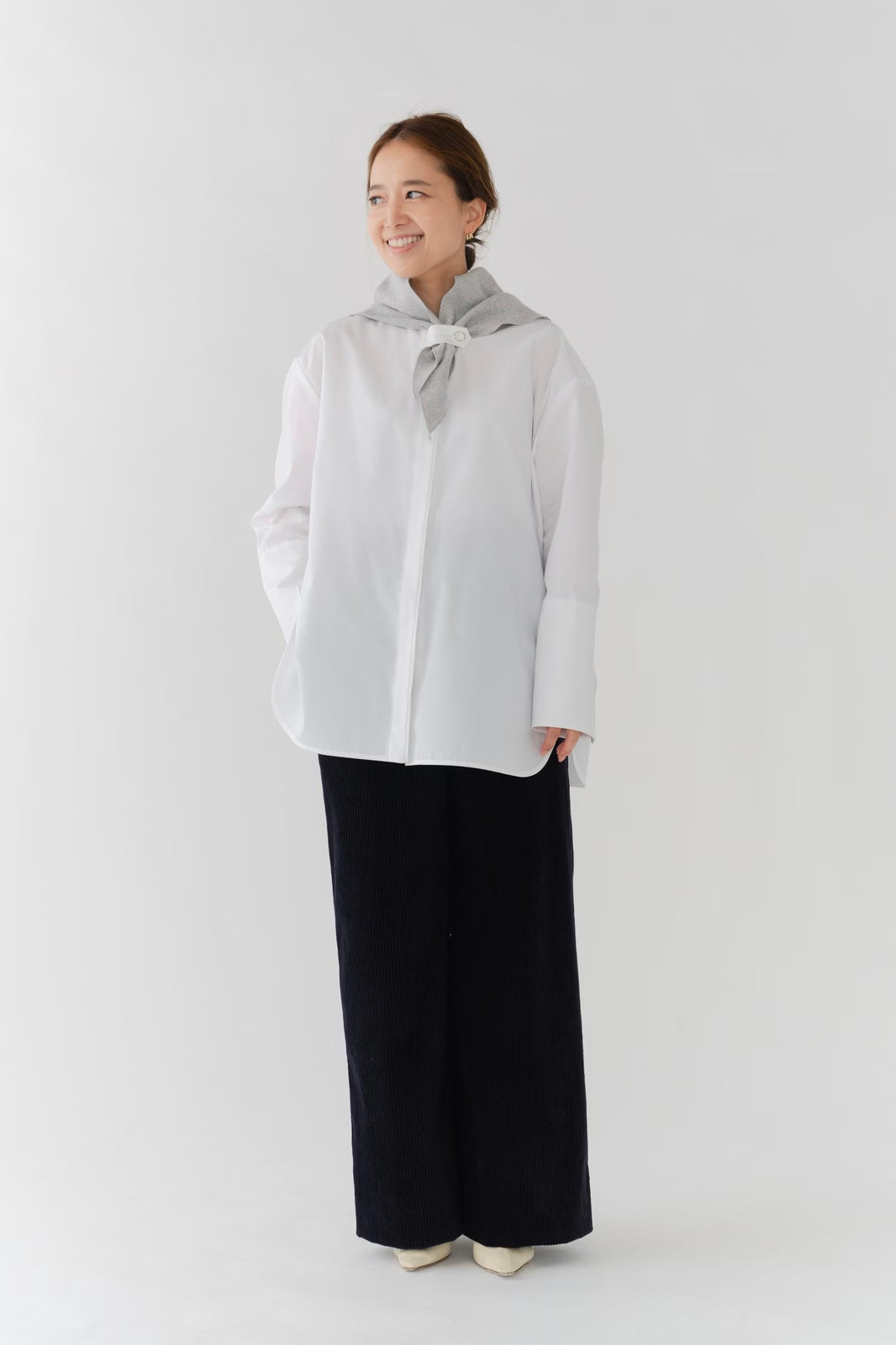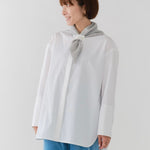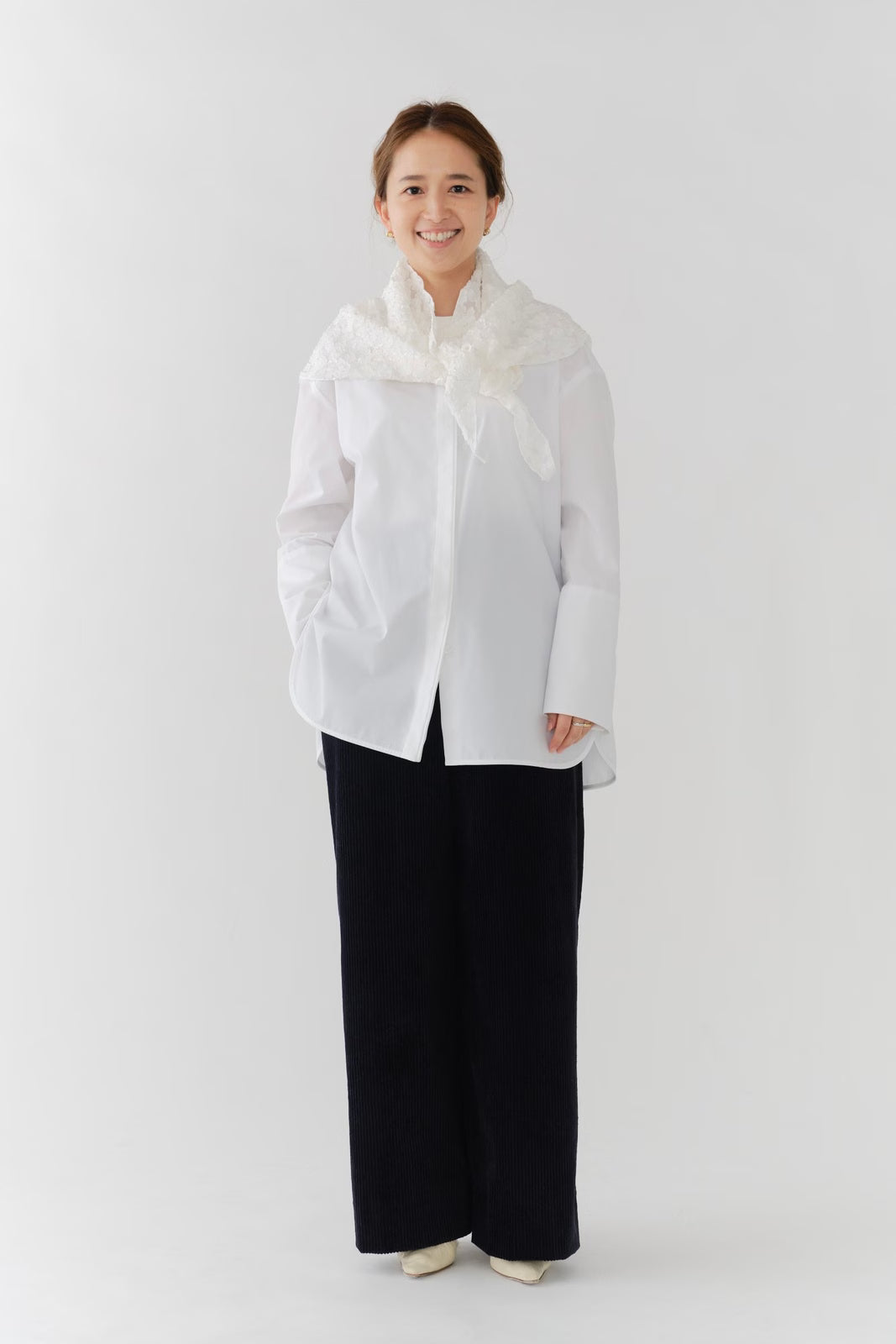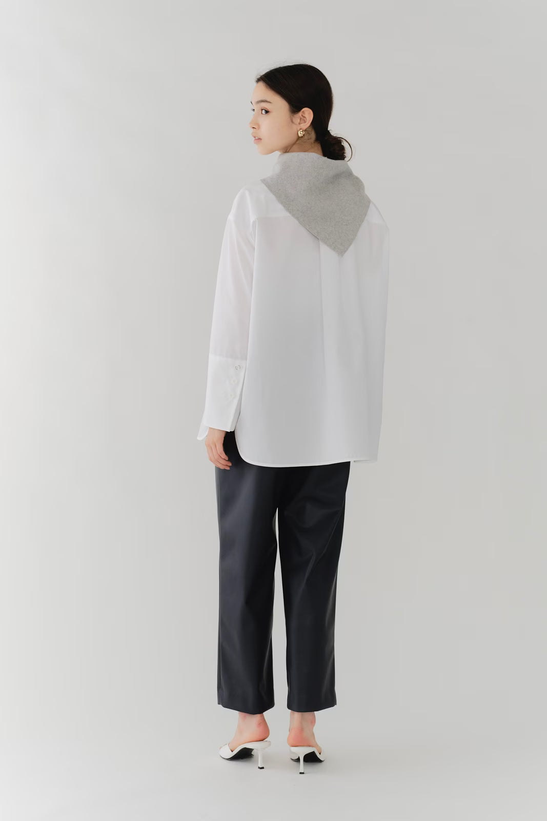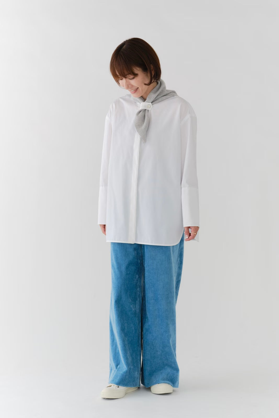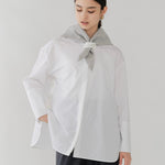 上品な比翼仕立てで、洗練されたシルエットが美しい一枚。取り外し可能なウールスカーフが、セーラー風な雰囲気を引き立てます。大きめのタブでスカーフを挟み込むデザインは、シンプルながらもさりげない個性を与え、スカーフを外せば、また違った魅力を楽しめる万能アイテム。ブラウス生地はシワになりにくいイージーケア素材です。両サイドにはさりげないボタン開きがあり、動きやすさとアクセントを加えています。袖口には、shiroconオリジナルの色違いネームボタンをあしらい、微細な遊び心を感じさせます。前立て裏と広幅カフスは、内側にサテン生地をあしらい、ちらりと見えるサテンの光沢感が洗練された印象を作ります。後ろにはボックスタックに配色ラインを加え、後ろ姿にも華やかさと上品さをプラスしました。シンプルながらも、細部に至るまでこだわりが詰まった、shiroconならではの比翼ブラウス。大人の女性にぴったりの一着です。