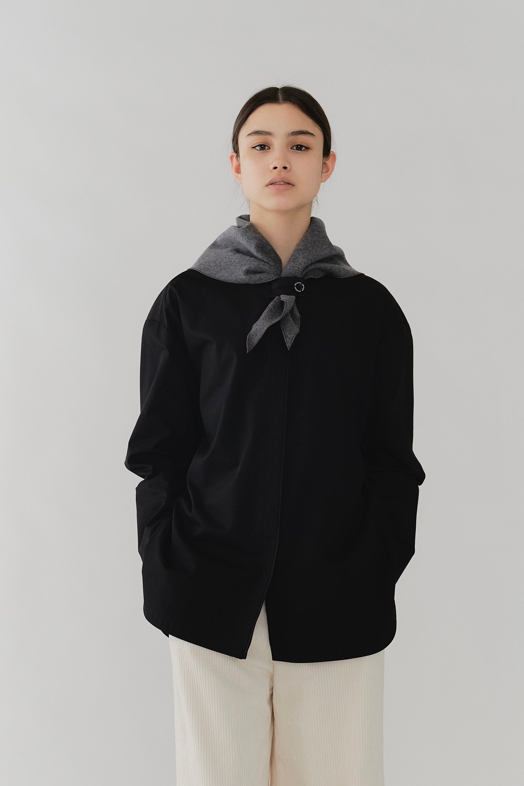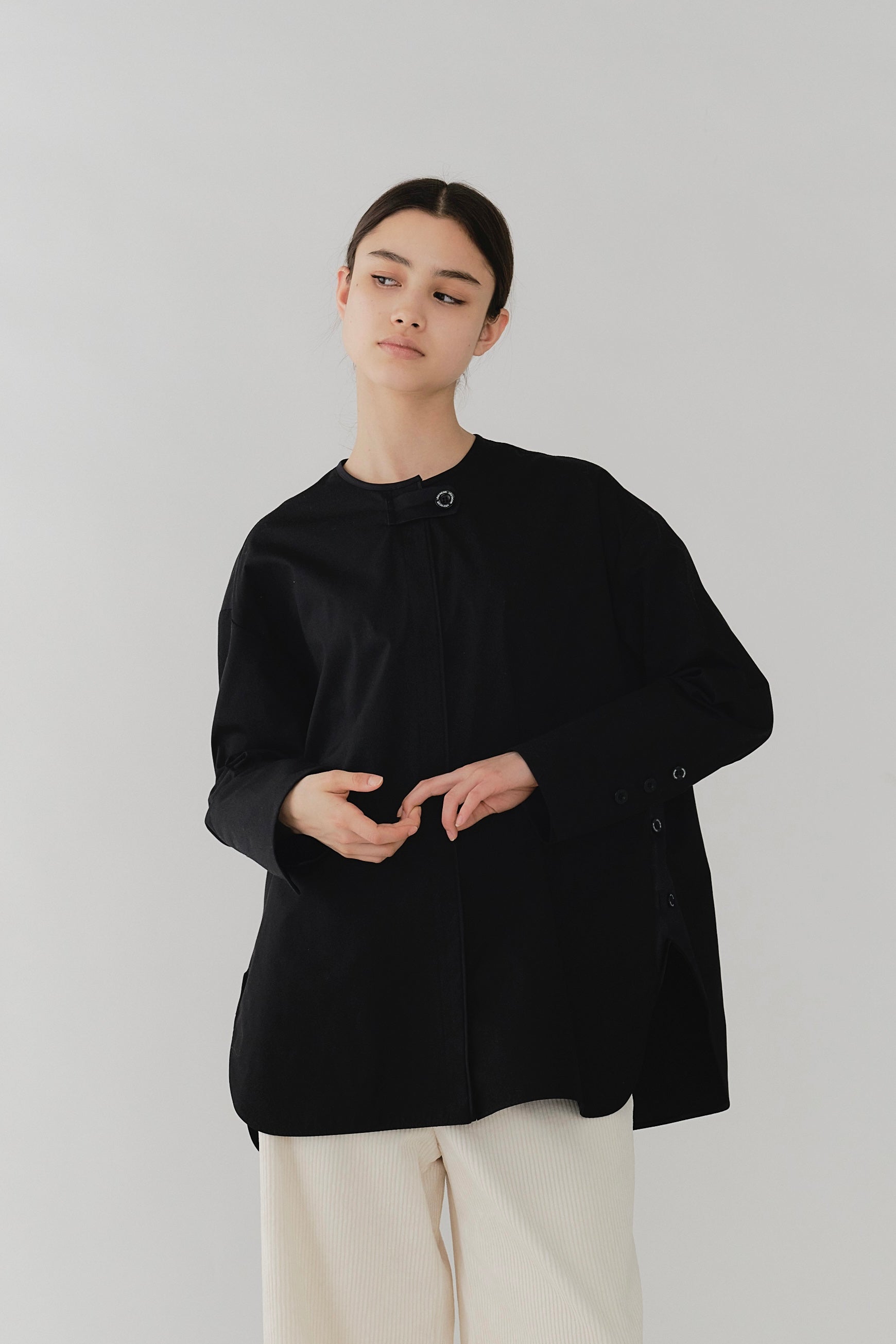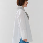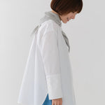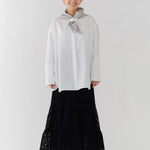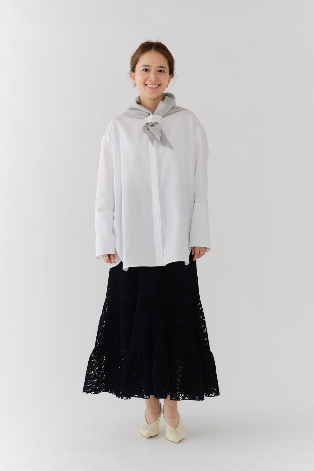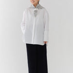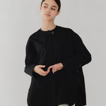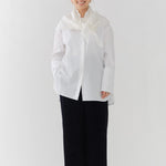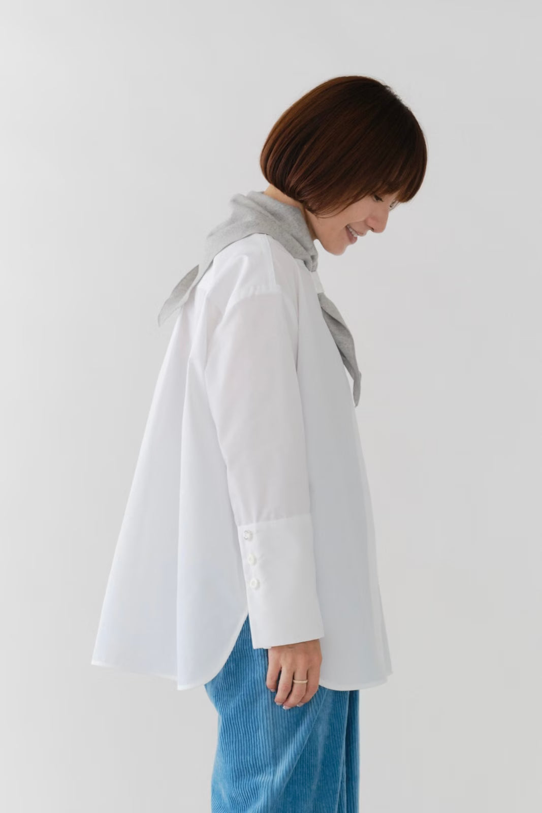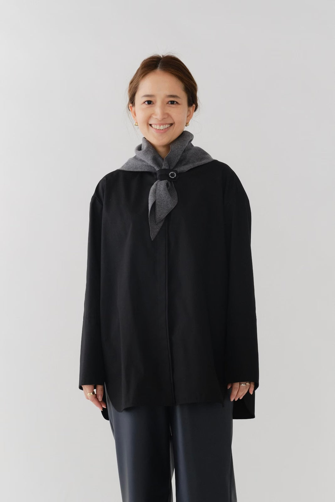 上品な比翼仕立てで、洗練されたシルエットが美しい一枚。取り外し可能なウールスカーフが、セーラー風な雰囲気を引き立てます。大きめのタブでスカーフを挟み込むデザインは、シンプルながらもさりげない個性を与え、スカーフを外せば、また違った魅力を楽しめる万能アイテム。ブラウス生地はシワになりにくいイージーケア素材です。両サイドにはさりげないボタン開きがあり、動きやすさとアクセントを加えています。袖口には、shiroconオリジナルの色違いネームボタンをあしらい、微細な遊び心を感じさせます。前立て裏と広幅カフスは、内側にサテン生地をあしらい、ちらりと見えるサテンの光沢感が洗練された印象を作ります。後ろにはボックスタックに配色ラインを加え、後ろ姿にも華やかさと上品さをプラスしました。シンプルながらも、細部に至るまでこだわりが詰まった、shiroconならではの比翼ブラウス。大人の女性にぴったりの一着です。