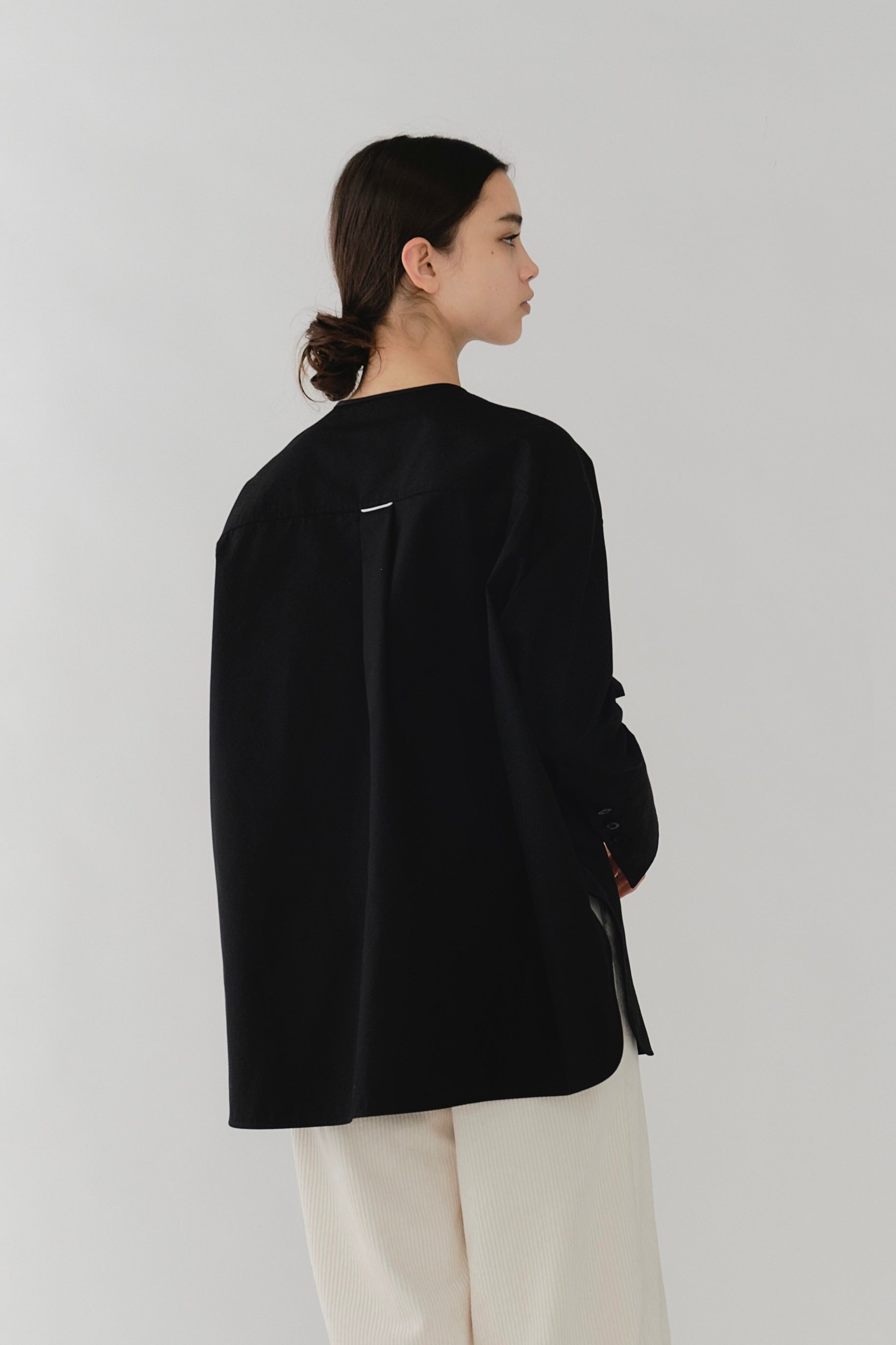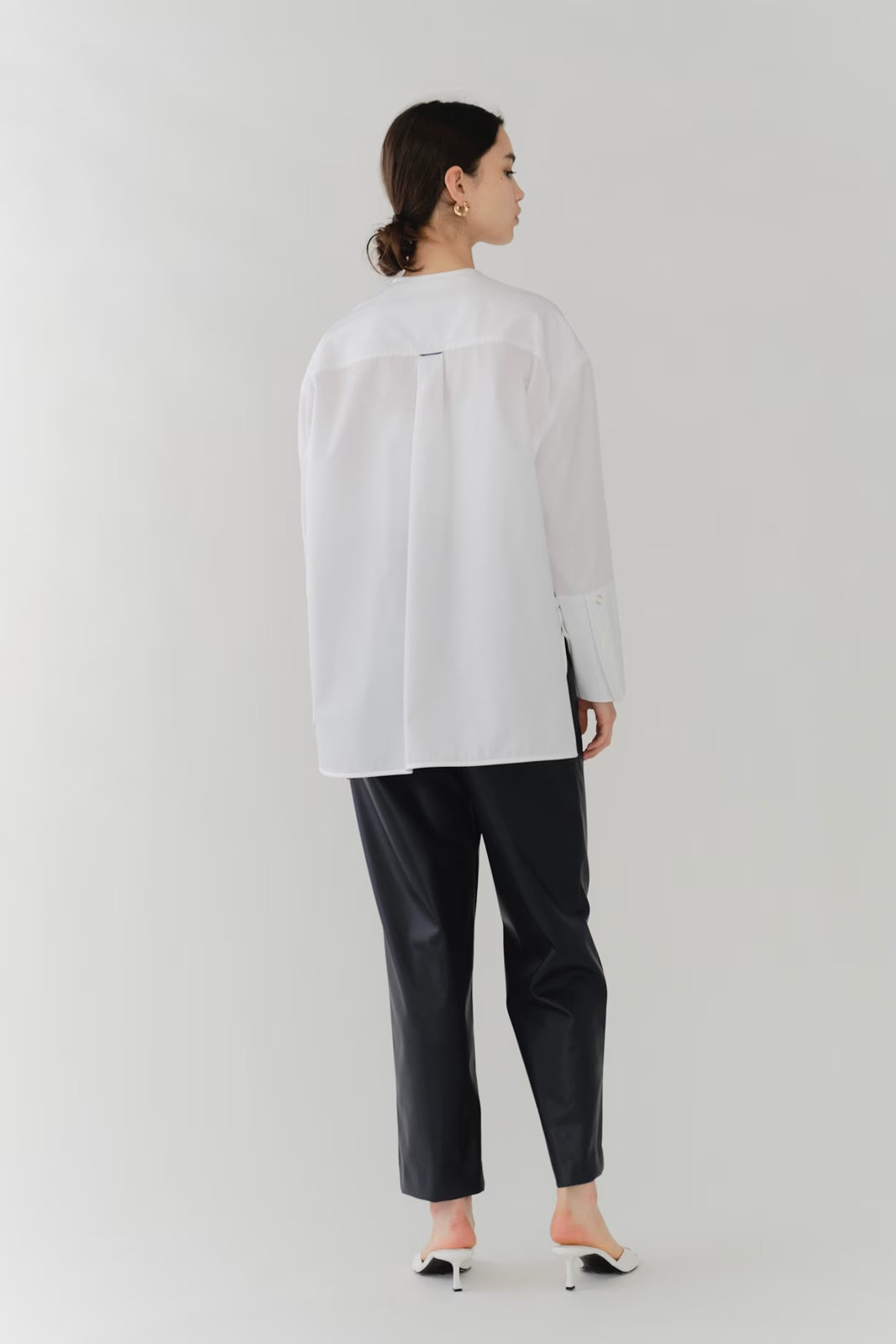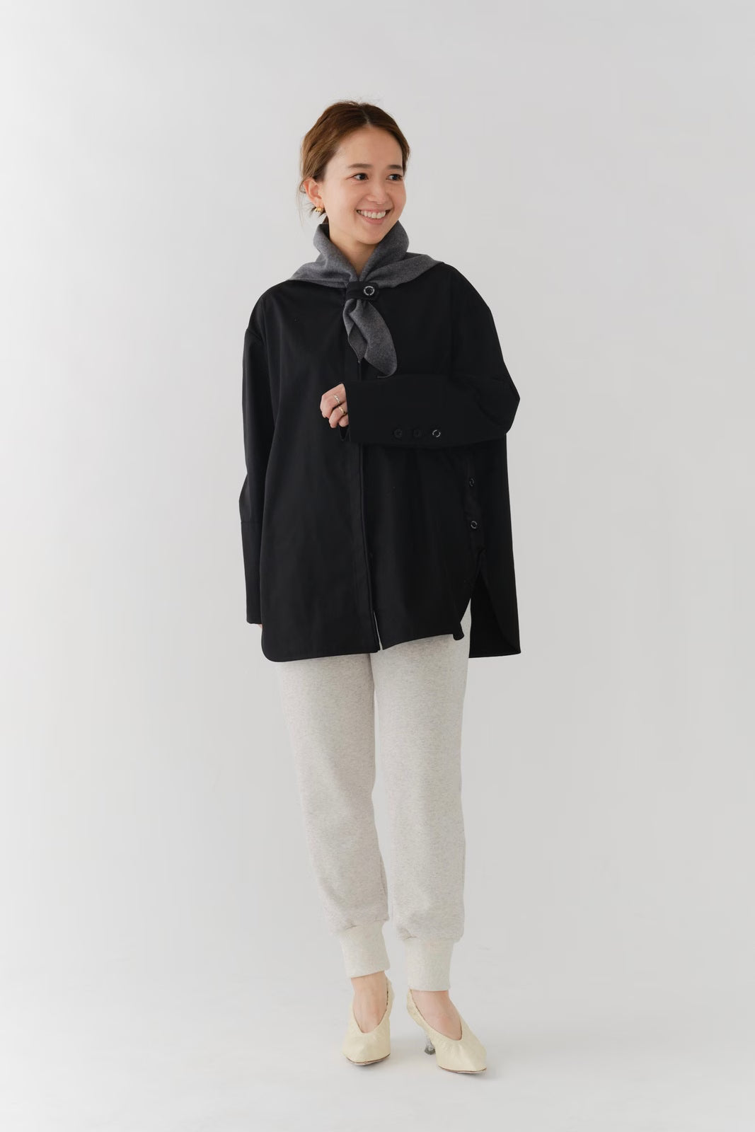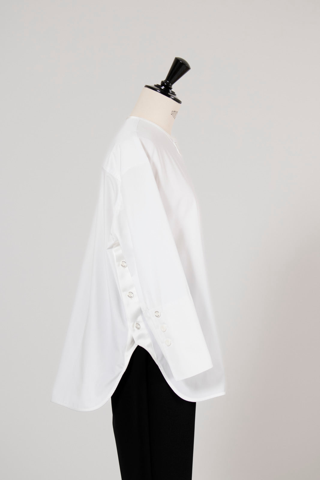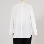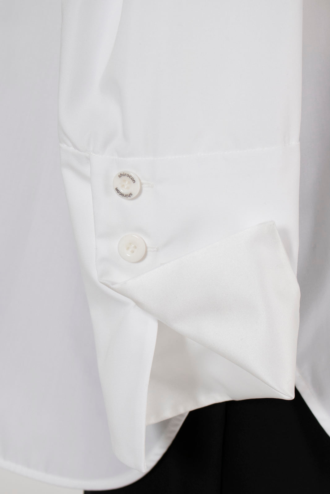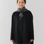 上品な比翼仕立てで、洗練されたシルエットが美しい一枚。取り外し可能なウールスカーフが、セーラー風な雰囲気を引き立てます。大きめのタブでスカーフを挟み込むデザインは、シンプルながらもさりげない個性を与え、スカーフを外せば、また違った魅力を楽しめる万能アイテム。ブラウス生地はシワになりにくいイージーケア素材です。両サイドにはさりげないボタン開きがあり、動きやすさとアクセントを加えています。袖口には、shiroconオリジナルの色違いネームボタンをあしらい、微細な遊び心を感じさせます。前立て裏と広幅カフスは、内側にサテン生地をあしらい、ちらりと見えるサテンの光沢感が洗練された印象を作ります。後ろにはボックスタックに配色ラインを加え、後ろ姿にも華やかさと上品さをプラスしました。シンプルながらも、細部に至るまでこだわりが詰まった、shiroconならではの比翼ブラウス。大人の女性にぴったりの一着です。