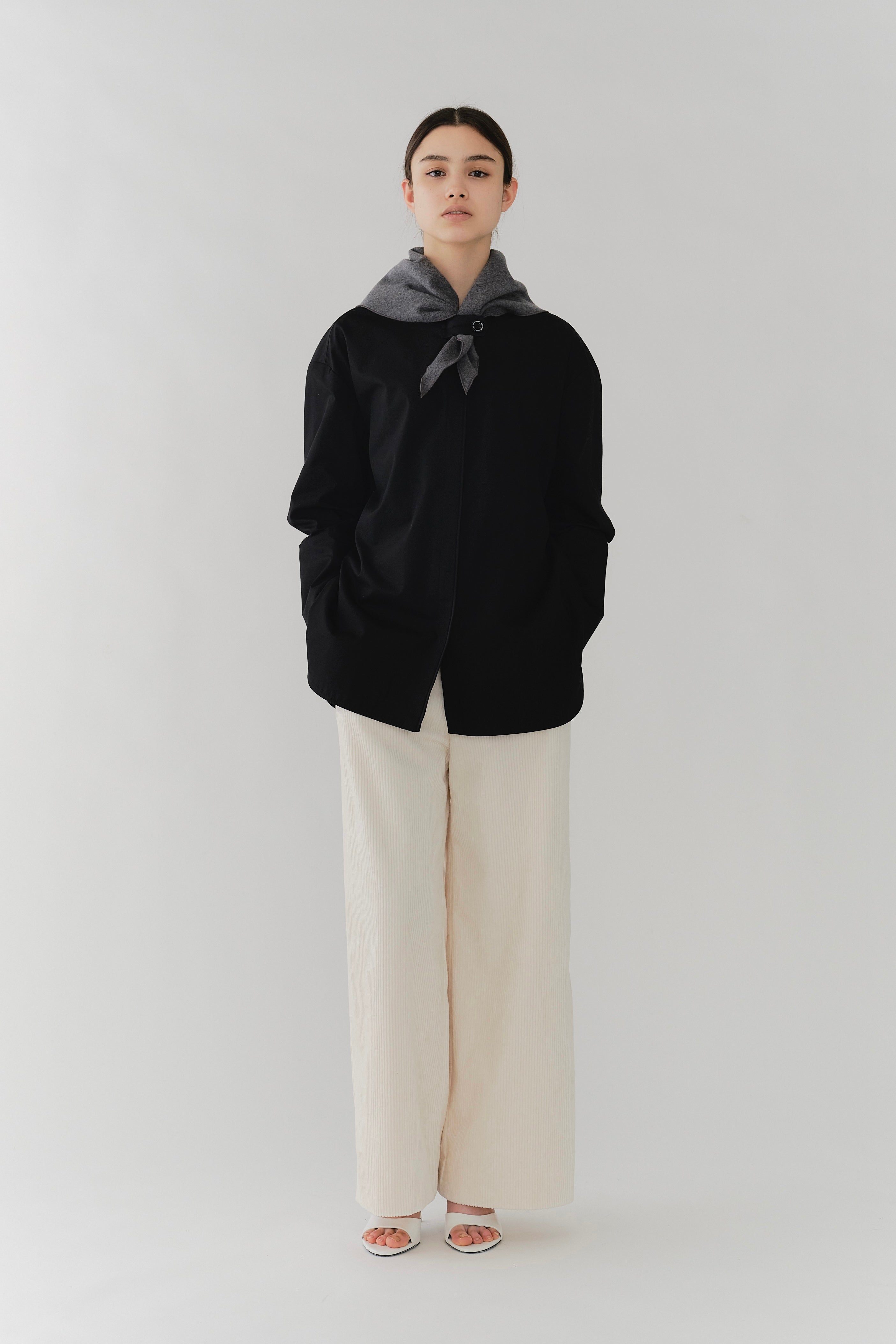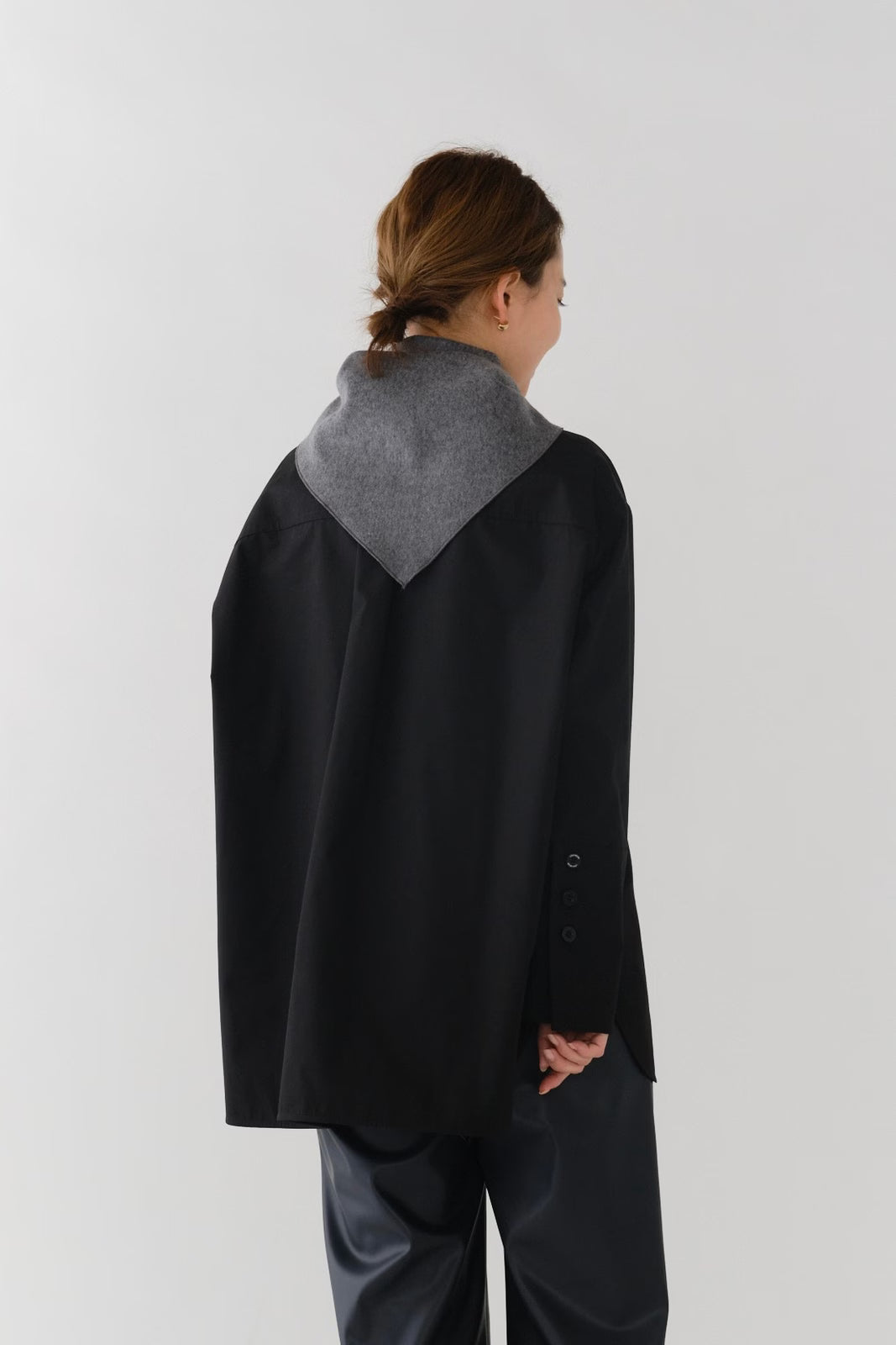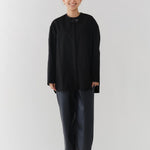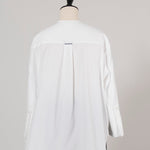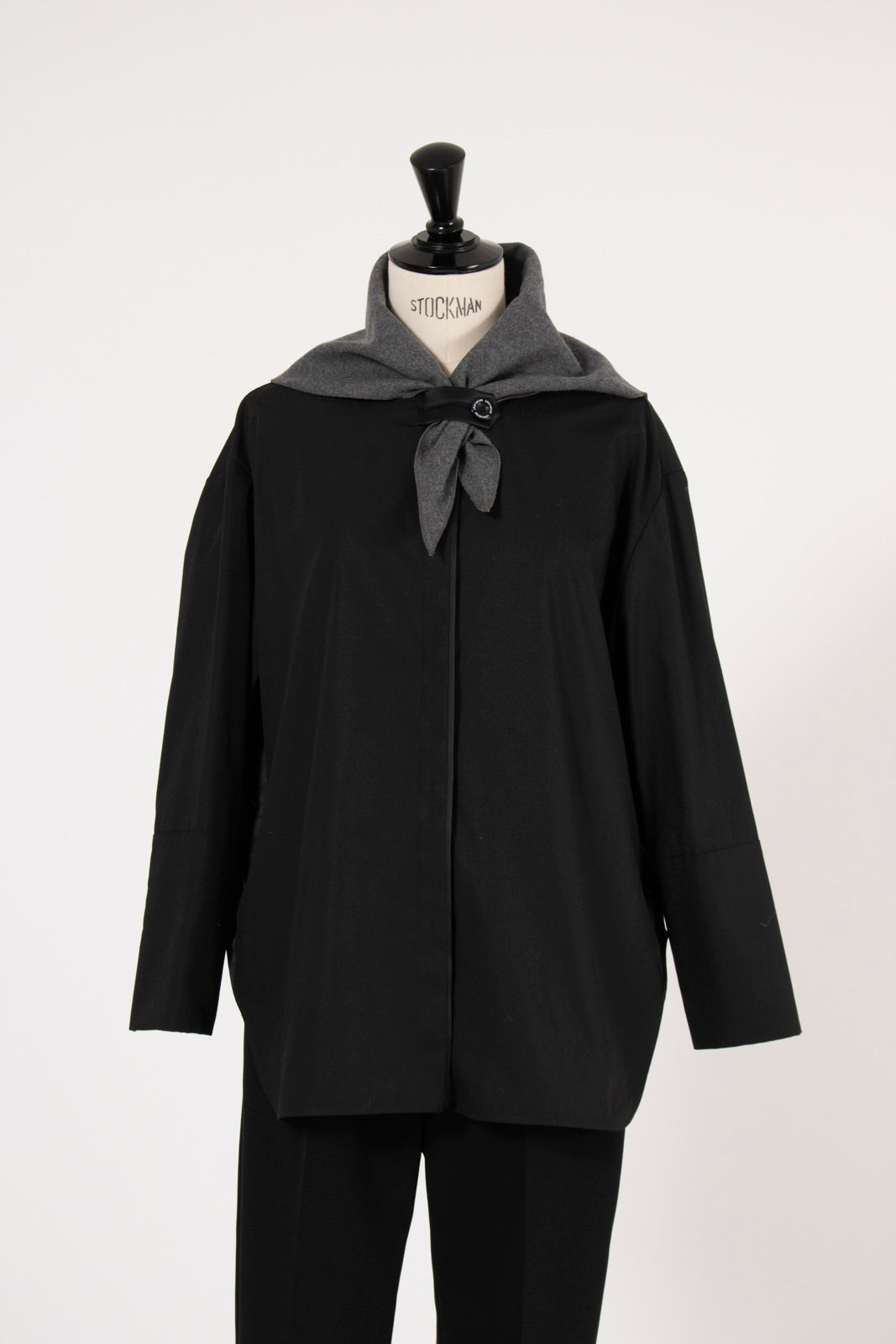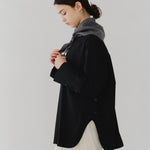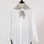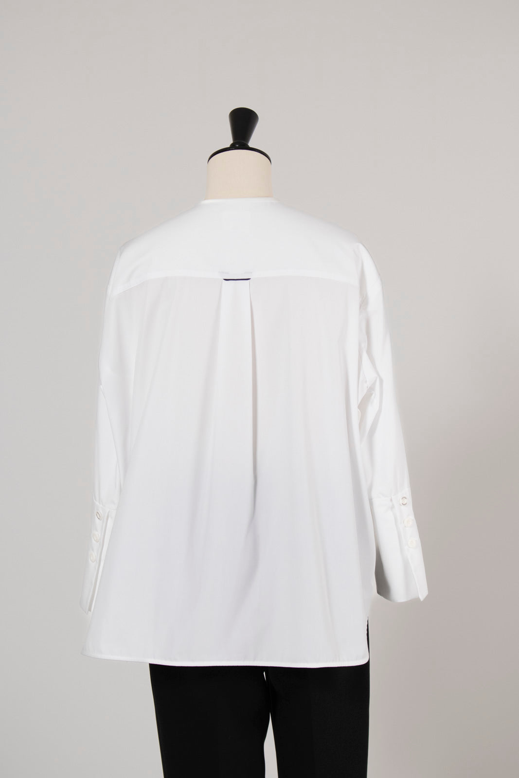 上品な比翼仕立てで、洗練されたシルエットが美しい一枚。取り外し可能なウールスカーフが、セーラー風な雰囲気を引き立てます。大きめのタブでスカーフを挟み込むデザインは、シンプルながらもさりげない個性を与え、スカーフを外せば、また違った魅力を楽しめる万能アイテム。ブラウス生地はシワになりにくいイージーケア素材です。両サイドにはさりげないボタン開きがあり、動きやすさとアクセントを加えています。袖口には、shiroconオリジナルの色違いネームボタンをあしらい、微細な遊び心を感じさせます。前立て裏と広幅カフスは、内側にサテン生地をあしらい、ちらりと見えるサテンの光沢感が洗練された印象を作ります。後ろにはボックスタックに配色ラインを加え、後ろ姿にも華やかさと上品さをプラスしました。シンプルながらも、細部に至るまでこだわりが詰まった、shiroconならではの比翼ブラウス。大人の女性にぴったりの一着です。