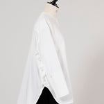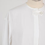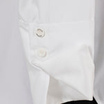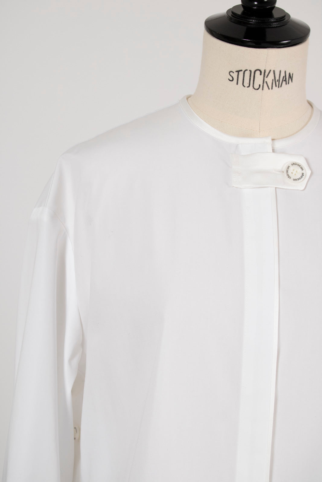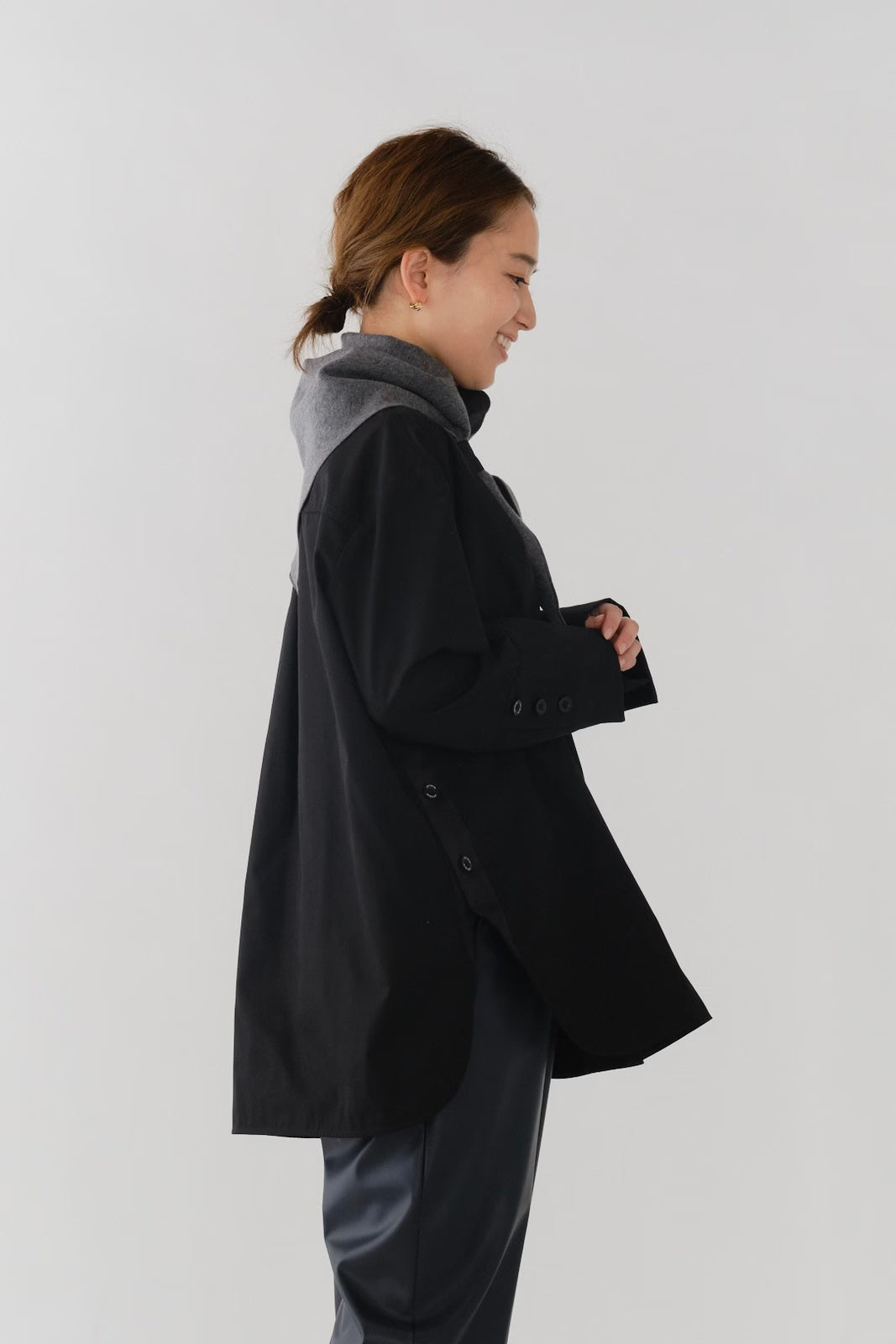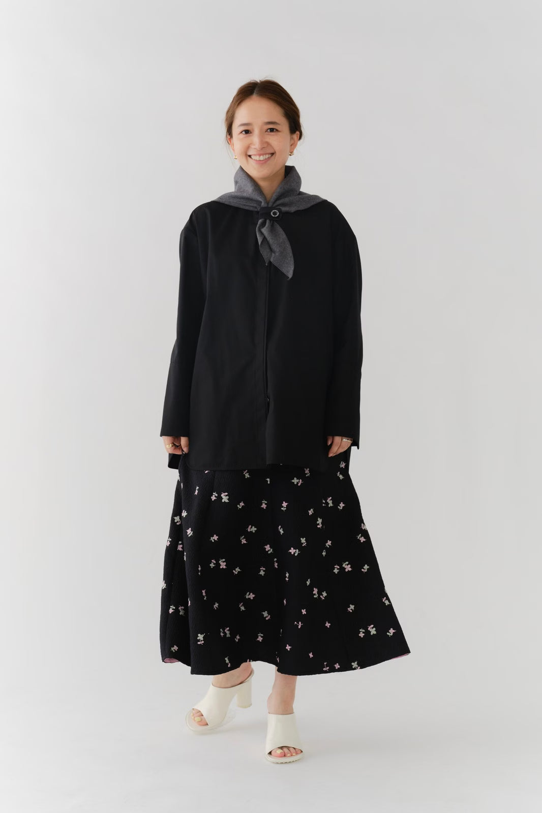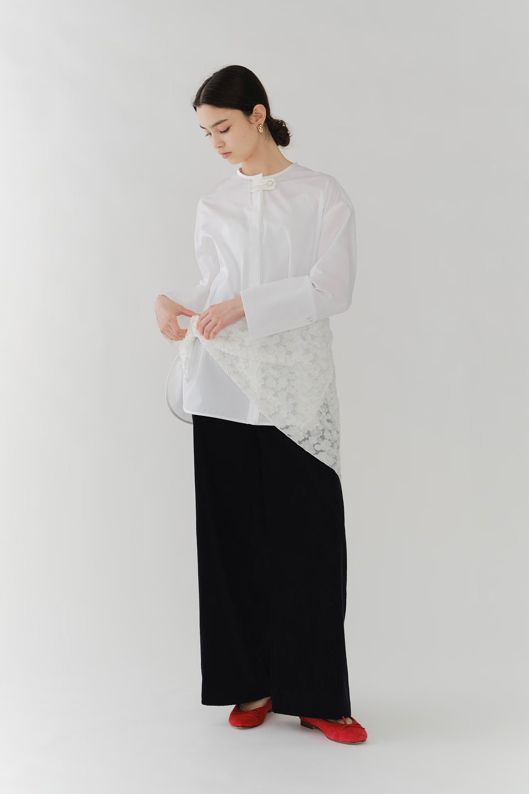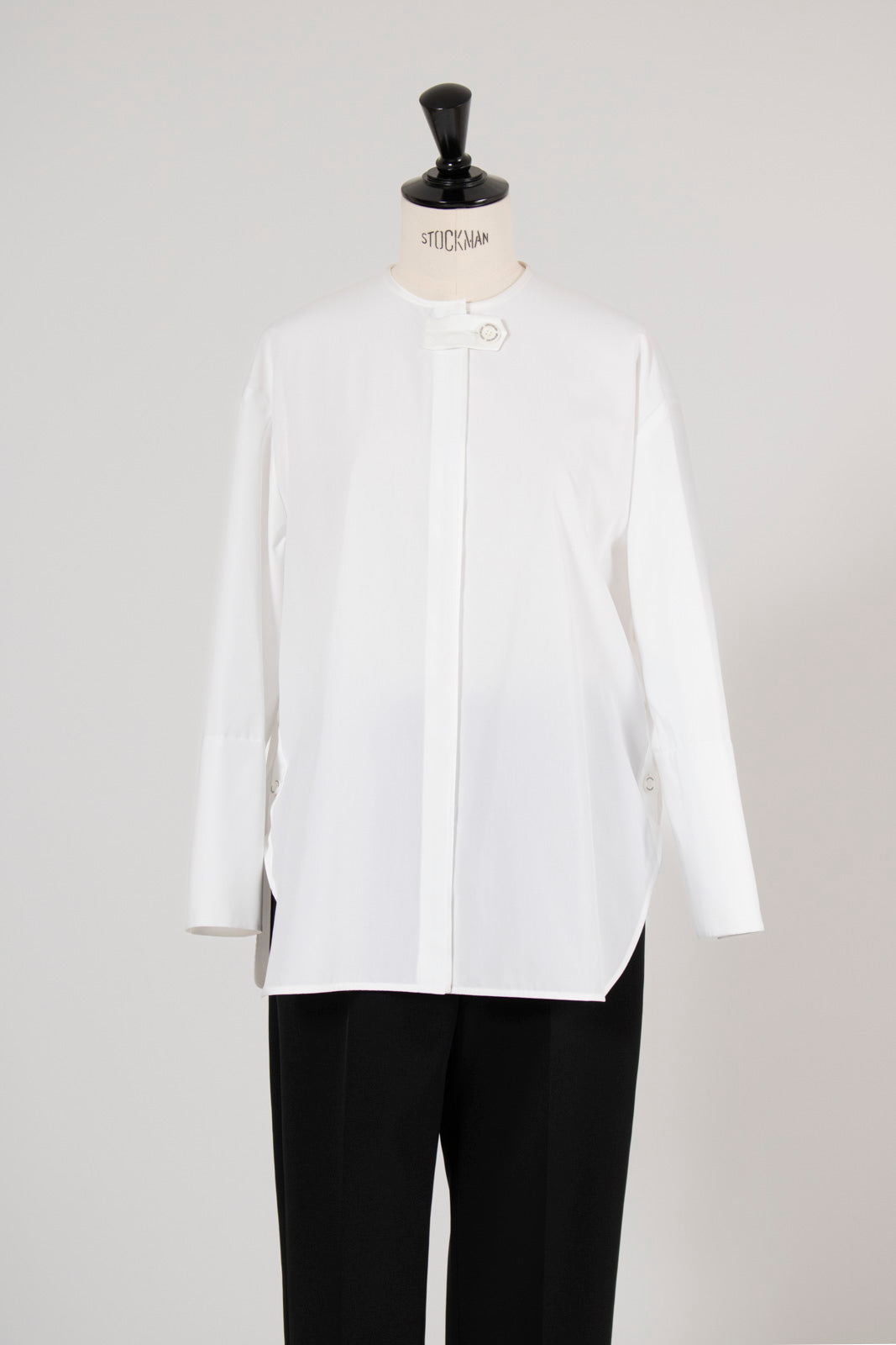 上品な比翼仕立てで、洗練されたシルエットが美しい一枚。取り外し可能なウールスカーフが、セーラー風な雰囲気を引き立てます。大きめのタブでスカーフを挟み込むデザインは、シンプルながらもさりげない個性を与え、スカーフを外せば、また違った魅力を楽しめる万能アイテム。ブラウス生地はシワになりにくいイージーケア素材です。両サイドにはさりげないボタン開きがあり、動きやすさとアクセントを加えています。袖口には、shiroconオリジナルの色違いネームボタンをあしらい、微細な遊び心を感じさせます。前立て裏と広幅カフスは、内側にサテン生地をあしらい、ちらりと見えるサテンの光沢感が洗練された印象を作ります。後ろにはボックスタックに配色ラインを加え、後ろ姿にも華やかさと上品さをプラスしました。シンプルながらも、細部に至るまでこだわりが詰まった、shiroconならではの比翼ブラウス。大人の女性にぴったりの一着です。