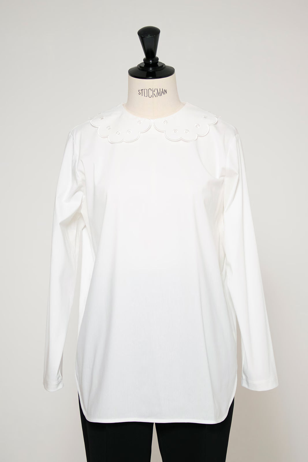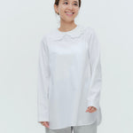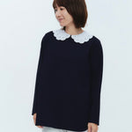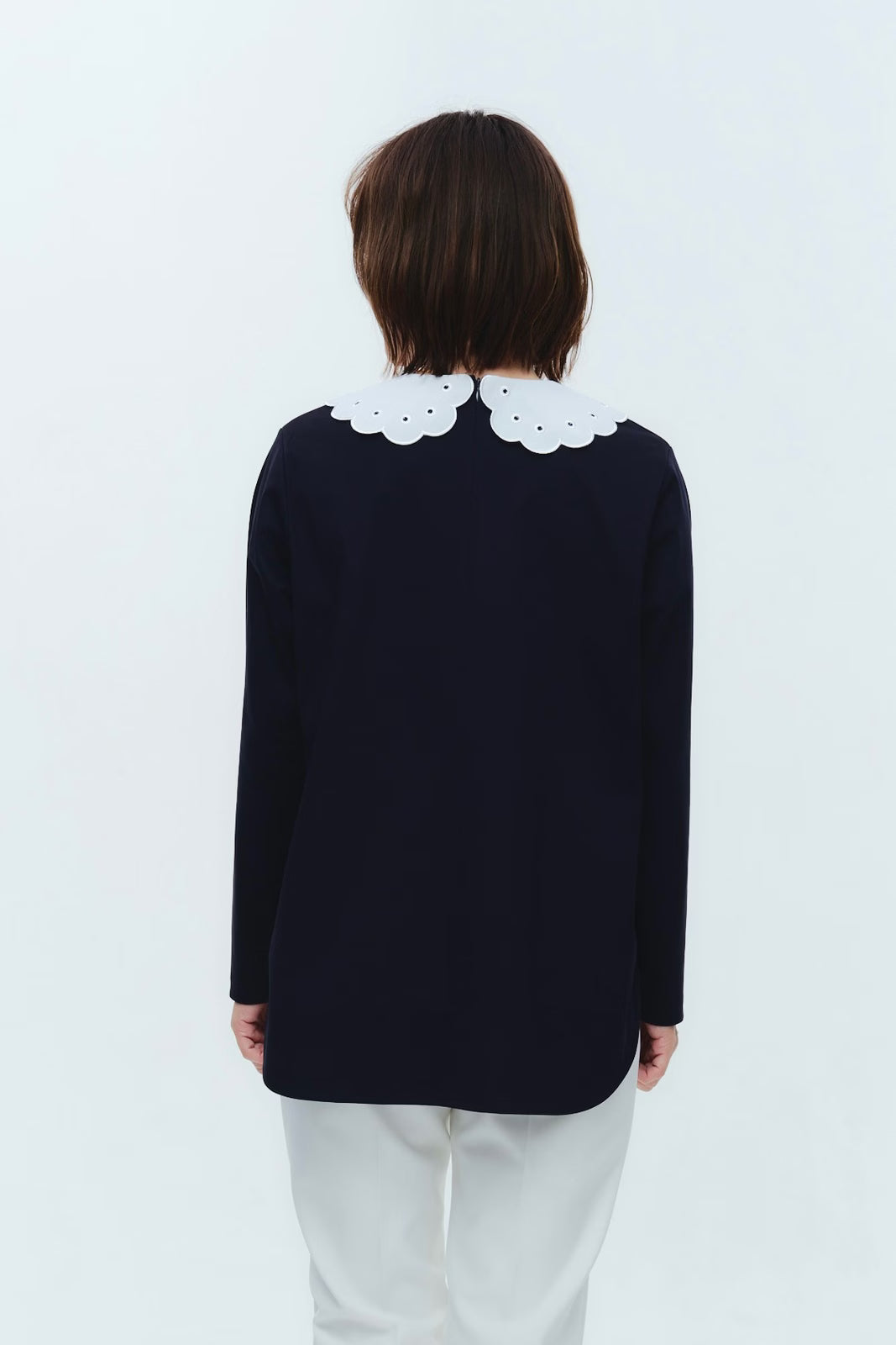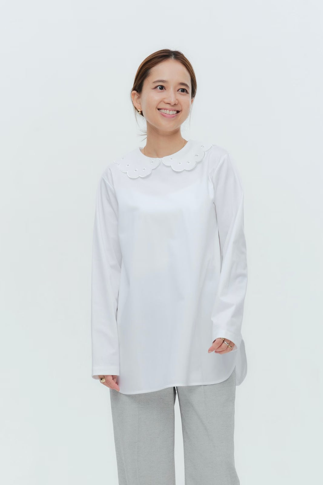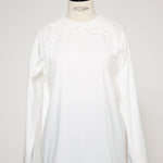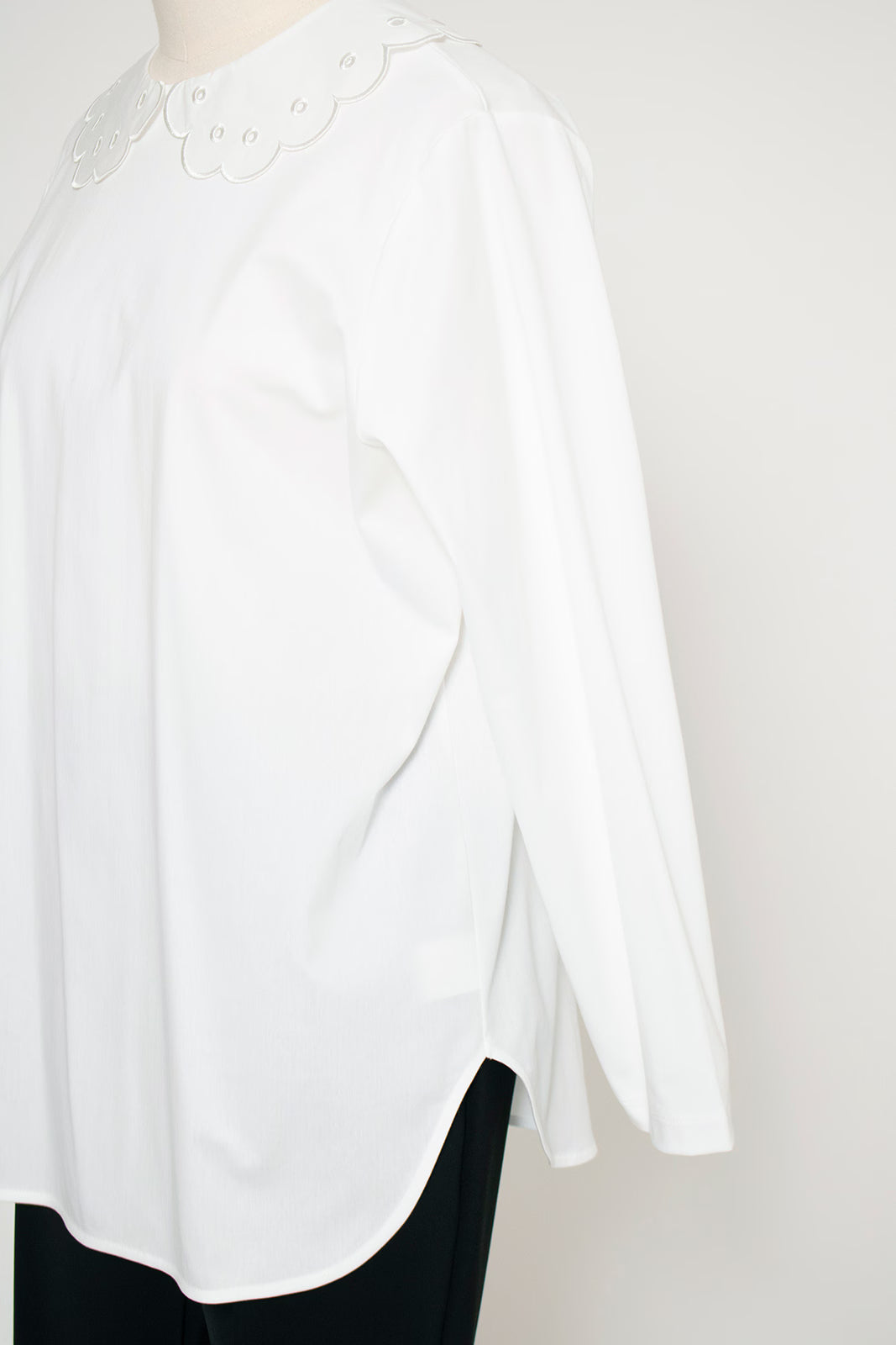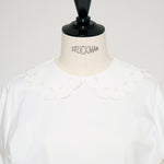 大人気のスカラップシリーズに新しいスタイルが登場!まるで花が咲いたようなドットとスカラップの刺繍が可愛い、春めく衿に仕上げました。身頃の生地にはさらりとした上品な風合いのコットンベースの素材を使用。肌あたりが優しくなめらかな着心地です。織物のようなハリ感がありながら伸縮性があるのもポイント。アウトスタイルでも楽しめるよう裾をラウンドに。ヒップラインが気になりにくい丈感です。寒い日はカーデやジャケットから衿を出したコーデも良し、暖かい日には1枚でタックインしてワイドなデニムコーデも相性抜群。長く季節をともに過ごせる心強いアイテムです。