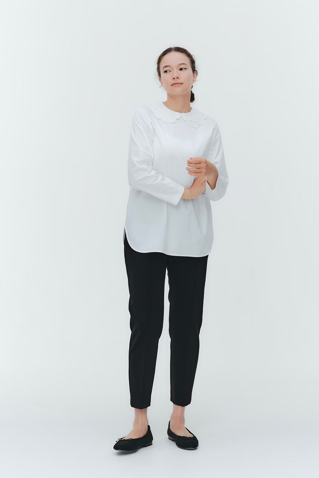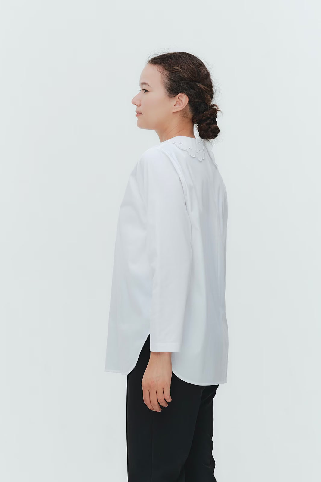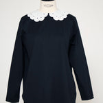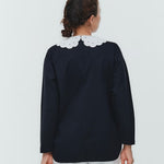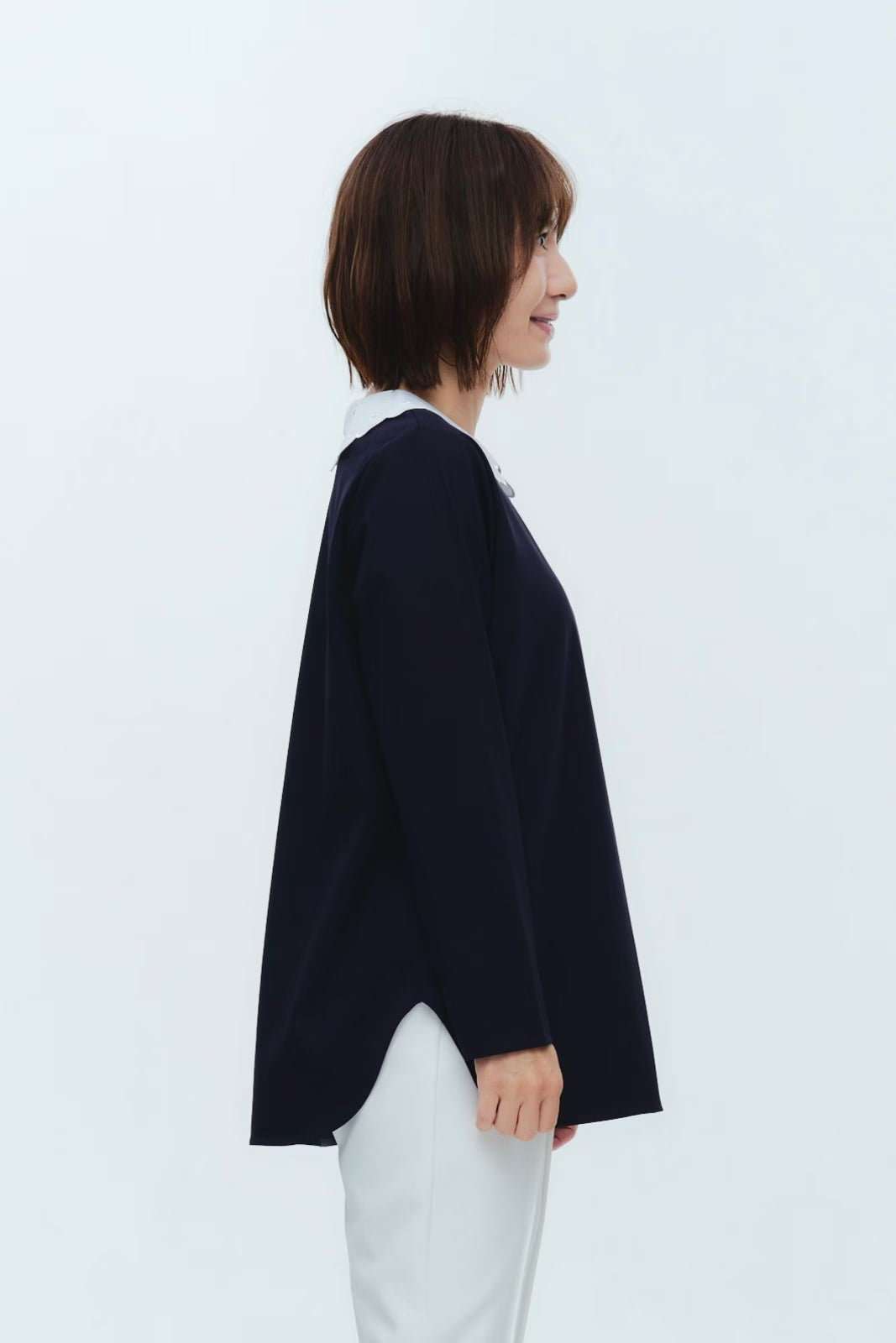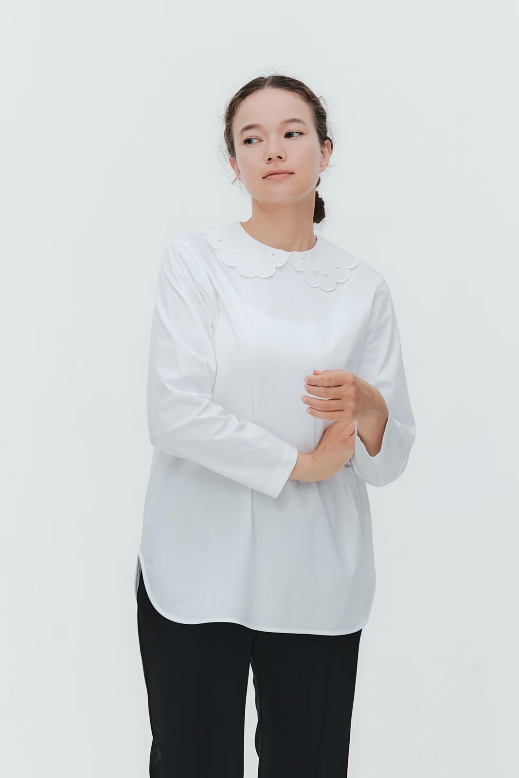 大人気のスカラップシリーズに新しいスタイルが登場!まるで花が咲いたようなドットとスカラップの刺繍が可愛い、春めく衿に仕上げました。身頃の生地にはさらりとした上品な風合いのコットンベースの素材を使用。肌あたりが優しくなめらかな着心地です。織物のようなハリ感がありながら伸縮性があるのもポイント。アウトスタイルでも楽しめるよう裾をラウンドに。ヒップラインが気になりにくい丈感です。寒い日はカーデやジャケットから衿を出したコーデも良し、暖かい日には1枚でタックインしてワイドなデニムコーデも相性抜群。長く季節をともに過ごせる心強いアイテムです。