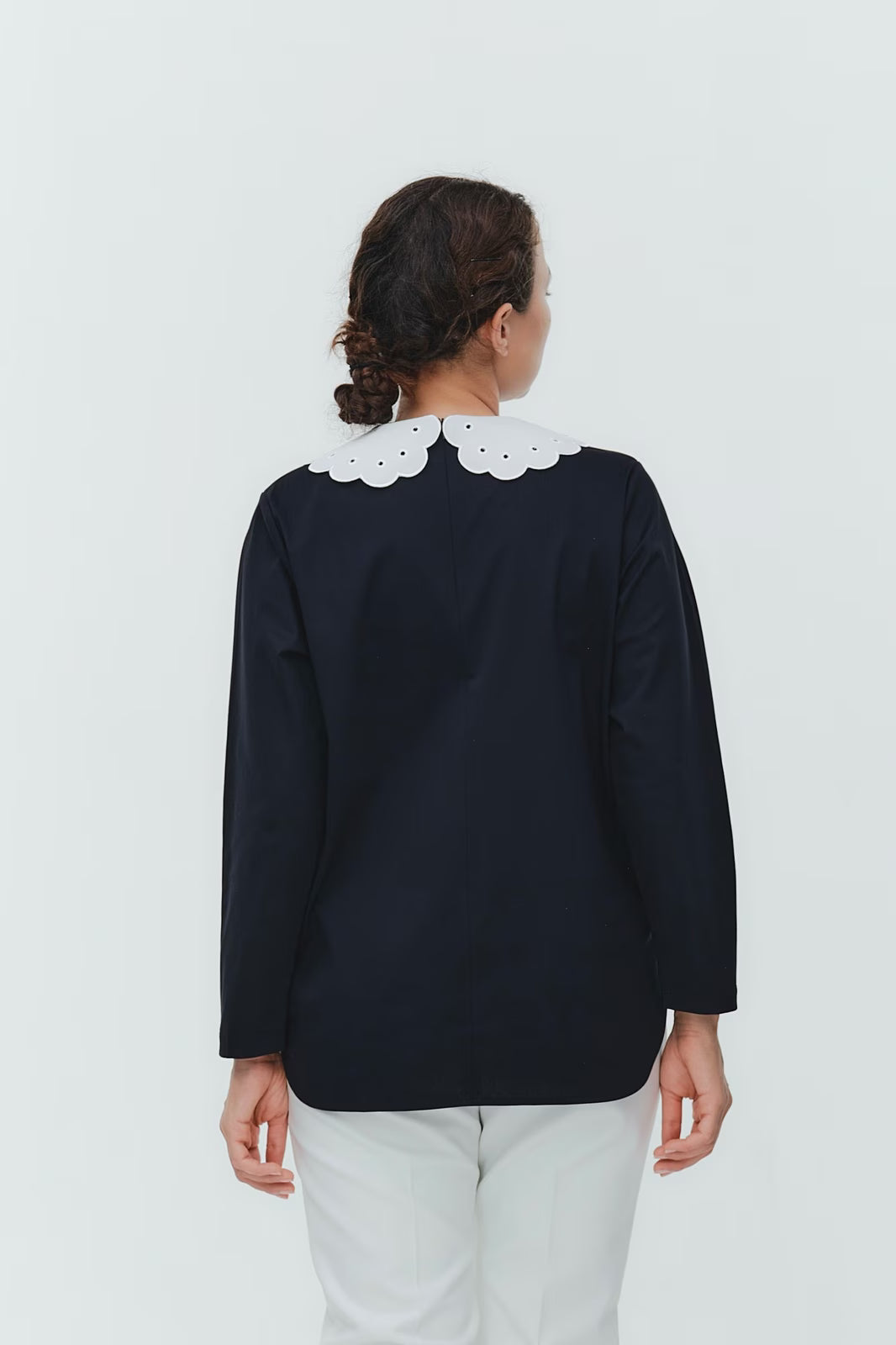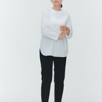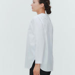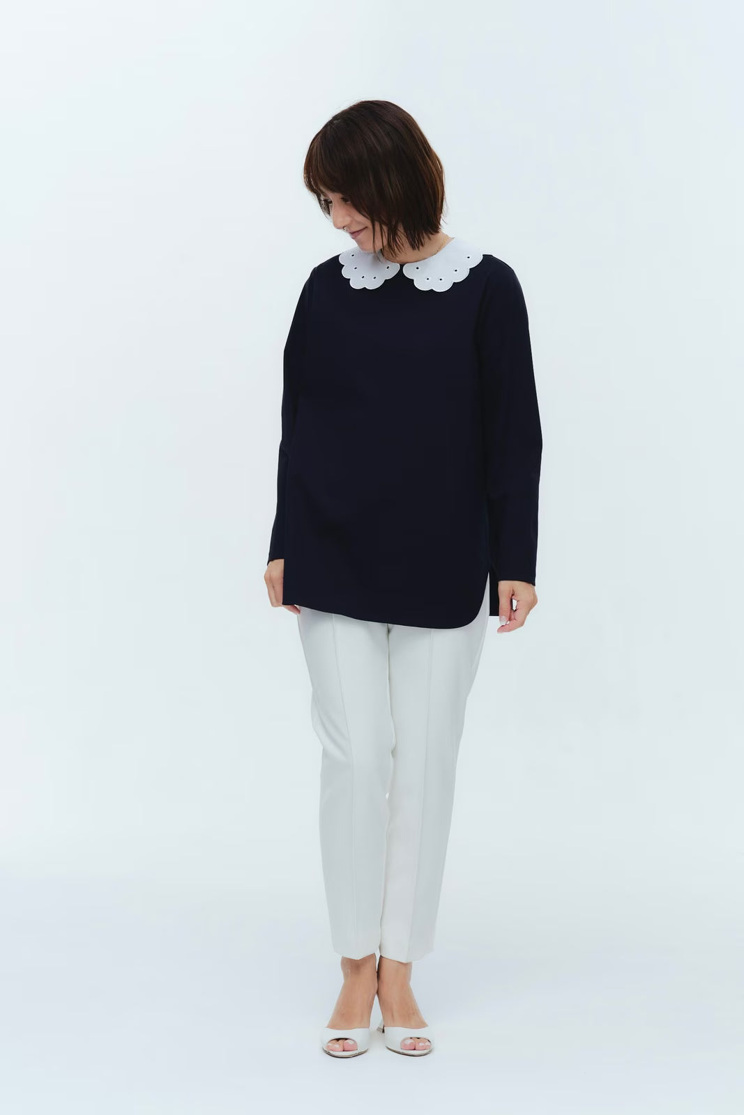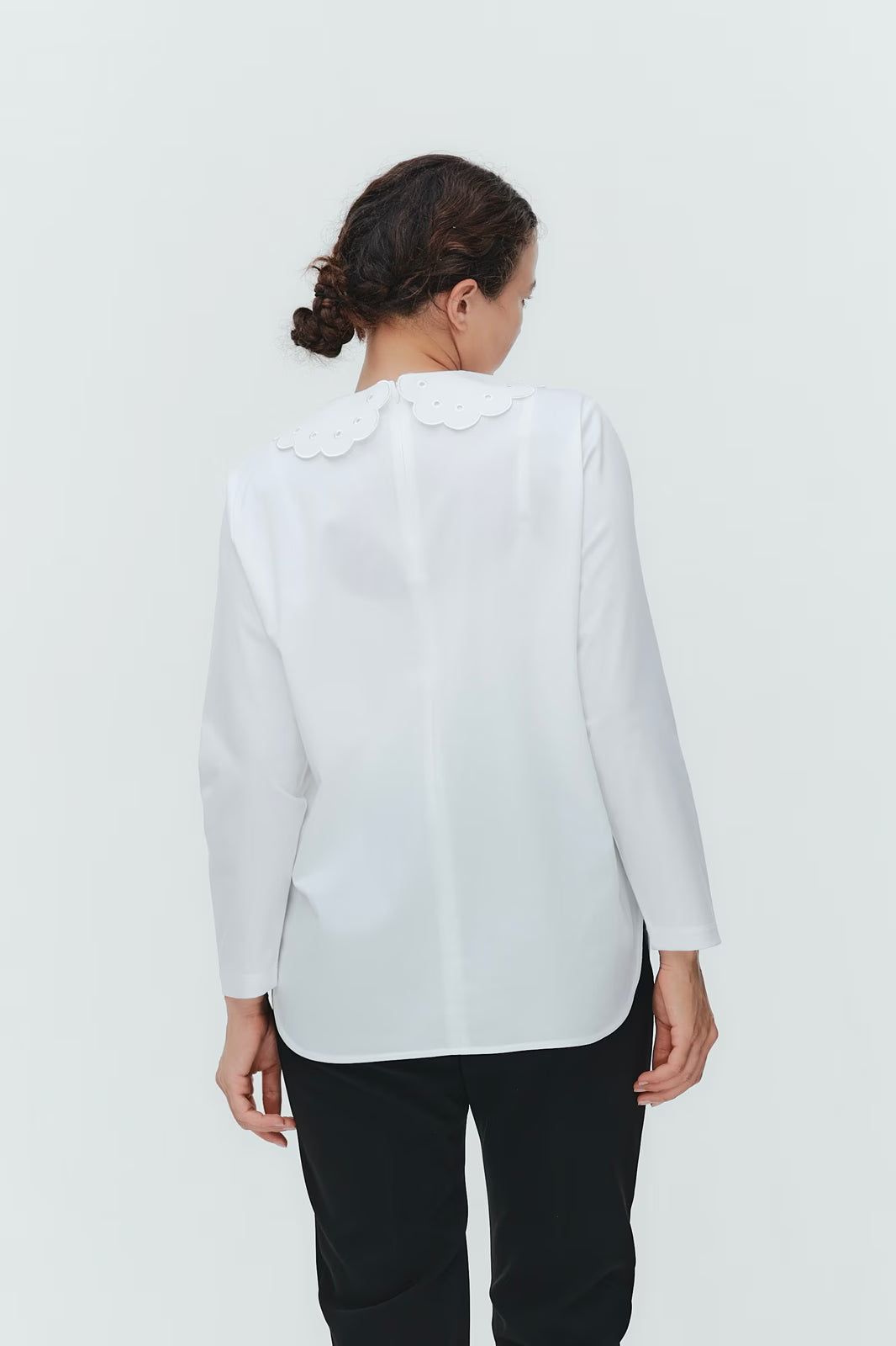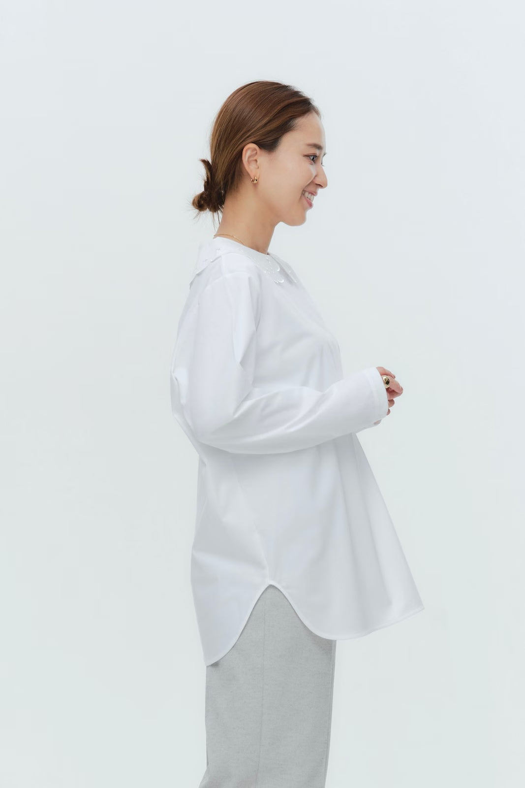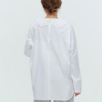 大人気のスカラップシリーズに新しいスタイルが登場!まるで花が咲いたようなドットとスカラップの刺繍が可愛い、春めく衿に仕上げました。身頃の生地にはさらりとした上品な風合いのコットンベースの素材を使用。肌あたりが優しくなめらかな着心地です。織物のようなハリ感がありながら伸縮性があるのもポイント。アウトスタイルでも楽しめるよう裾をラウンドに。ヒップラインが気になりにくい丈感です。寒い日はカーデやジャケットから衿を出したコーデも良し、暖かい日には1枚でタックインしてワイドなデニムコーデも相性抜群。長く季節をともに過ごせる心強いアイテムです。