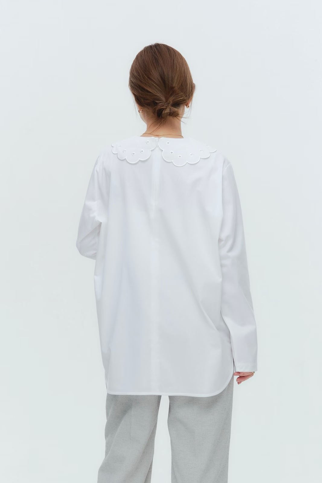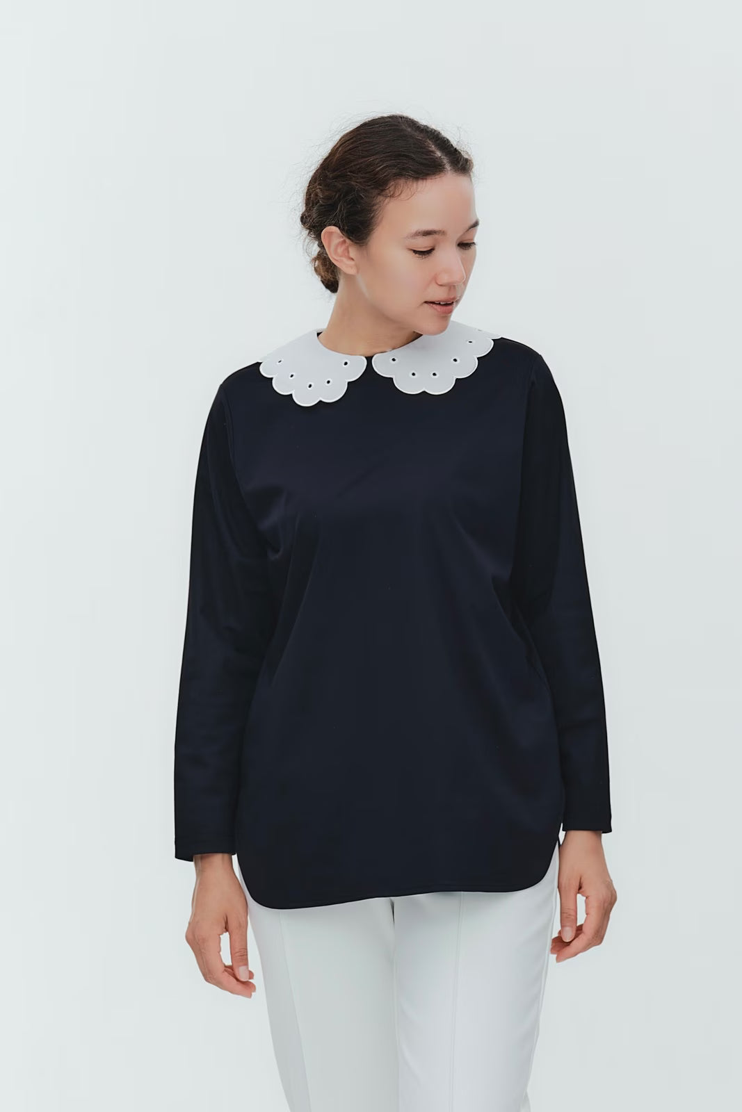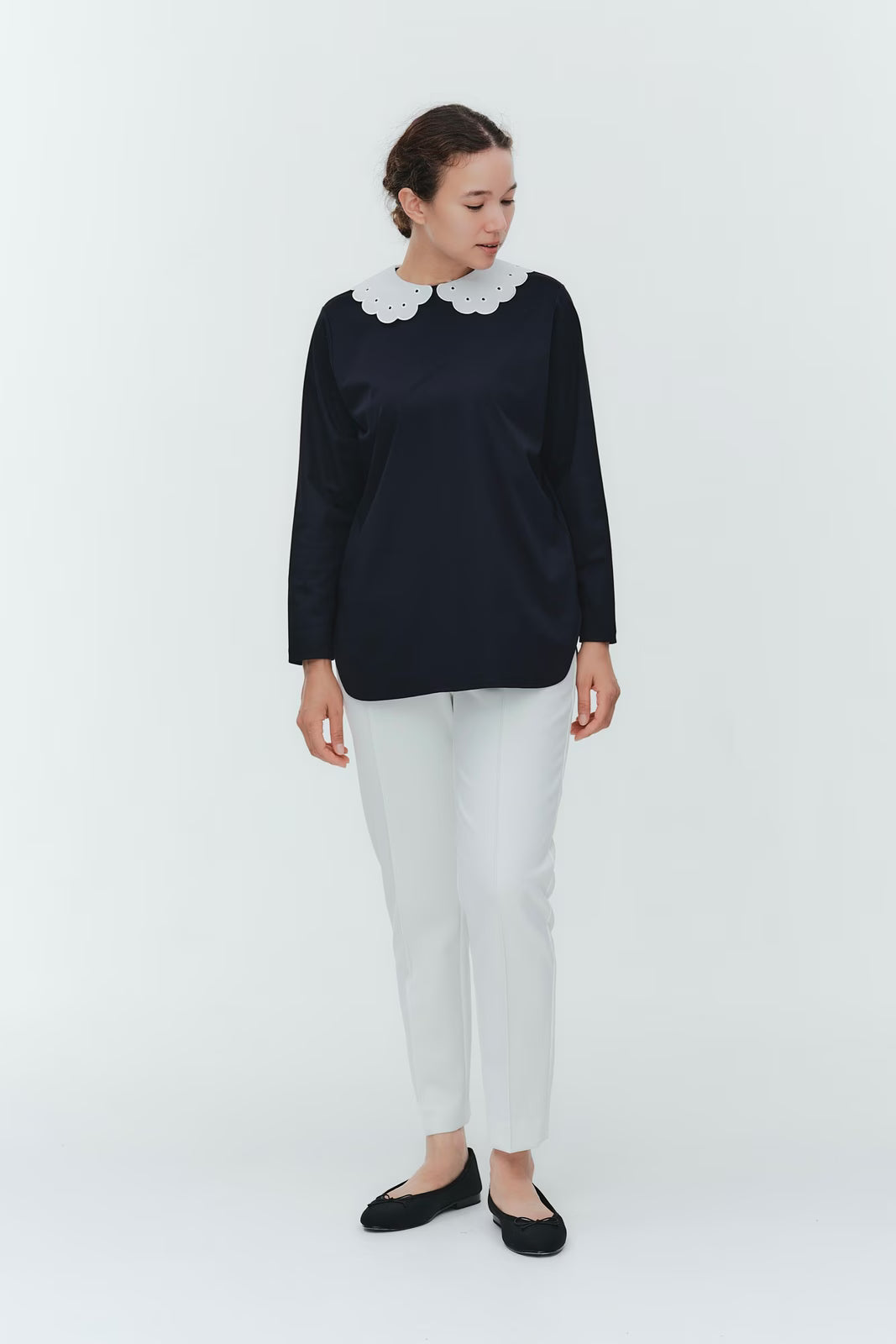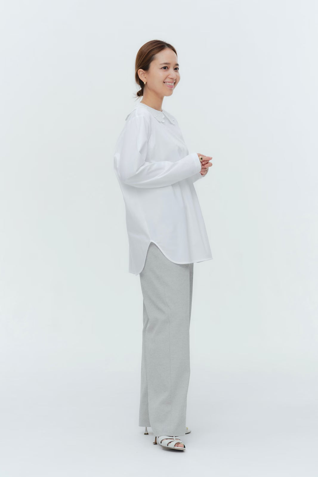 大人気のスカラップシリーズに新しいスタイルが登場!まるで花が咲いたようなドットとスカラップの刺繍が可愛い、春めく衿に仕上げました。身頃の生地にはさらりとした上品な風合いのコットンベースの素材を使用。肌あたりが優しくなめらかな着心地です。織物のようなハリ感がありながら伸縮性があるのもポイント。アウトスタイルでも楽しめるよう裾をラウンドに。ヒップラインが気になりにくい丈感です。寒い日はカーデやジャケットから衿を出したコーデも良し、暖かい日には1枚でタックインしてワイドなデニムコーデも相性抜群。長く季節をともに過ごせる心強いアイテムです。