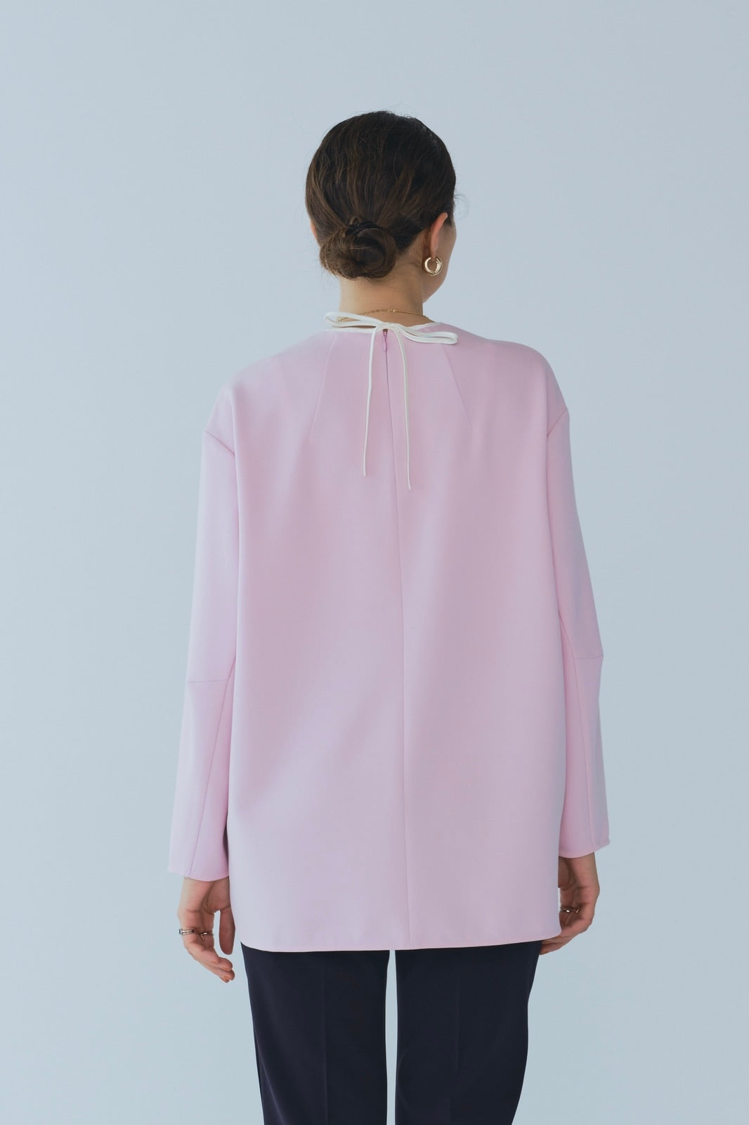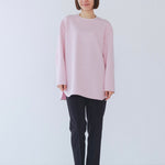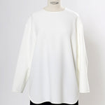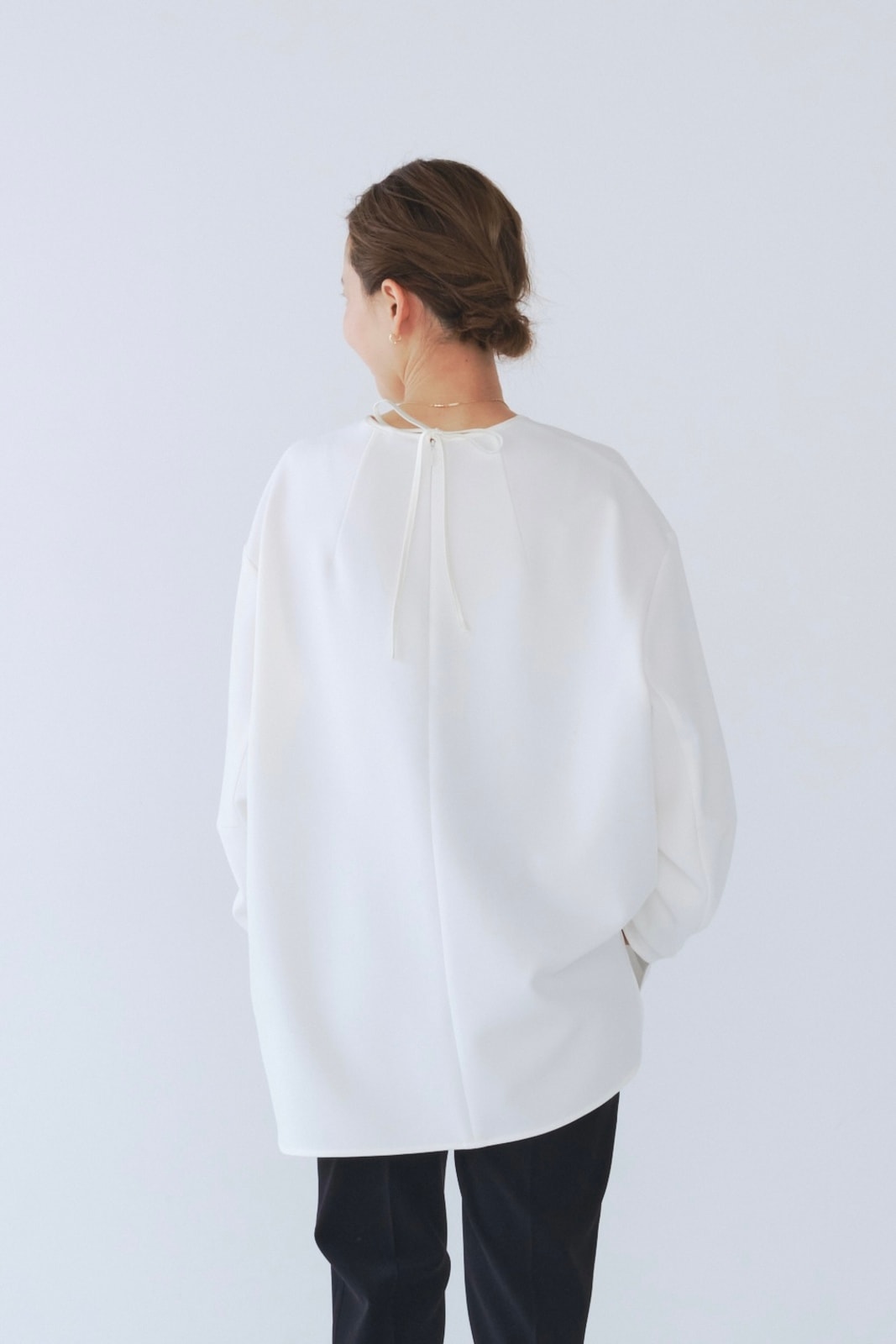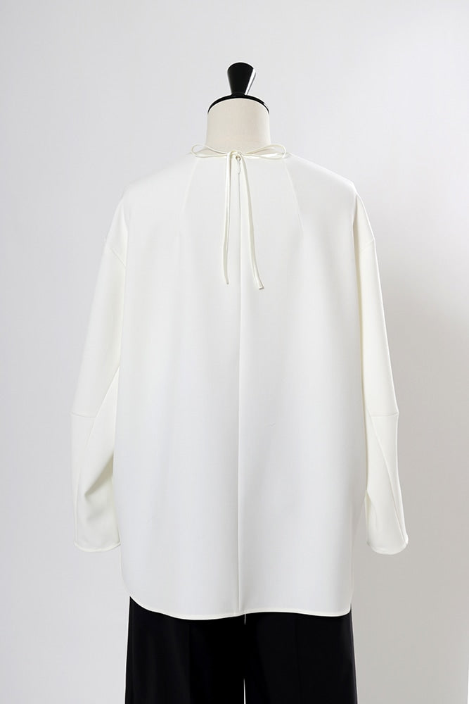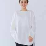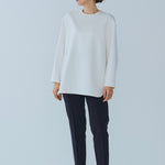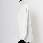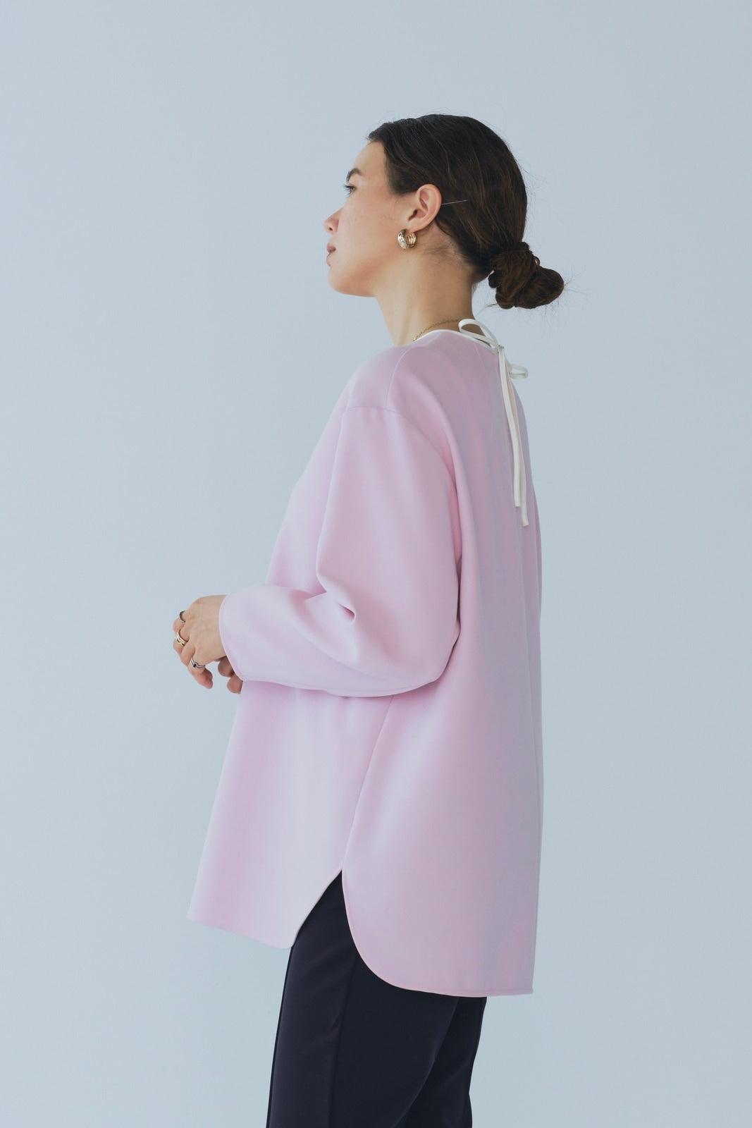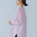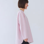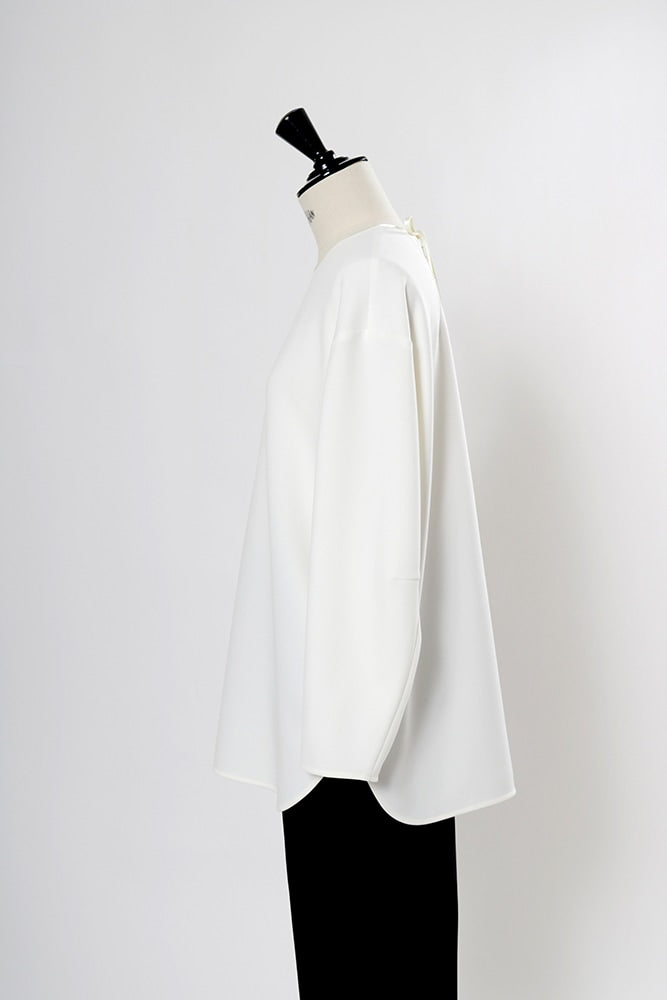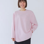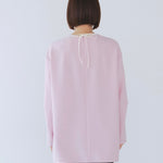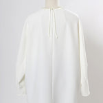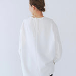 yoriで馴染みある定番のむちっとした触り心地が気持ち良いダブルクロス素材を使用。プレーンなシルエットの中にも、襟ぐりと後ろリボンにサテン生地を施し、さりげない大人の可憐さを演出。ゆったりとしたオーバーなサイズ感とゆるやかにラウンドされた前後差ある裾で飽きのこないシルエットに。着回しやすさ抜群のホワイト、上品な安心感あるネイビー、差し色にぴったりの心が明るくなるピンクと、デイリーに着やすいカラーで日々のコーディネートに取り入れたくなるアイテムです。シワにならず丸ごとお洗濯できるのもお手入れ楽ちんで嬉しいポイント。袖をたくし上げて手首を見せるスタイリングで抜け感がでてバランスが取りやすくおすすめです。