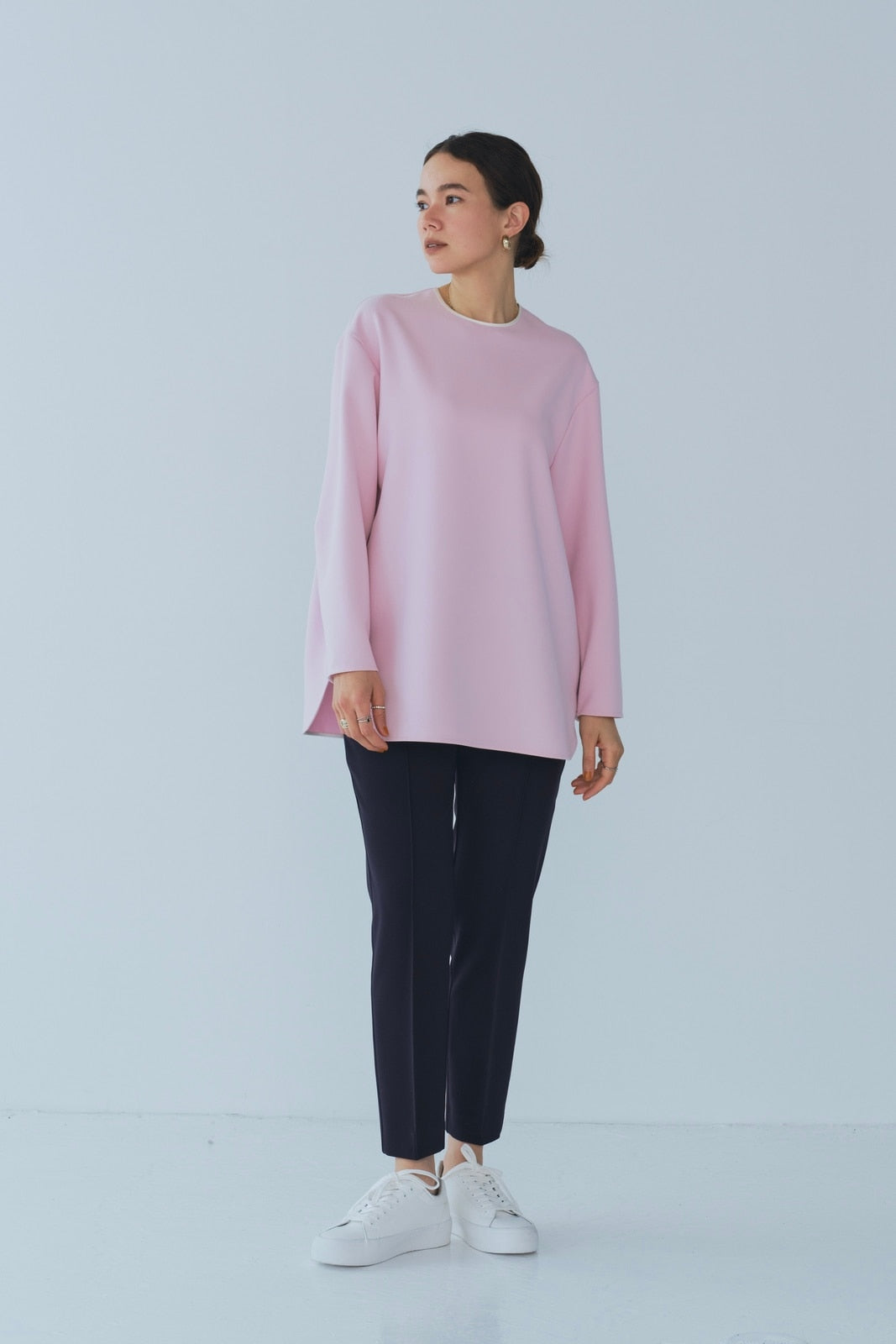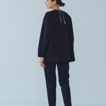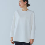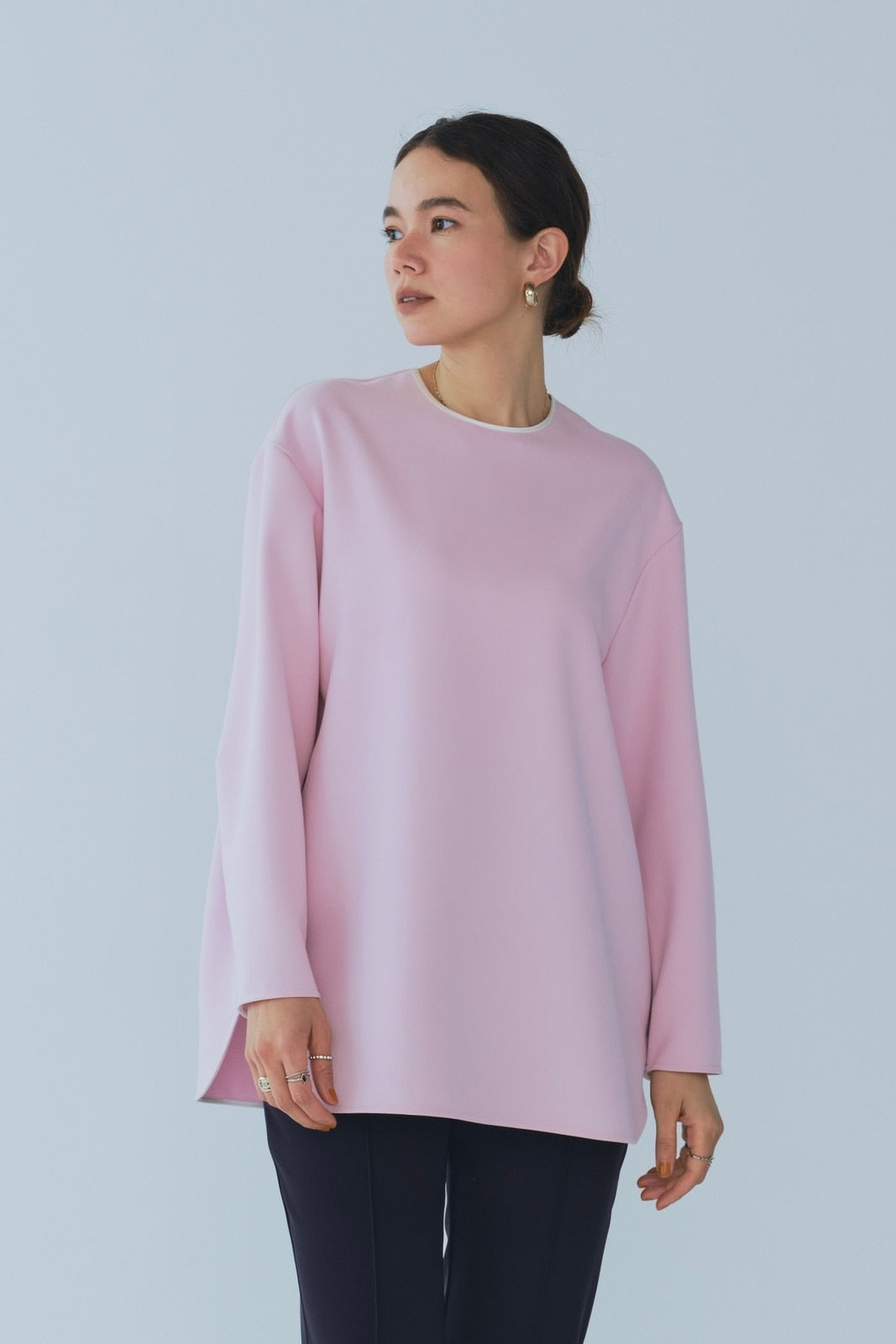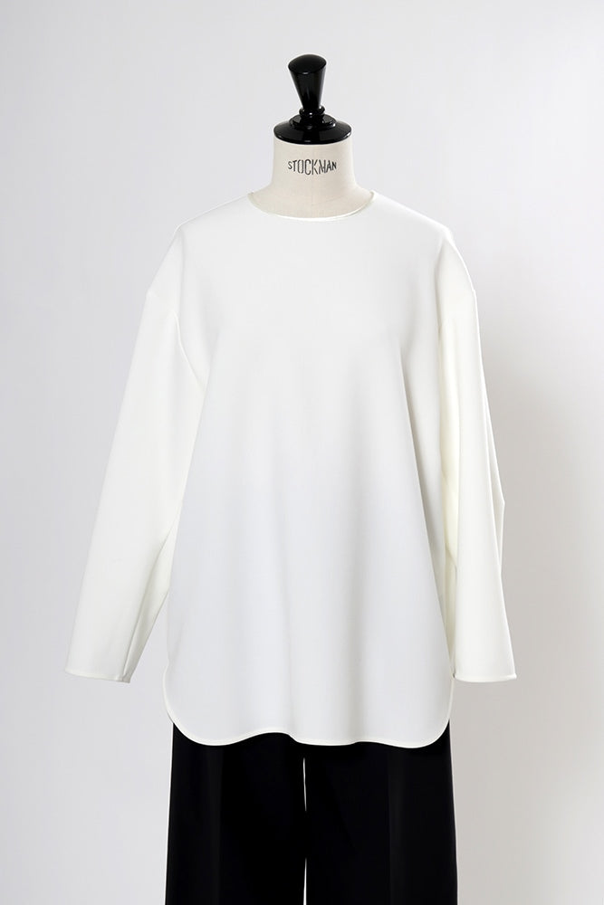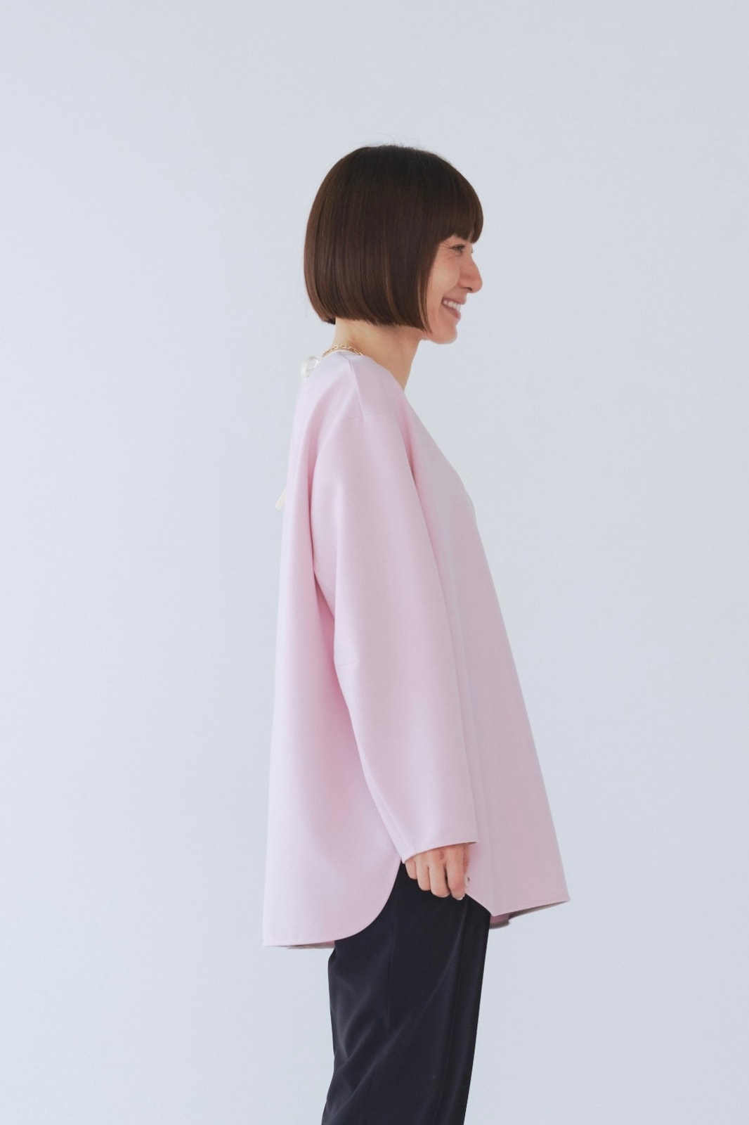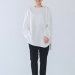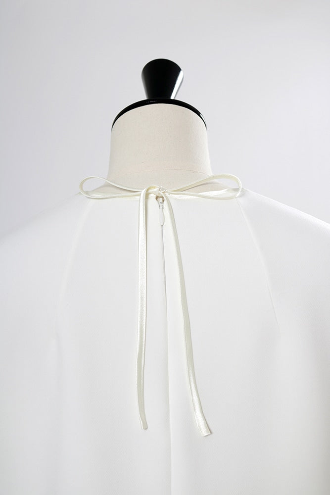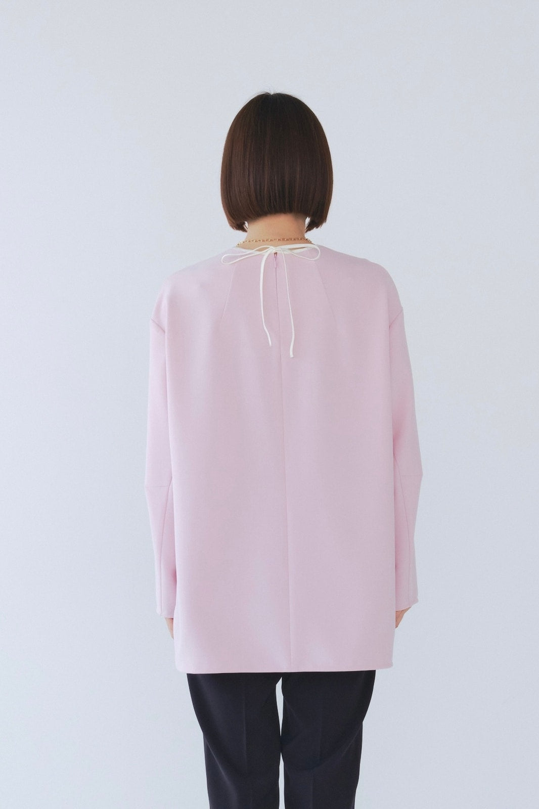 yoriで馴染みある定番のむちっとした触り心地が気持ち良いダブルクロス素材を使用。プレーンなシルエットの中にも、襟ぐりと後ろリボンにサテン生地を施し、さりげない大人の可憐さを演出。ゆったりとしたオーバーなサイズ感とゆるやかにラウンドされた前後差ある裾で飽きのこないシルエットに。着回しやすさ抜群のホワイト、上品な安心感あるネイビー、差し色にぴったりの心が明るくなるピンクと、デイリーに着やすいカラーで日々のコーディネートに取り入れたくなるアイテムです。シワにならず丸ごとお洗濯できるのもお手入れ楽ちんで嬉しいポイント。袖をたくし上げて手首を見せるスタイリングで抜け感がでてバランスが取りやすくおすすめです。
