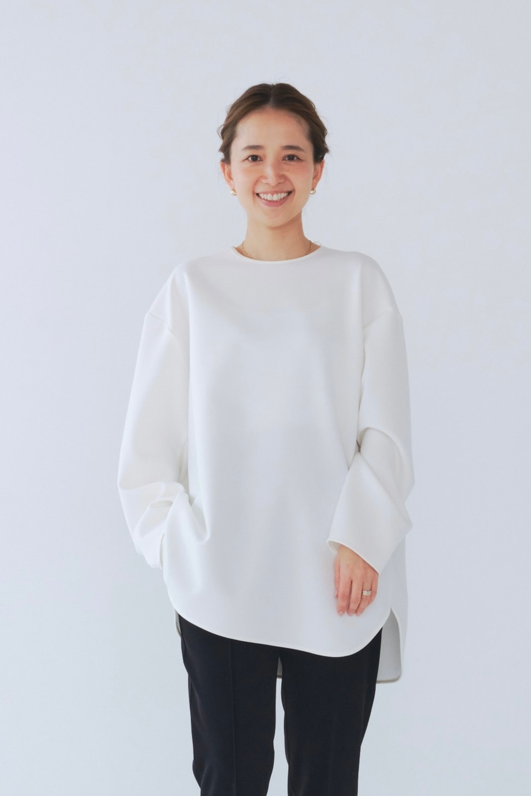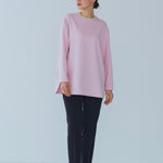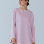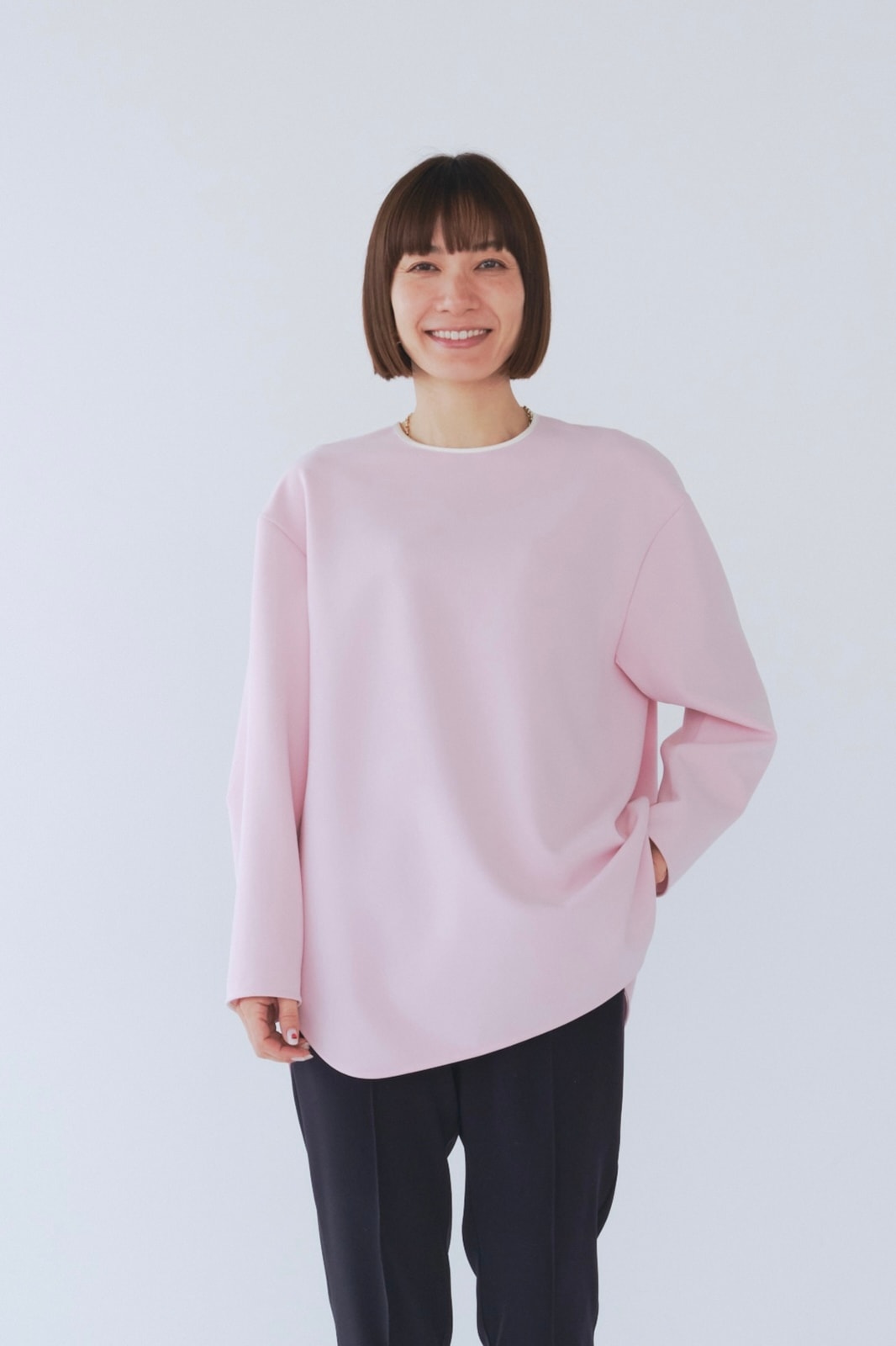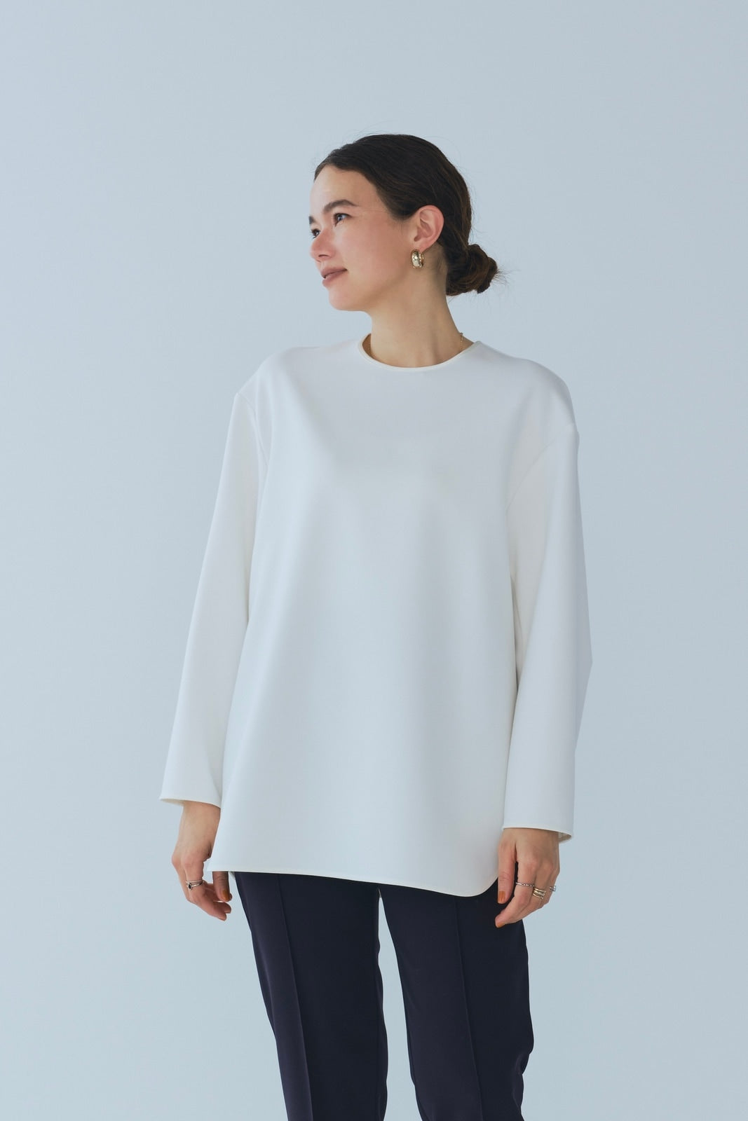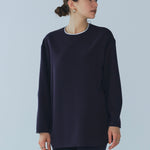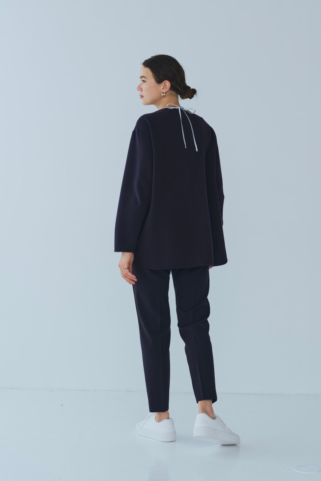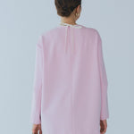 yoriで馴染みある定番のむちっとした触り心地が気持ち良いダブルクロス素材を使用。プレーンなシルエットの中にも、襟ぐりと後ろリボンにサテン生地を施し、さりげない大人の可憐さを演出。ゆったりとしたオーバーなサイズ感とゆるやかにラウンドされた前後差ある裾で飽きのこないシルエットに。着回しやすさ抜群のホワイト、上品な安心感あるネイビー、差し色にぴったりの心が明るくなるピンクと、デイリーに着やすいカラーで日々のコーディネートに取り入れたくなるアイテムです。シワにならず丸ごとお洗濯できるのもお手入れ楽ちんで嬉しいポイント。袖をたくし上げて手首を見せるスタイリングで抜け感がでてバランスが取りやすくおすすめです。
