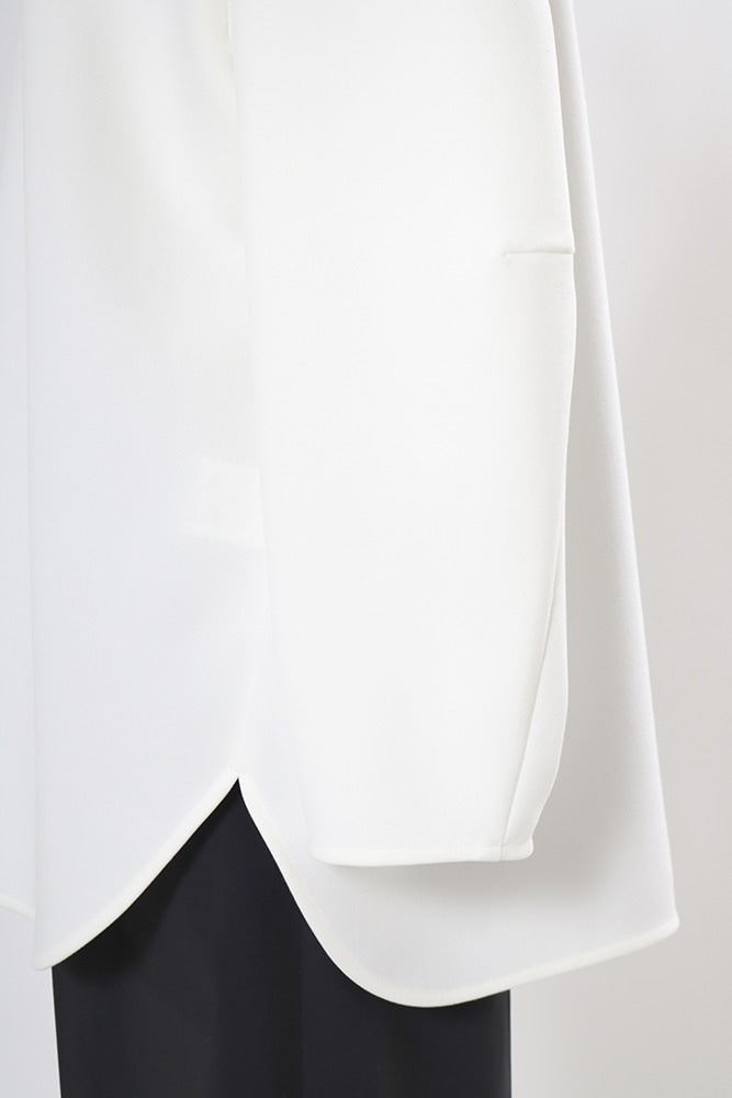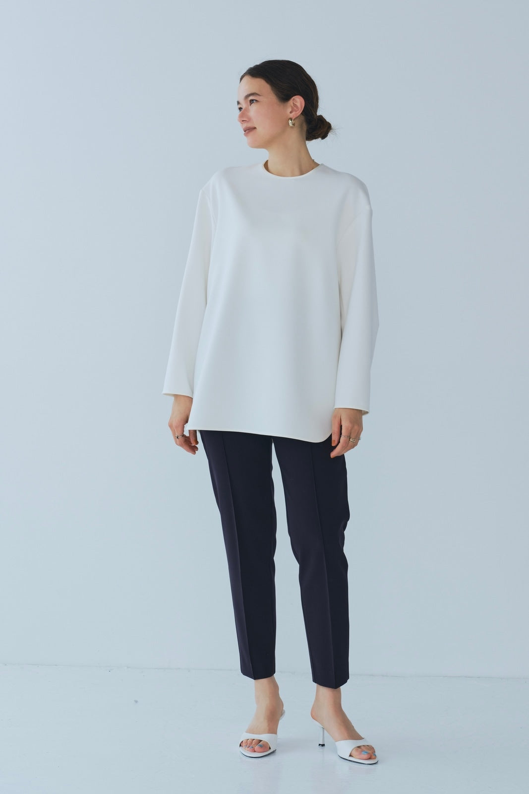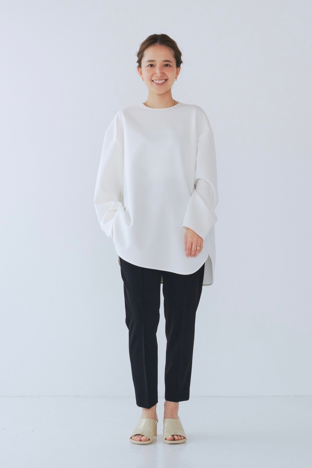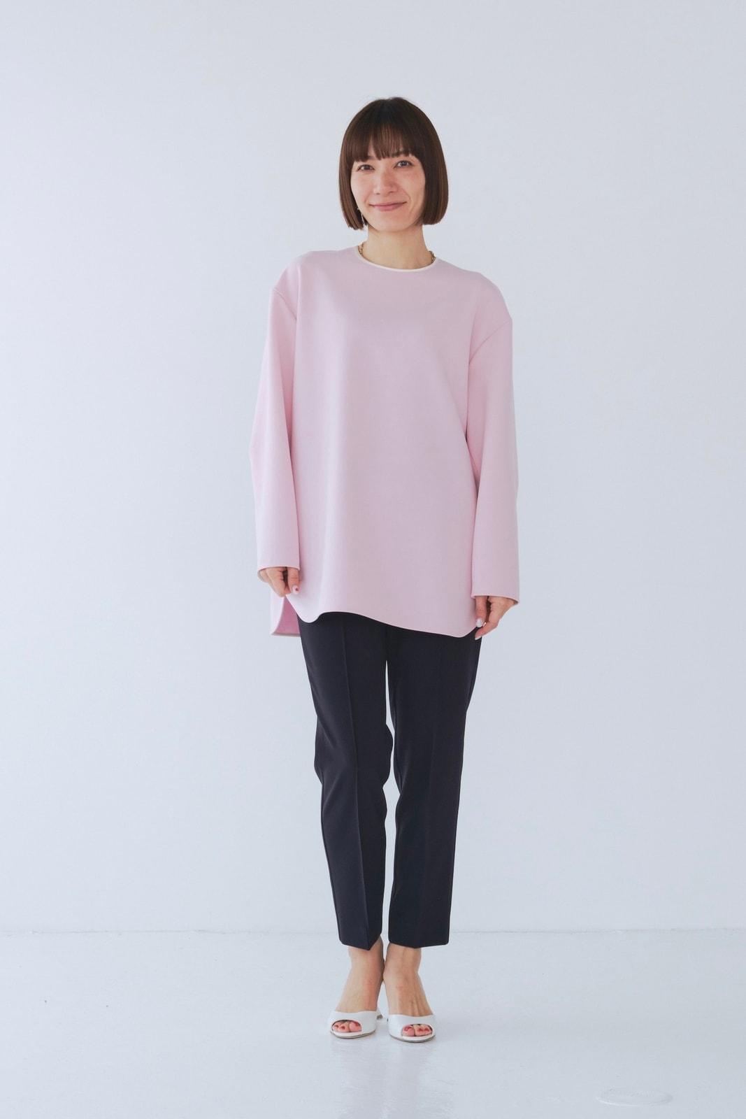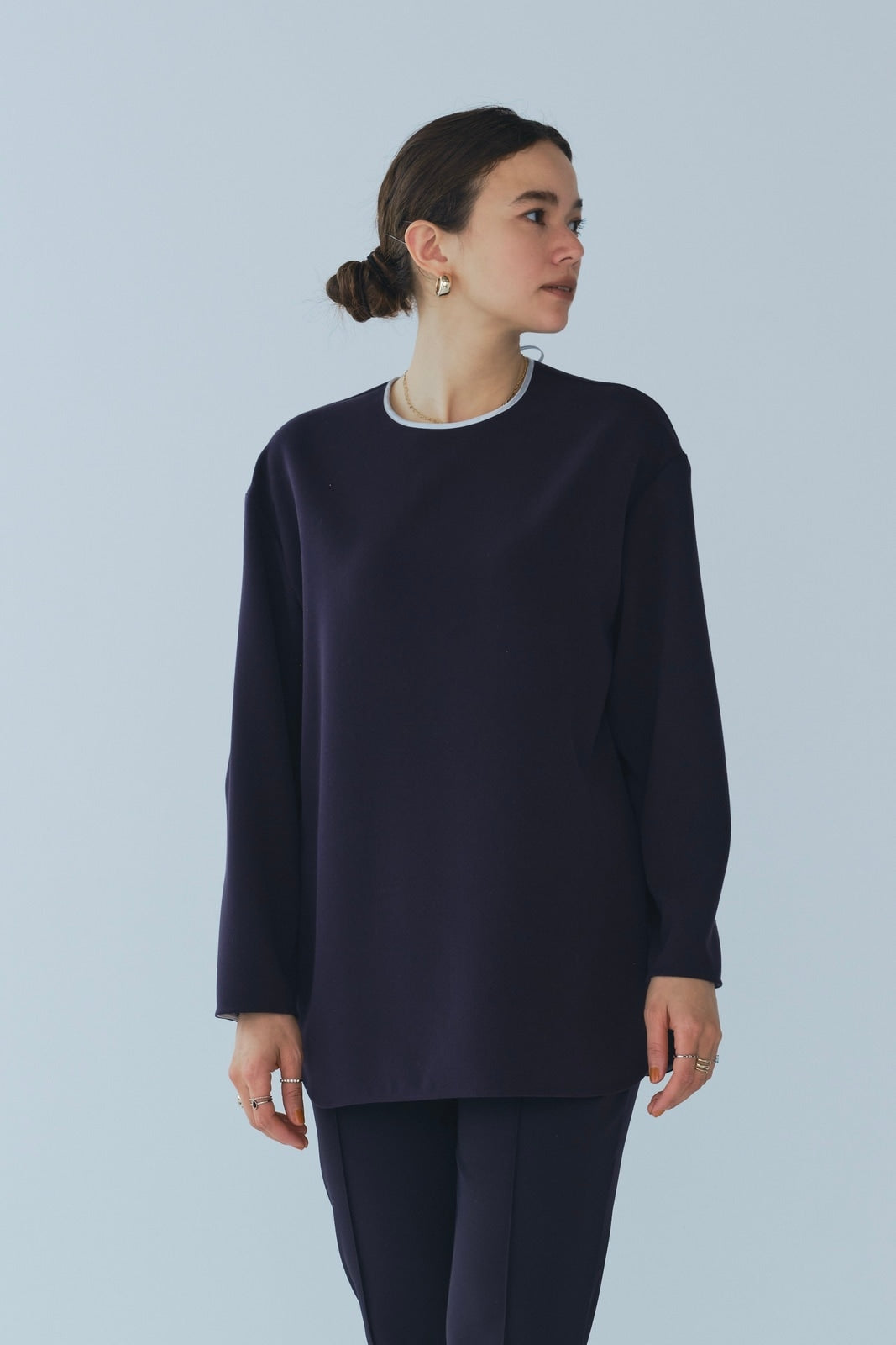 yoriで馴染みある定番のむちっとした触り心地が気持ち良いダブルクロス素材を使用。プレーンなシルエットの中にも、襟ぐりと後ろリボンにサテン生地を施し、さりげない大人の可憐さを演出。ゆったりとしたオーバーなサイズ感とゆるやかにラウンドされた前後差ある裾で飽きのこないシルエットに。着回しやすさ抜群のホワイト、上品な安心感あるネイビー、差し色にぴったりの心が明るくなるピンクと、デイリーに着やすいカラーで日々のコーディネートに取り入れたくなるアイテムです。シワにならず丸ごとお洗濯できるのもお手入れ楽ちんで嬉しいポイント。袖をたくし上げて手首を見せるスタイリングで抜け感がでてバランスが取りやすくおすすめです。