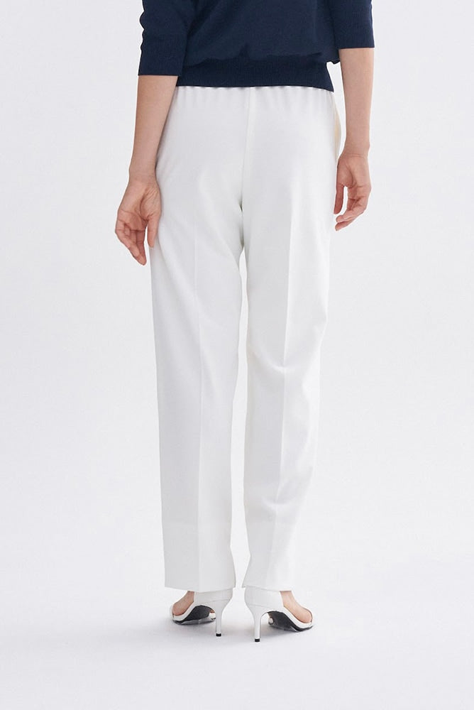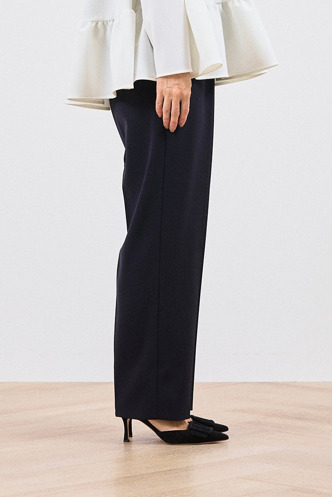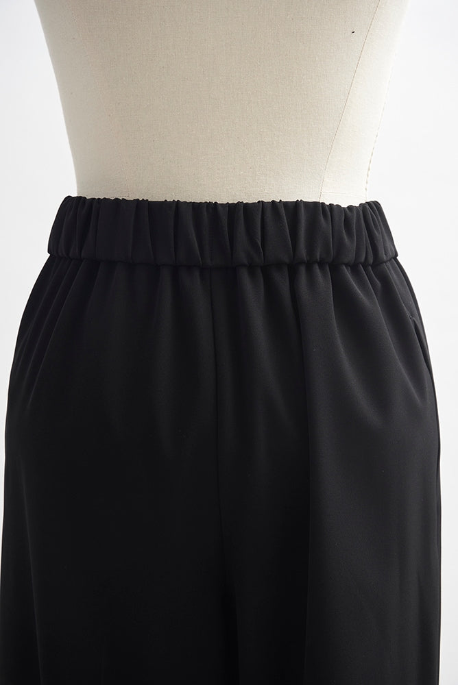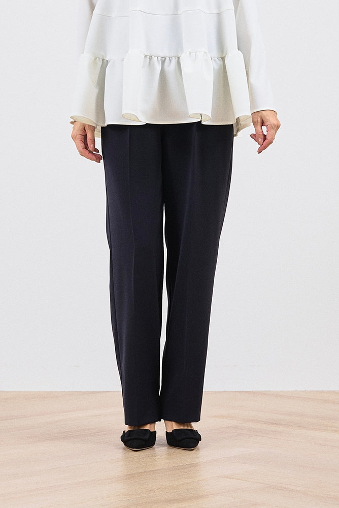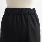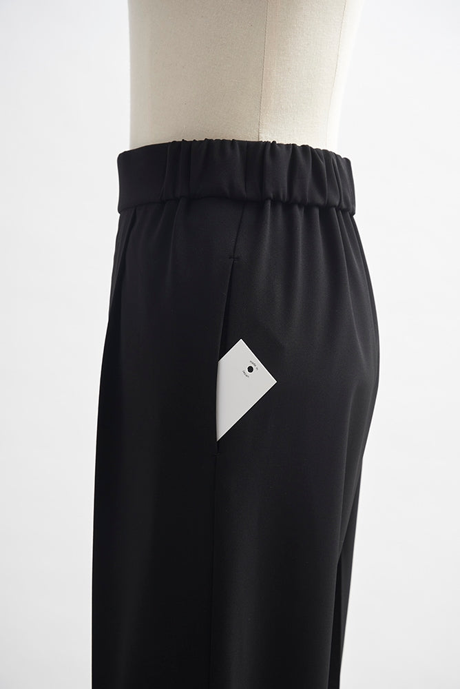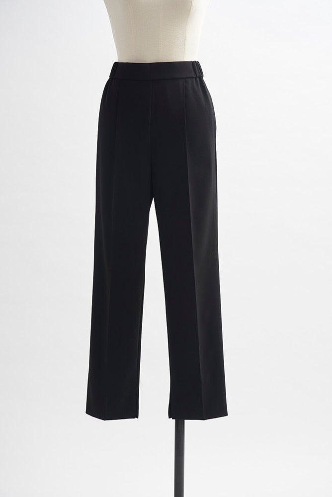 きちんと感の中にもほど良いリラックス感のある一着です。セレモニーとして人気の柔らかダブルクロス素材を使用しています。程よいハリ感とストレッチ性が心地よく、ボディラインを拾わずストンとした落ち感のある生地。素材のしなやかな風合いが女性らしい印象で、どんなトップスともバランス良く合わせられる雰囲気もポイント。ウエストタックからつながるセンタープレスが裾に向かってすっきり見えるシルエット。脇から後ろはウエストゴムのイージー仕様なので、履き心地快適です。広めウエストのつくりがしっかりしているのでブラウスなどインしやすいのも特徴です。