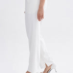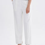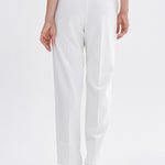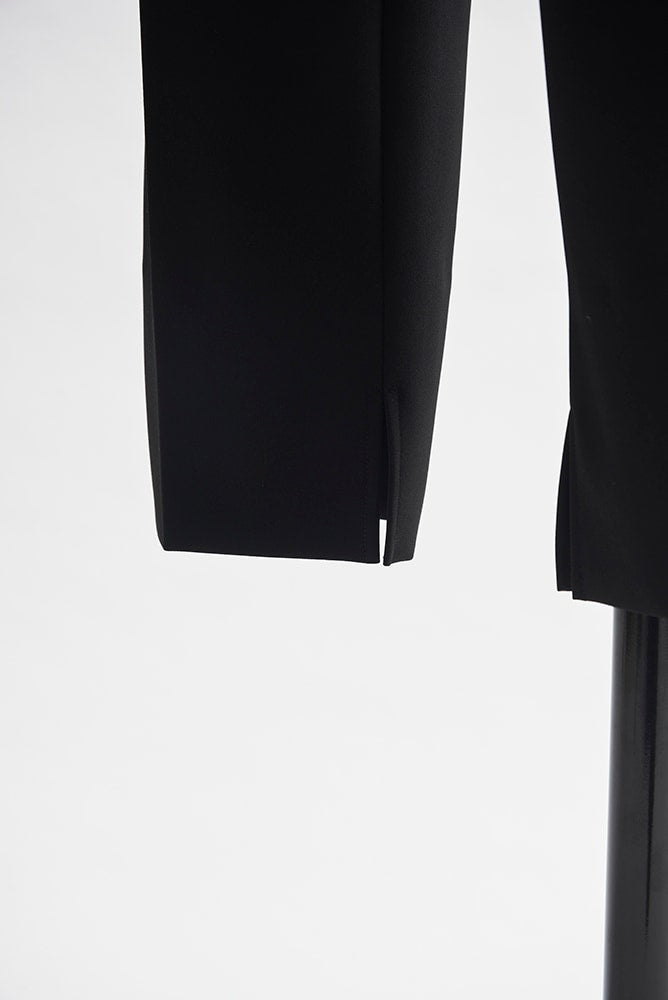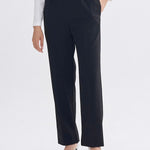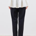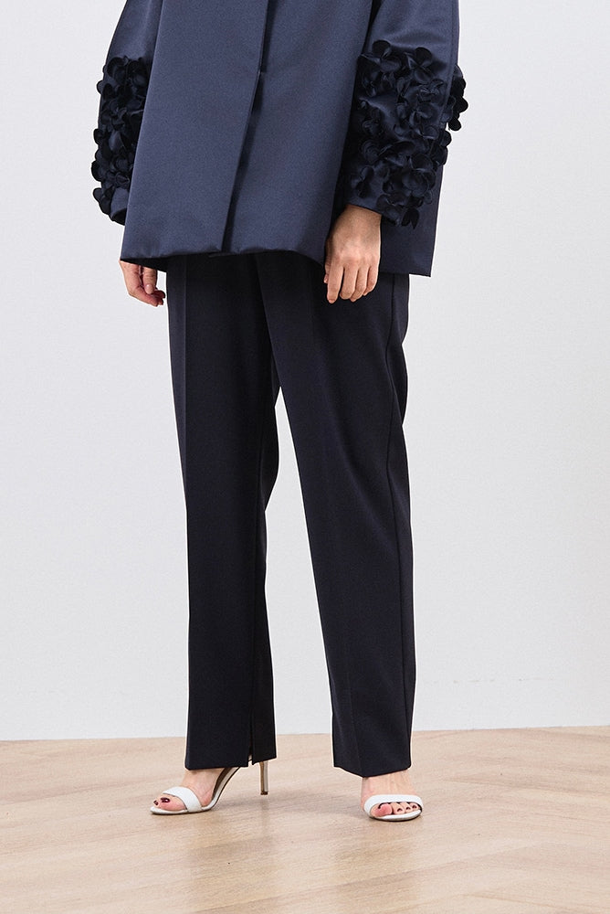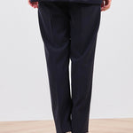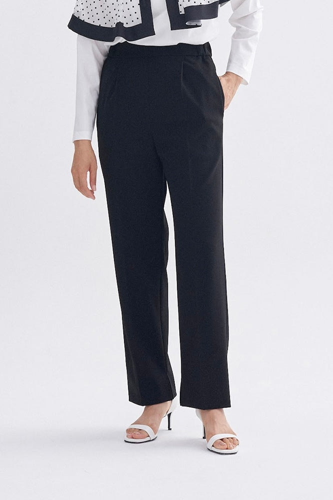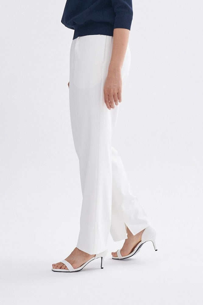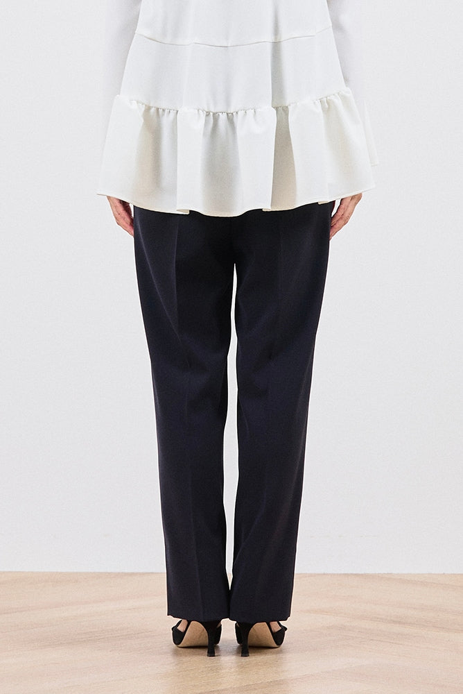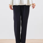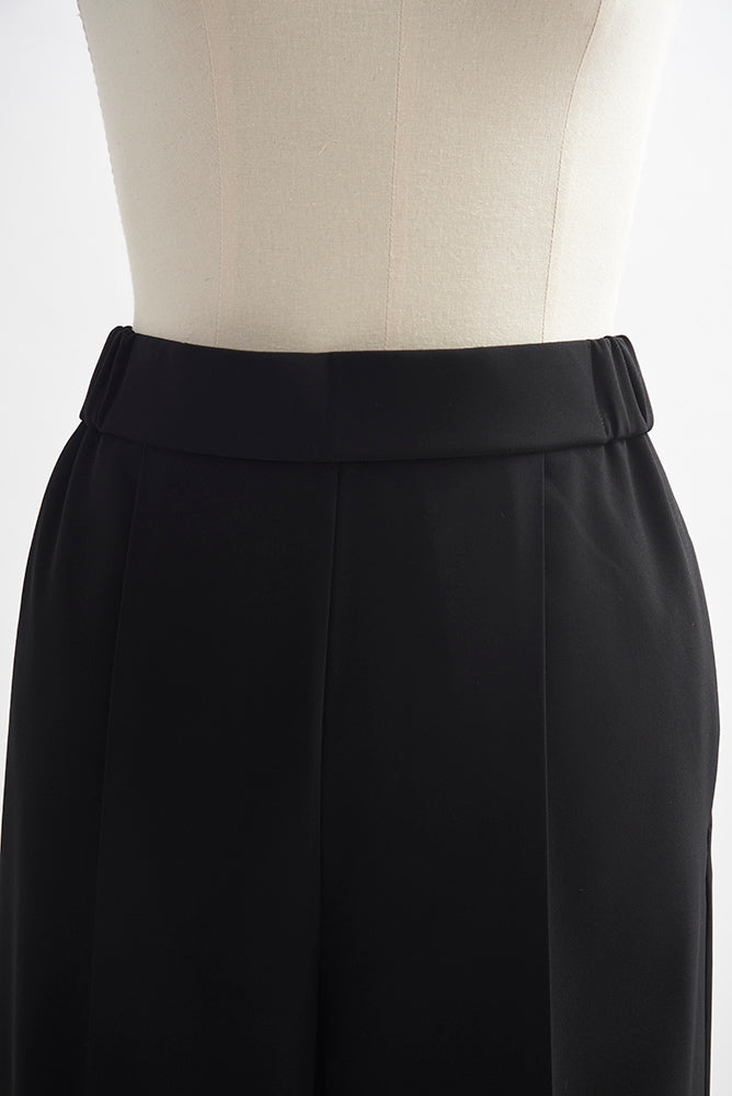 きちんと感の中にもほど良いリラックス感のある一着です。セレモニーとして人気の柔らかダブルクロス素材を使用しています。程よいハリ感とストレッチ性が心地よく、ボディラインを拾わずストンとした落ち感のある生地。素材のしなやかな風合いが女性らしい印象で、どんなトップスともバランス良く合わせられる雰囲気もポイント。ウエストタックからつながるセンタープレスが裾に向かってすっきり見えるシルエット。脇から後ろはウエストゴムのイージー仕様なので、履き心地快適です。広めウエストのつくりがしっかりしているのでブラウスなどインしやすいのも特徴です。